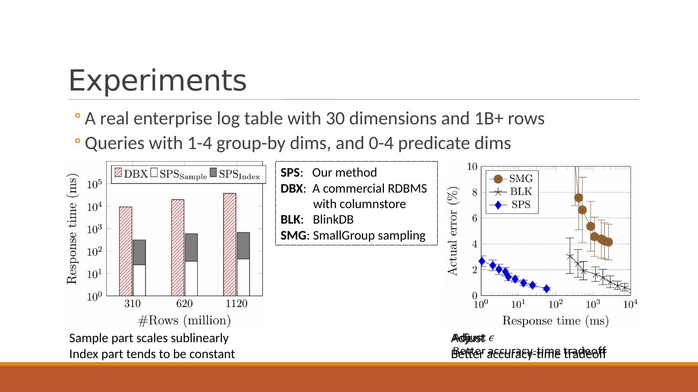 25 .Experiments A real enterprise log table with 30 dimensions and 1B+ rows Queries with 1-4 group-by dims, and 0-4 predicate dims SPS : Our method DBX : A commercial RDBMS with columnstore BLK : BlinkDB SMG : SmallGroup sampling Sample part scales sublinearly Index part tends to be constant Adjust Better accuracy-time tradeoff