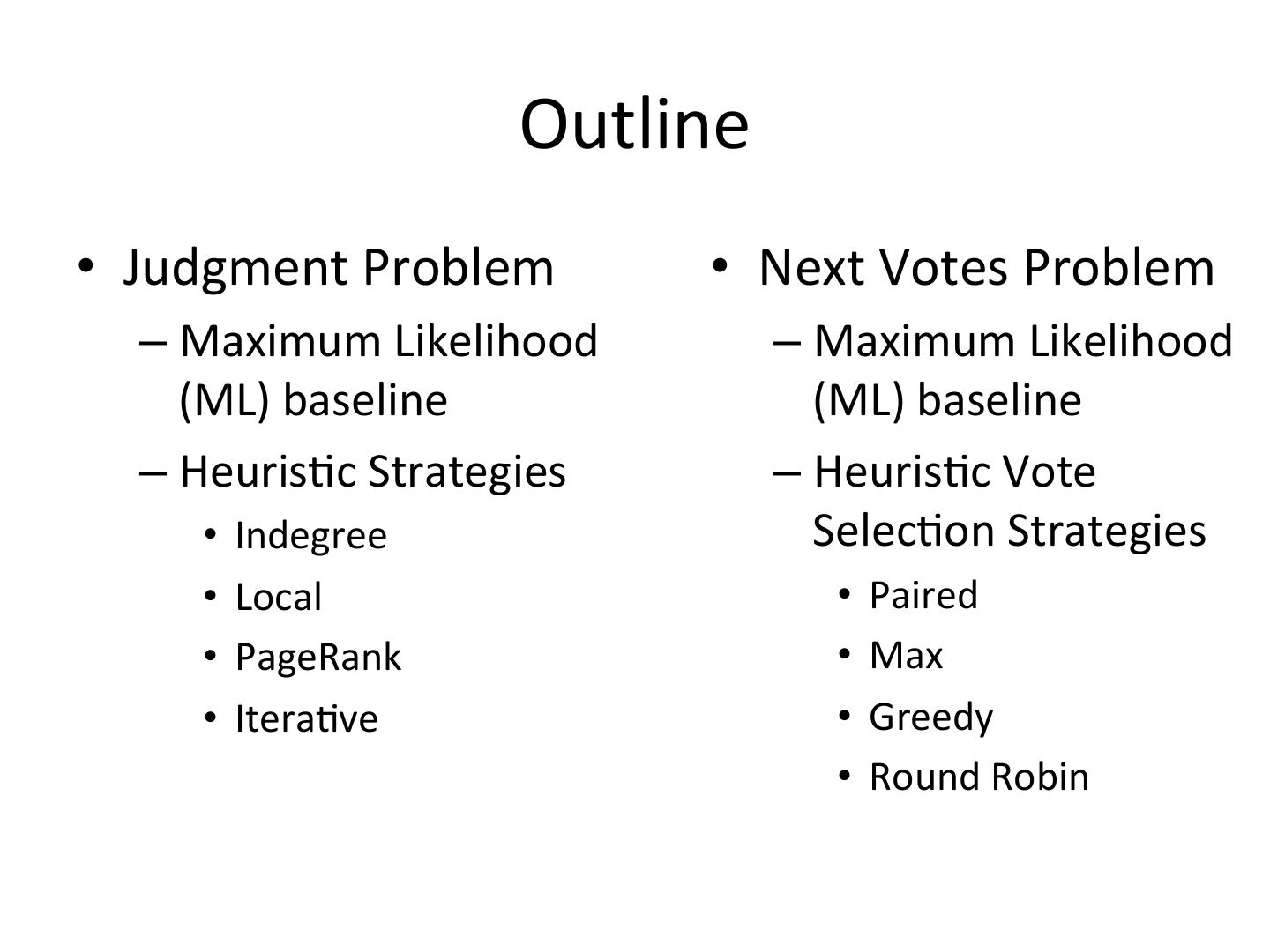 6 . Outline • Judgment Problem • Next Votes Problem – Maximum Likelihood – Maximum Likelihood (ML) baseline (ML) baseline – Heuris=c Strategies – Heuris=c Vote • Indegree Selec=on Strategies • Local • Paired • PageRank • Max • Itera=ve • Greedy • Round Robin
