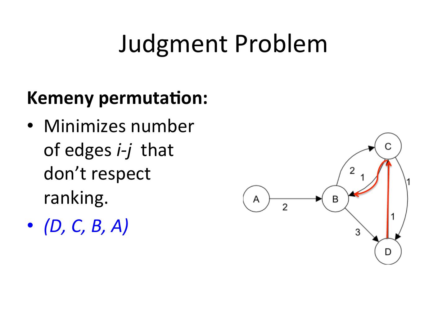 9 . Judgment Problem Kemeny permuta-on: • Minimizes number of edges i-j that don’t respect ranking. • (D, C, B, A)