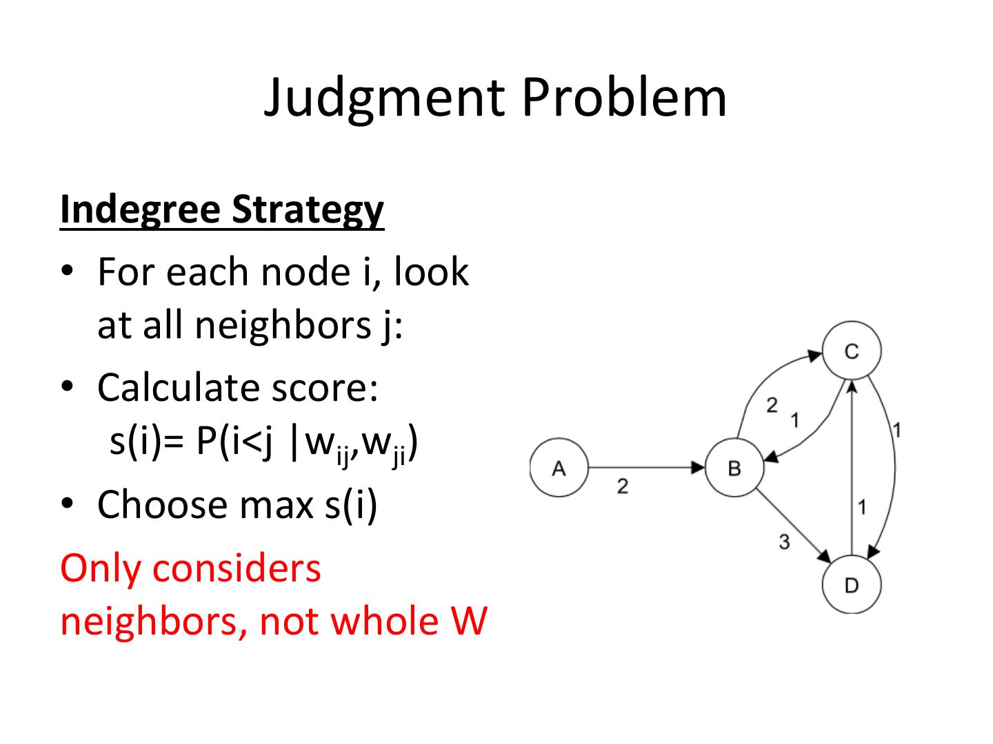 10 . Judgment Problem Indegree Strategy • For each node i, look at all neighbors j: • Calculate score: s(i)= P(i<j |wij,wji) • Choose max s(i) Only considers neighbors, not whole W