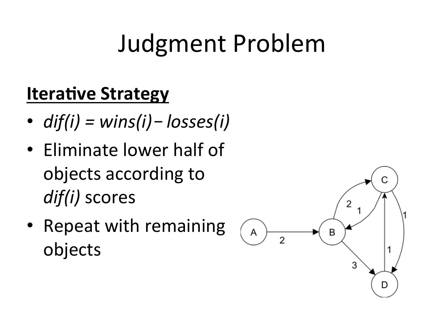 13 . Judgment Problem Itera-ve Strategy • dif(i) = wins(i)– losses(i) • Eliminate lower half of objects according to dif(i) scores • Repeat with remaining objects