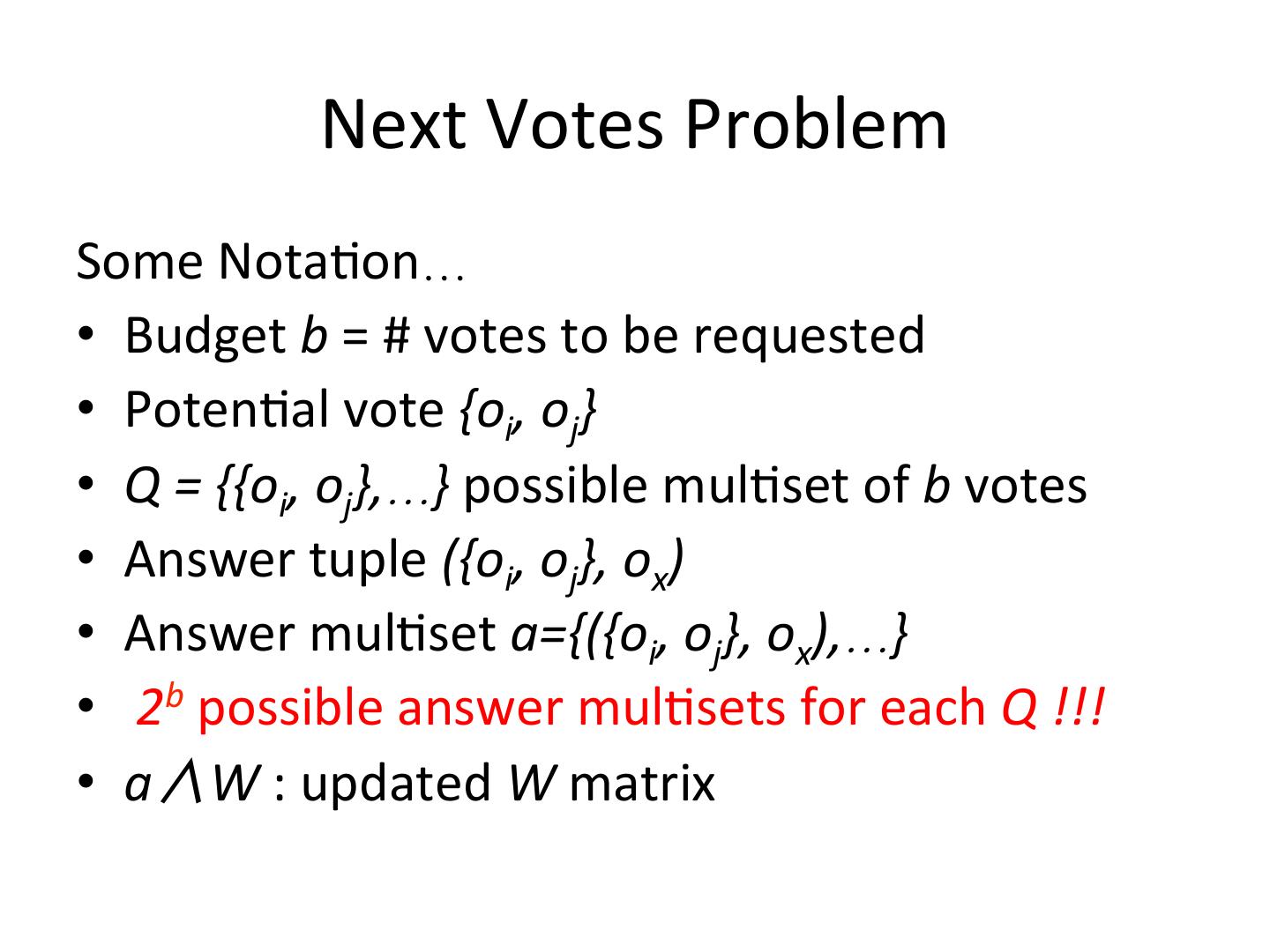 17 . Next Votes Problem Some Nota=on… • Budget b = # votes to be requested • Poten=al vote {oi, oj} • Q = {{oi, oj},…} possible mul=set of b votes • Answer tuple ({oi, oj}, ox) • Answer mul=set a={({oi, oj}, ox),…} • 2b possible answer mul=sets for each Q !!! • a∧W : updated W matrix