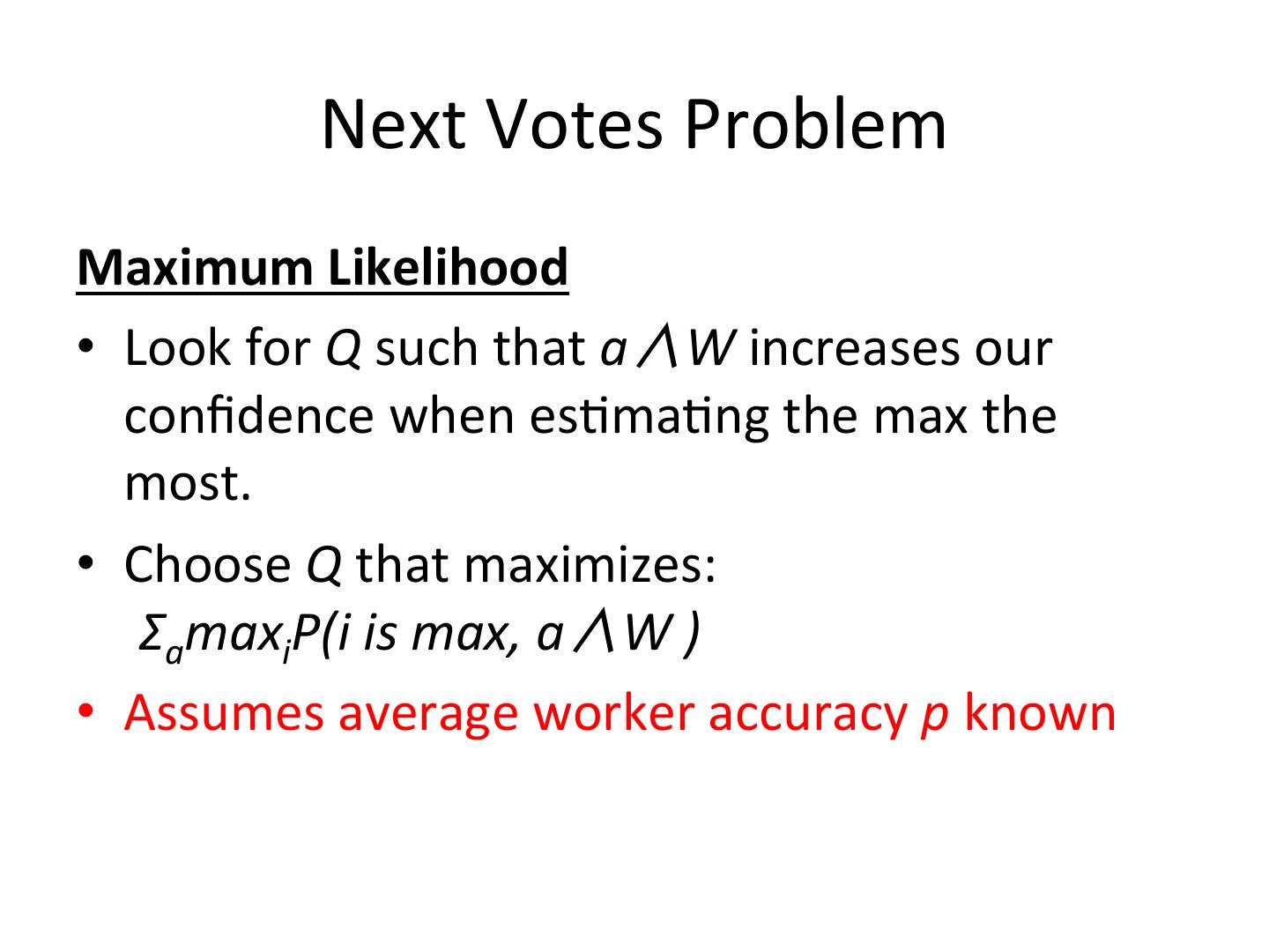 18 . Next Votes Problem Maximum Likelihood • Look for Q such that a∧W increases our confidence when es=ma=ng the max the most. • Choose Q that maximizes: ΣamaxiP(i is max, a∧W ) • Assumes average worker accuracy p known