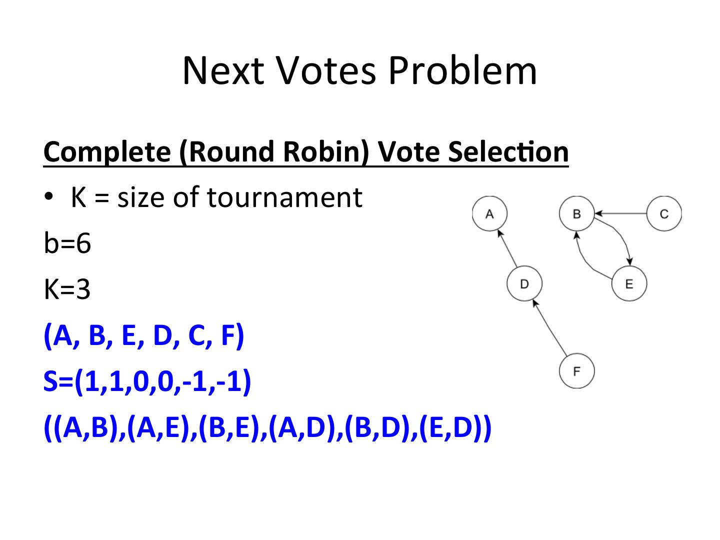 22 . Next Votes Problem Complete (Round Robin) Vote Selec-on • K = size of tournament b=6 K=3 (A, B, E, D, C, F) S=(1,1,0,0,-1,-1) ((A,B),(A,E),(B,E),(A,D),(B,D),(E,D))