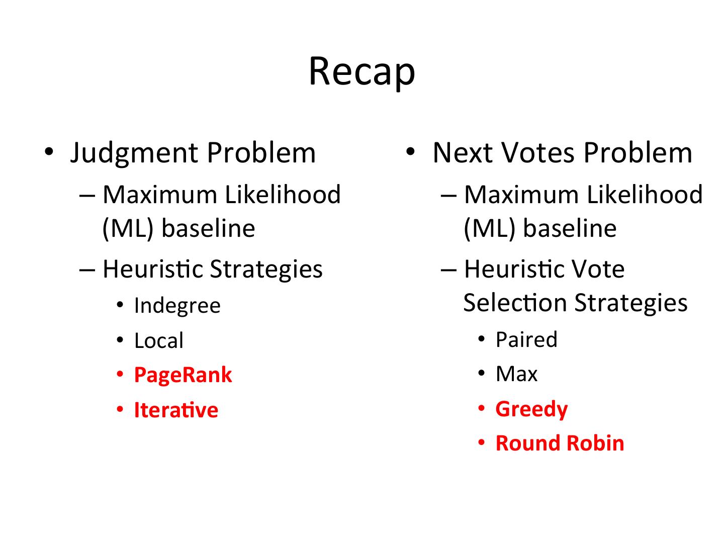 25 . Recap • Judgment Problem • Next Votes Problem – Maximum Likelihood – Maximum Likelihood (ML) baseline (ML) baseline – Heuris=c Strategies – Heuris=c Vote • Indegree Selec=on Strategies • Local • Paired • PageRank • Max • Itera-ve • Greedy • Round Robin