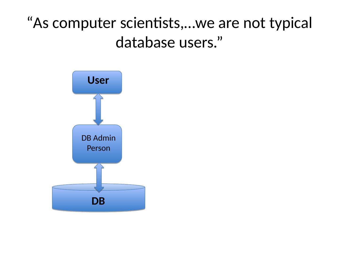 2 .“As computer scientists, … we are not typical database users.” DB DB Admin Person User