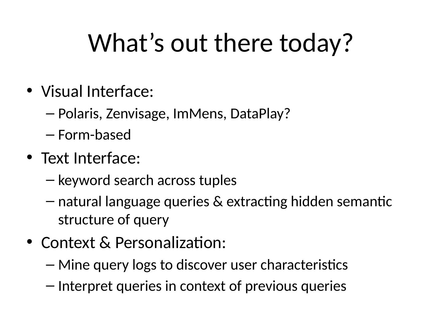 6 .What’s out there today? Visual Interface: Polaris, Zenvisage, ImMens, DataPlay? Form-based Text Interface: keyword search across tuples natural language queries & extracting hidden semantic structure of query Context & Personalization: Mine query logs to discover user characteristics Interpret queries in context of previous queries