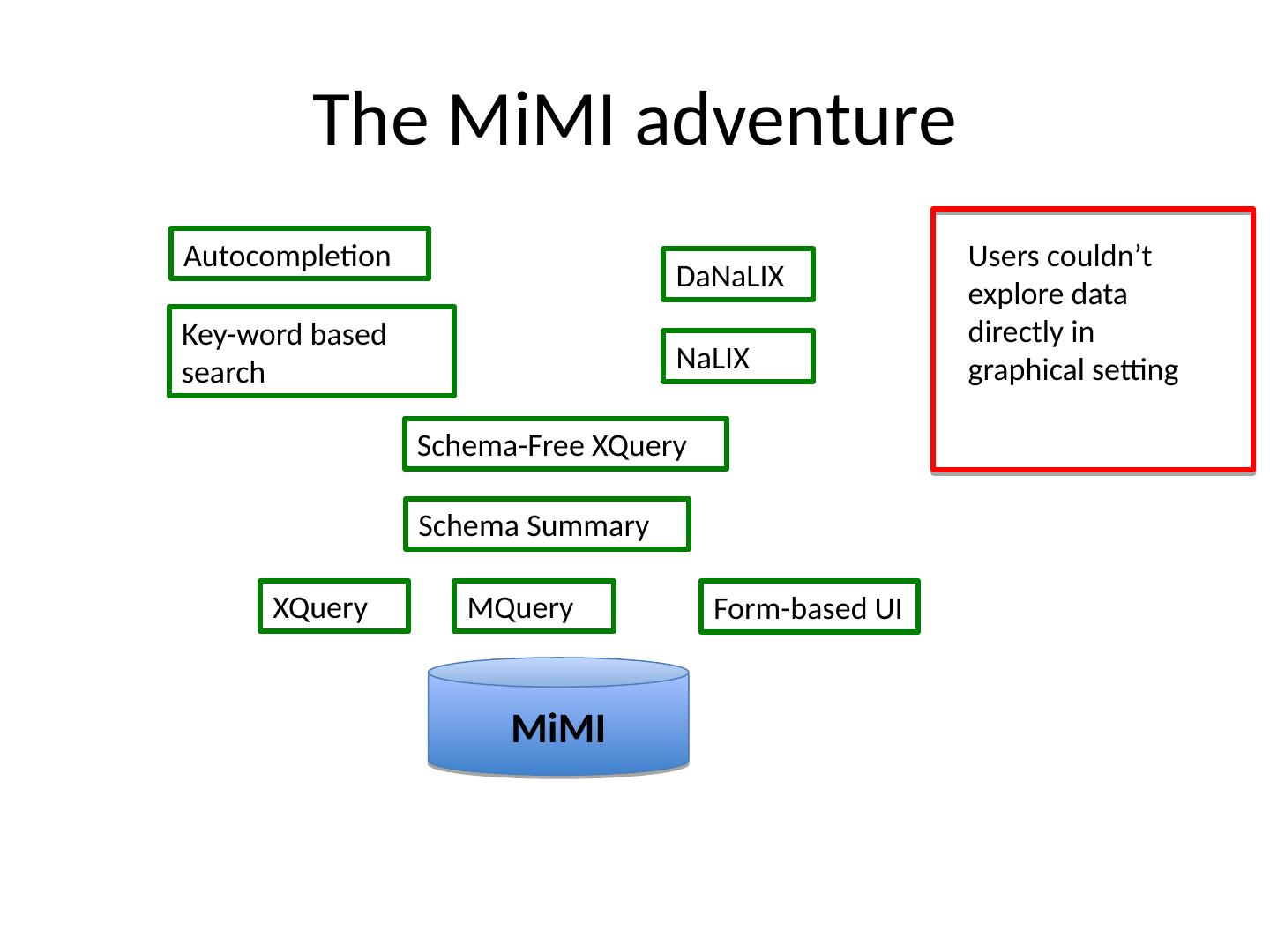 17 .The MiMI adventure MiMI XQuery Form-based UI MQuery Schema Summary Schema-Free XQuery Key-word based search Autocompletion NaLIX DaNaLIX Users couldn’t explore data directly in graphical setting