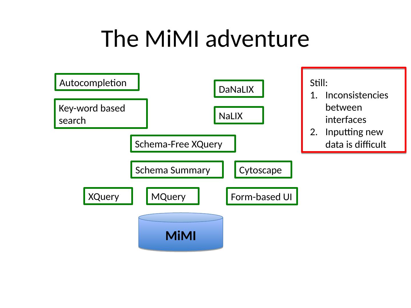 18 .The MiMI adventure MiMI XQuery Form-based UI MQuery Schema Summary Schema-Free XQuery Key-word based search Autocompletion NaLIX DaNaLIX Cytoscape Still: Inconsistencies between interfaces Inputting new data is difficult