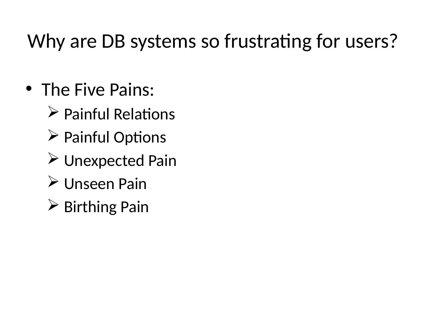 19 .Why are DB systems so frustrating for users? The Five P ains: Painful Relations Painful Options Unexpected Pain Unseen Pain Birthing Pain