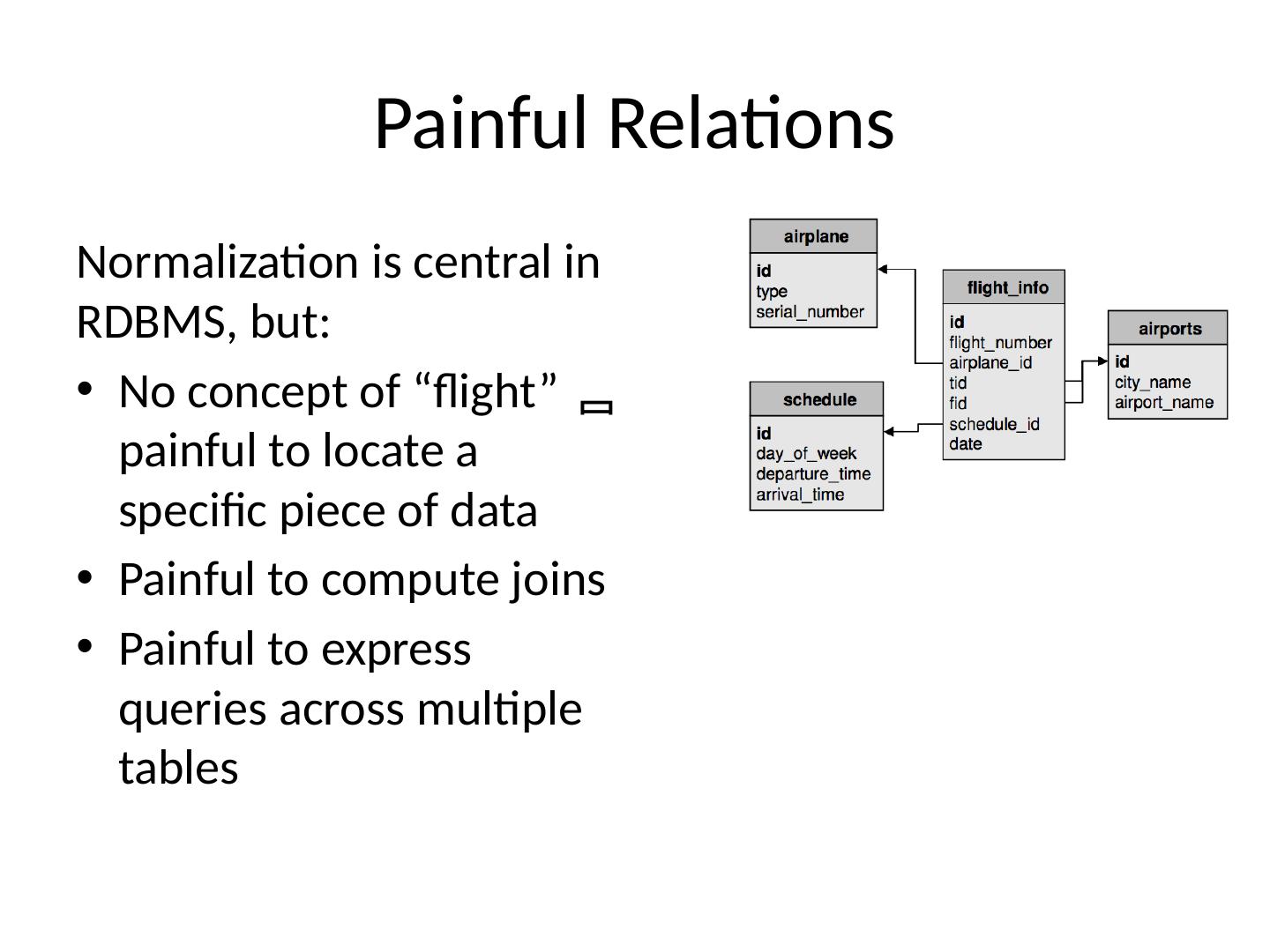 20 .Painful Relations Normalization is central in RDBMS, but: N o concept of “flight” painful to locate a specific piece of data Painful to compute joins Painful to express queries across multiple tables