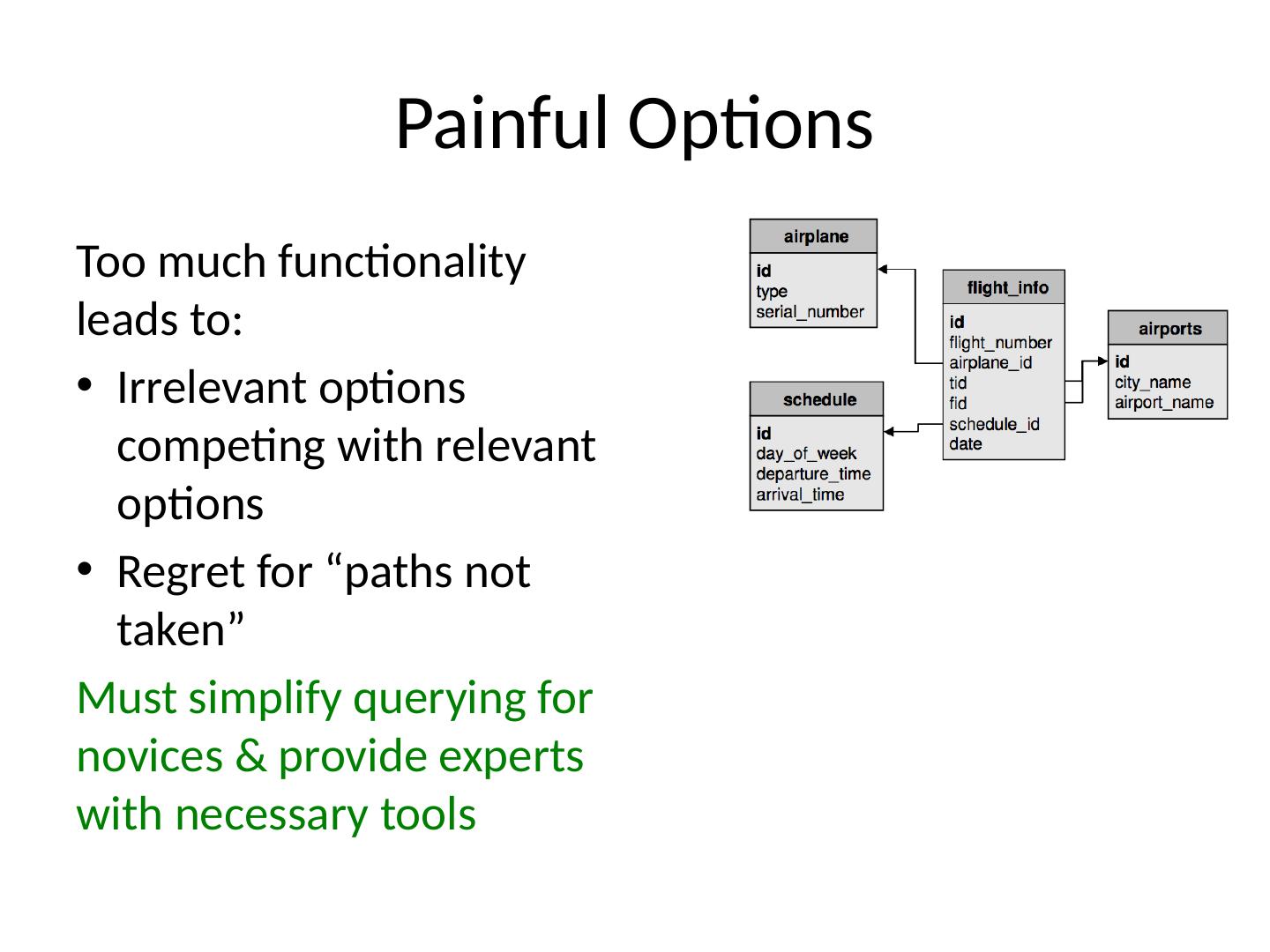 21 .Painful Options Too much functionality leads to: Irrelevant options competing with relevant options Regret for “paths not taken” Must simplify querying for novices & provide experts with necessary tools