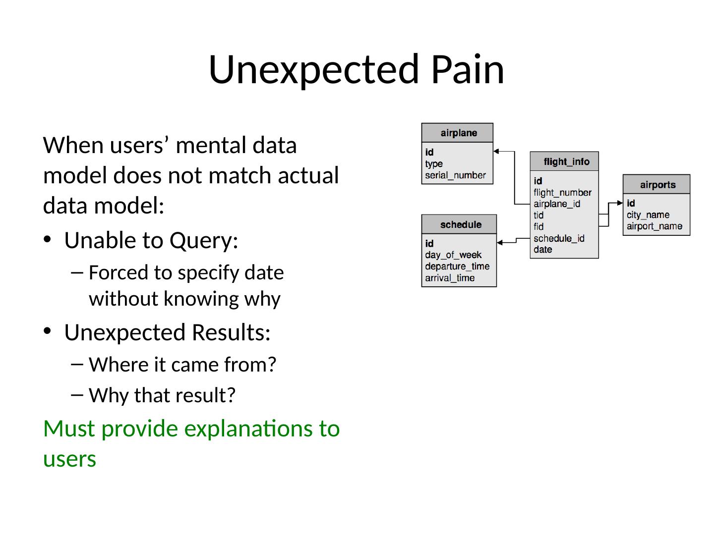 22 .Unexpected Pain When users’ mental data model does not match actual data model: Unable to Query: Forced to specify date without knowing why Unexpected Results: Where it came from? Why that result? Must provide explanations to users