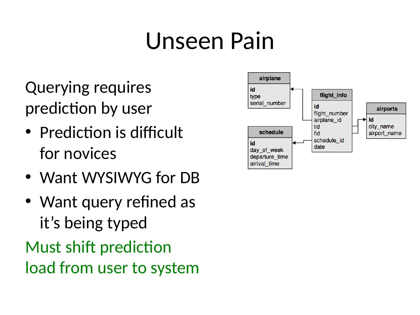 23 .Unseen Pain Querying requires prediction by user Prediction is difficult for novices Want WYSIWYG for DB Want query refined as it’s being typed Must shift prediction load from user to system