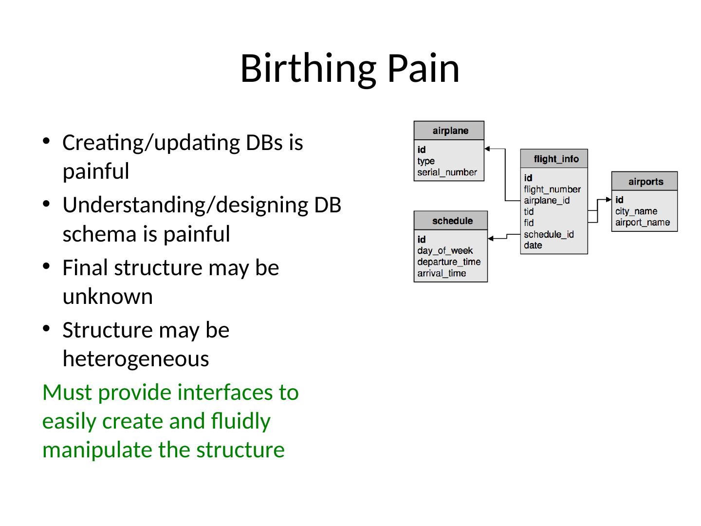 24 .Birthing Pain Creating/updating DBs is painful Understanding/designing DB schema is painful Final structure may be unknown Structure may be heterogeneous Must provide interfaces to easily create and fluidly manipulate the structure