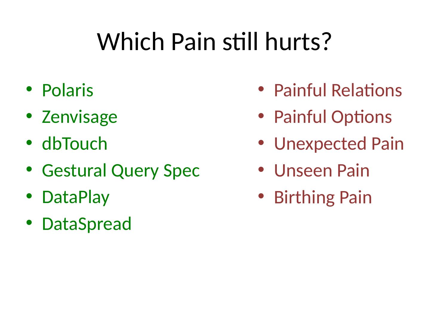 25 .Which Pain still hurts? Polaris Zenvisage dbTouch Gestural Query Spec DataPlay DataSpread Painful Relations Painful Options Unexpected Pain Unseen Pain Birthing Pain