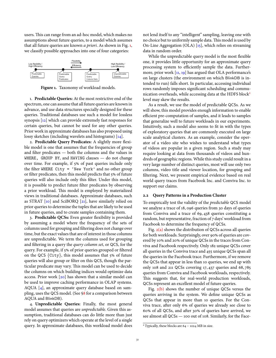 3 .users. This can range from an ad-hoc model, which makes no not lend itself to any “intelligent” sampling, leaving one with assumptions about future queries, to a model which assumes no choice but to uniformly sample data. This model is used by that all future queries are known a priori. As shown in Fig. 1, On-Line Aggregation (OLA) [15], which relies on streaming we classify possible approaches into one of four categories: data in random order. While the unpredictable query model is the most flexible Low flexibility / Flexibility High flexibility / one, it provides little opportunity for an approximate query Efficiency High Efficiency Low Efficiency processing system to efficiently sample the data. Further- Predictable Predictable Predictable Unpredictable more, prior work [11, 19] has argued that OLA performance’s Queries Query Predicates Query Column Sets Queries on large clusters (the environment on which BlinkDB is in- tended to run) falls short. In particular, accessing individual Figure 1. Taxonomy of workload models. rows randomly imposes significant scheduling and commu- nication overheads, while accessing data at the HDFS block2 1. Predictable Queries: At the most restrictive end of the level may skew the results. spectrum, one can assume that all future queries are known in As a result, we use the model of predictable QCSs. As we advance, and use data structures specially designed for these will show, this model provides enough information to enable queries. Traditional databases use such a model for lossless efficient pre-computation of samples, and it leads to samples synopsis [12] which can provide extremely fast responses for that generalize well to future workloads in our experiments. certain queries, but cannot be used for any other queries. Intuitively, such a model also seems to fit in with the types Prior work in approximate databases has also proposed using of exploratory queries that are commonly executed on large lossy sketches (including wavelets and histograms) [14]. scale analytical clusters. As an example, consider the oper- 2. Predictable Query Predicates: A slightly more flexi- ator of a video site who wishes to understand what types ble model is one that assumes that the frequencies of group of videos are popular in a given region. Such a study may and filter predicates — both the columns and the values in require looking at data from thousands of videos and hun- WHERE, GROUP BY, and HAVING clauses — do not change dreds of geographic regions. While this study could result in a over time. For example, if 5% of past queries include only very large number of distinct queries, most will use only two the filter WHERE City = ‘New York’ and no other group columns, video title and viewer location, for grouping and or filter predicates, then this model predicts that 5% of future filtering. Next, we present empirical evidence based on real queries will also include only this filter. Under this model, world query traces from Facebook Inc. and Conviva Inc. to it is possible to predict future filter predicates by observing support our claims. a prior workload. This model is employed by materialized views in traditional databases. Approximate databases, such 2.2 Query Patterns in a Production Cluster as STRAT [10] and SciBORQ [21], have similarly relied on To empirically test the validity of the predictable QCS model prior queries to determine the tuples that are likely to be used we analyze a trace of 18, 096 queries from 30 days of queries in future queries, and to create samples containing them. from Conviva and a trace of 69, 438 queries constituting a 3. Predictable QCSs: Even greater flexibility is provided random, but representative, fraction of 7 days’ workload from by assuming a model where the frequency of the sets of Facebook to determine the frequency of QCSs. columns used for grouping and filtering does not change over Fig. 2(a) shows the distribution of QCSs across all queries time, but the exact values that are of interest in those columns for both workloads. Surprisingly, over 90% of queries are cov- are unpredictable. We term the columns used for grouping ered by 10% and 20% of unique QCSs in the traces from Con- and filtering in a query the query column set, or QCS, for the viva and Facebook respectively. Only 182 unique QCSs cover query. For example, if 5% of prior queries grouped or filtered all queries in the Conviva trace and 455 unique QCSs span all on the QCS {City}, this model assumes that 5% of future the queries in the Facebook trace. Furthermore, if we remove queries will also group or filter on this QCS, though the par- the QCSs that appear in less than 10 queries, we end up with ticular predicate may vary. This model can be used to decide only 108 and 211 QCSs covering 17, 437 queries and 68, 785 the columns on which building indices would optimize data queries from Conviva and Facebook workloads, respectively. access. Prior work [20] has shown that a similar model can This suggests that, for real-world production workloads, be used to improve caching performance in OLAP systems. QCSs represent an excellent model of future queries. AQUA [4], an approximate query database based on sam- Fig. 2(b) shows the number of unique QCSs versus the pling, uses the QCS model. (See §8 for a comparison between queries arriving in the system. We define unique QCSs as AQUA and BlinkDB). QCSs that appear in more than 10 queries. For the Con- 4. Unpredictable Queries: Finally, the most general viva trace, after only 6% of queries we already see close to model assumes that queries are unpredictable. Given this as- 60% of all QCSs, and after 30% of queries have arrived, we sumption, traditional databases can do little more than just see almost all QCSs — 100 out of 108. Similarly, for the Face- rely on query optimizers which operate at the level of a single query. In approximate databases, this workload model does 2 Typically, these blocks ar