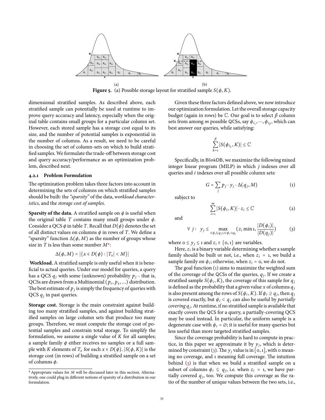 7 . K K B33 B43 B33 B43 K1 B22 B32 B42 B52 B22 B32 B42 B52 B21 B21 B1 B31 B41 B51 B6 B7 B8 B1 B31 B41 B51 B6 B7 B8 x x (a) (b) Figure 5. (a) Possible storage layout for stratified sample S(ϕ, K). dimensional stratified samples. As described above, each Given these three factors defined above, we now introduce stratified sample can potentially be used at runtime to im- our optimization formulation. Let the overall storage capacity prove query accuracy and latency, especially when the orig- budget (again in rows) be C. Our goal is to select β column inal table contains small groups for a particular column set. sets from among m possible QCSs, say ϕ i 1 , ⋯, ϕ i β , which can However, each stored sample has a storage cost equal to its best answer our queries, while satisfying: size, and the number of potential samples is exponential in the number of columns. As a result, we need to be careful β in choosing the set of column-sets on which to build strati- ∑ ∣S(ϕ i k , K)∣ ≤ C k=1 fied samples. We formulate the trade-off between storage cost and query accuracy/performance as an optimization prob- Specifically, in BlinkDB, we maximize the following mixed lem, described next. integer linear program (MILP) in which j indexes over all queries and i indexes over all possible column sets: 4.2.1 Problem Formulation The optimization problem takes three factors into account in G = ∑ p j ⋅ y j ⋅ ∆(q j , M) (1) determining the sets of columns on which stratified samples j should be built: the “sparsity” of the data, workload character- subject to istics, and the storage cost of samples. m ∑ ∣S(ϕ i , K)∣ ⋅ z i ≤ C (2) Sparsity of the data. A stratified sample on ϕ is useful when i=1 the original table T contains many small groups under ϕ. and Consider a QCS ϕ in table T. Recall that D(ϕ) denotes the set ∣D(ϕ i )∣ ∀ j ∶ yj ≤ max (z i min 1, ) (3) of all distinct values on columns ϕ in rows of T. We define a i∶ϕ i ⊆q j ∪i∶ϕ i ⊃q j ∣D(q j )∣ “sparsity” function ∆(ϕ, M) as the number of groups whose size in T is less than some number M 4 : where 0 ≤ y j ≤ 1 and z i ∈ {0, 1} are variables. Here, z i is a binary variable determining whether a sample ∆(ϕ, M) = ∣{x ∈ D(ϕ) ∶ ∣Tx ∣ < M}∣ family should be built or not, i.e., when z i = 1, we build a Workload. A stratified sample is only useful when it is bene- sample family on ϕ i ; otherwise, when z i = 0, we do not. ficial to actual queries. Under our model for queries, a query The goal function (1) aims to maximize the weighted sum has a QCS q j with some (unknown) probability p j - that is, of the coverage of the QCSs of the queries, q j . If we create a QCSs are drawn from a Multinomial (p 1 , p 2 , ...) distribution. stratified sample S(ϕ i , K), the coverage of this sample for q j The best estimate of p j is simply the frequency of queries with is defined as the probability that a given value x of columns q j QCS q j in past queries. is also present among the rows of S(ϕ i , K). If ϕ i ⊇ q j , then q j is covered exactly, but ϕ i ⊂ q j can also be useful by partially Storage cost. Storage is the main constraint against build- covering q j . At runtime, if no stratified sample is available that ing too many stratified samples, and against building strat- exactly covers the QCS for a query, a partially-covering QCS ified samples on large column sets that produce too many may be used instead. In particular, the uniform sample is a groups. Therefore, we must compute the storage cost of po- degenerate case with ϕ i = ∅; it is useful for many queries but tential samples and constrain total storage. To simplify the less useful than more targeted stratified samples. formulation, we assume a single value of K for all samples; Since the coverage probability is hard to compute in prac- a sample family ϕ either receives no samples or a full sam- tice, in this paper we approximate it by y j , which is deter- ple with K elements of Tx for each x ∈ D(ϕ). ∣S(ϕ, K)∣ is the mined by constraint (3). The y j value is in [0, 1], with 0 mean- storage cost (in rows) of building a stratified sample on a set ing no coverage, and 1 meaning full coverage. The intuition of columns ϕ. behind (3) is that when we build a stratified sample on a 4 Appropriate subset of columns ϕ i ⊆ q j , i.e. when z i = 1, we have par- values for M will be discussed later in this section. Alterna- tively, one could plug in different notions of sparsity of a distribution in our tially covered q j , too. We compute this coverage as the ra- formulation. tio of the number of unique values between the two sets, i.e., 35