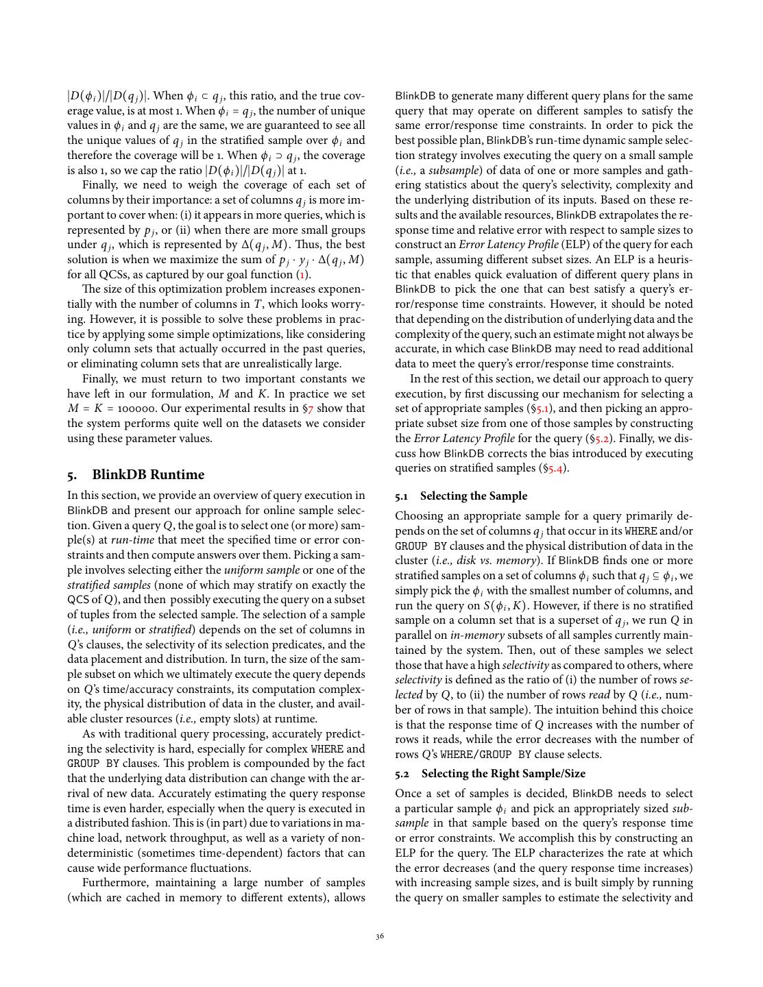 6 .2. Choosing sample sizes at random introduces the possibil- allows the system to read more rows for each group that is ity of missing or severely under-representing groups. The actually selected. So in general we want access to a family of probability of missing a large group is vanishingly small, stratified samples (S n ), one for each possible value of n. but the probability of missing a small group is substantial. Fortunately, there is a simple method that requires main- taining only a single sample for the whole family (S n ). Ac- This problem has been studied before. Briefly, since error cording to our sampling strategy, for a single value of n, decreases at a decreasing rate as sample size increases, the the size of the sample for each group is deterministic and best choice simply assigns equal sample size to each groups. is monotonically increasing in n. In addition, it is not nec- In addition, the assignment of sample sizes is deterministic, essary that the samples in the family be selected indepen- not random. A detailed proof is given by Acharya et al. [4]. dently. So given any sample S n max , for any n ≤ n max there This leads to the following algorithm for sample selection: is an S n ⊆ S n max that is an optimal sample for n in the sense 1. Compute group counts: To each x ∈ of the previous section. Our sample storage technique, de- x 0 , ..., x∣D(ϕ)∣−1 , assign a count, forming a ∣D(ϕ)∣- scribed next, allows such subsets to be identified at runtime. vector of counts N n∗ . Compute N n∗ as follows: Let The rows of stratified sample S(ϕ, K) are stored sequen- N(n′ ) = (min(⌊ ∣D(ϕ)∣ n′ ⌋, ∣Tx 0 ∣), min(⌊ ∣D(ϕ)∣ n′ ⌋, ∣Tx 1 ∣, ...), tially according to the order of columns in ϕ. Fig. 5(a) shows the optimal count-vector for a total sample size n′ . Then an example of storage layout for S(ϕ, K). B i j denotes a data choose N n∗ = N(max{n′ ∶ ∣∣N(n′ )∣∣1 S(φ) ≤ n}). In words, our block in the underlying file system, e.g., HDFS. Records cor- V(φ) samples cap the count of each group at some value ⌊ ∣D(ϕ)∣ n′ ⌋. responding to consecutive values in ϕ are stored in the same In the future we will use the name K for the cap size ⌊ ∣D(ϕ)∣ ⌋. block, e.g., B 1 . If the records corresponding to a popular value ′ n 2. Take samples: For each x, sample N nx rows uniformly ∗ do not all fit in one block, they are spread across several at random without replacement from Tx , forming the sample contiguous blocks e.g., blocks B 41 , B 42 and B 43 contain rows S x . Note that when ∣Tx ∣ = N nx ∗ , our sample includes all the from S x . Storing consecutive records contiguously on the rows ofφTx , and there will be no sampling error for that group. disk significantly improves the execution times or range of the queries on the set of columns ϕ. When S x is spread over multiple blocks, each block con- tains a randomly ordered random subset from S x , and, by K K extension, from the original table. This makes it possible to efficiently run queries on smaller samples. Assume a query Q, that needs to read n rows in total to satisfy its error Figure 4. Example of a stratified sample associated with a set bounds or time execution constraints. Let n x be the num- of columns, ϕ. ber of rows read from S x to compute the answer. (Note n x ≤ max {K, ∣Tx ∣} and ∑x∈D(ϕ),x selected by Q n x = n.) Since the The entire sample S(ϕ, K) is the disjoint union of the S x . rows are distributed randomly among the blocks, it is enough Since a stratified sample on ϕ is completely determined by the for Q to read any subset of blocks comprising S x , as long as group-size cap K, we henceforth denote a sample by S(ϕ, K) these blocks contain at least n x records. Fig. 5(b) shows an ex- or simply S when there is no ambiguity. K determines the size ample where Q reads only blocks B 41 and B 42 , as these blocks and therefore the statistical properties of a stratified sample contain enough records to compute the required answer. for each group. Storage overhead. An important consideration is the over- For example, consider query Q grouping by QCS ϕ, and head of maintaining these samples, especially for heavy- assume we use S(ϕ, K) to answer Q. For each value x on ϕ, tailed distributions with many rare groups. Consider a table if ∣Tx ∣ ≤ K, the sample contains all rows from the original with 1 billion tuples and a column set with a Zipf distribution table, so we can provide an exact answer for this group. On with an exponent of 1.5. Then, it turns out that the storage the other hand, if ∣Tx ∣ > K, we answer Q based on K random required by sample S(ϕ, K) is only 2.4% of the original table rows in the original table. For the basic aggregate operators for K = 104 , 5.2% for K = 105 , and 11.4% for K = 106 . AVG, SUM, COUNT, and QUANTILE, K directly determines the These results are consistent with real-world data from error of Q’s result. In particular, these aggregate √ operators Conviva Inc., where for K = 105 , the overhead incurred for a have standard error inversely proportional to K [16]. sample on popular columns like city, customer, autonomous system number (ASN) is less than 10%. 4.1.2 Optimizing a set of stratified samples for all queries sharing a QCS 4.2 Optimization Framework Now we turn to the question of creating samples for a set We now describe the optimization framework to select sub- of queries that share a QCS ϕ but have different values of n. sets of columns on which to build sample families. Un- Recall that n, the number of rows we read to satisfy a query, like prior work which focuses on single-column stratified will vary according to user-specified error or time bounds. A samples [9] or on a single multi-dimensional (i.e., multi- WHERE query may also select only a subset of groups, which column) stratified sample [4], BlinkDB creates several multi- 34