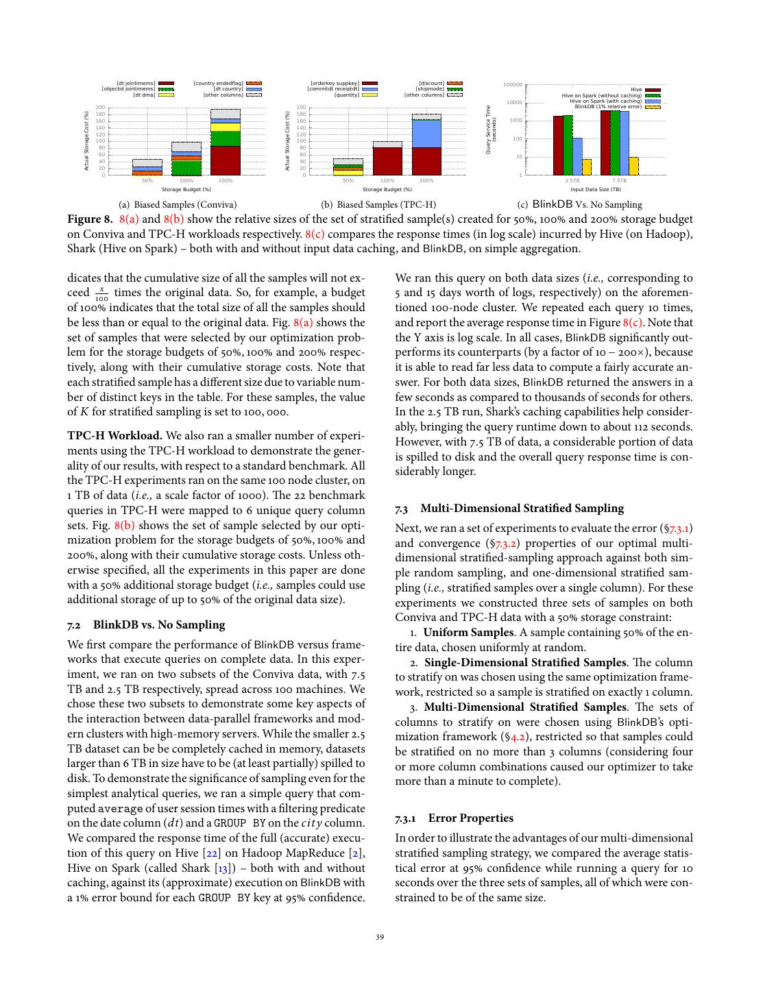 12 . 10 11 10000 Uniform Samples Uniform Samples Uniform Samples Statistical Error (%) Statistical Error (%) 9 10 Single Column Single Column Single Column 8 Multi-Column 9 Multi-Column 1000 Time (seconds) Multi-Column 7 8 6 7 100 5 6 4 5 10 3 4 1 2 3 1 2 QCS1 QCS2 QCS3 QCS4 QCS5 QCS1 QCS2 QCS3 QCS4 QCS5 QCS6 0.1 (16) (10) (1) (12) (1) (4) (6) (3) (7) (1) (1) 0 5 10 15 20 25 30 35 Unique QCS Unique QCS Statistical Error (%) (a) Error Comparison (Conviva) (b) Error Comparison (TPC-H) (c) Error Convergence (Conviva) Figure 9. 9(a) and 9(b) compare the average statistical error per QCS when running a query with fixed time budget of 10 seconds for various sets of samples. 9(c) compares the rates of error convergence with respect to time for various sets of samples. For our evaluation using Conviva’s data we used a set of 40 To test time-bounded queries, we picked a sample of 20 Con- of the most popular queries (with 5 unique QCSs) and 17 TB viva queries, and ran each of them 10 times, with a maximum of uncompressed data on 100 nodes. We ran a similar set of time bound from 1 to 10 seconds. Figure 10(a) shows the re- experiments on the standard TPC-H queries (with 6 unique sults run on the same 17 TB data set, where each bar repre- QCSs). The queries we chose were on the l ineitem table, and sents the minimum, maximum and average response times were modified to conform with HiveQL syntax. of the 20 queries, averaged over 10 runs. From these results In Figures 9(a), and 9(b), we report the average statisti- we can see that BlinkDB is able to accurately select a sample cal error in the results of each of these queries when they to satisfy a target response time. ran on the aforementioned sets of samples. The queries are Figure 10(b) shows results from the same set of queries, binned according to the set(s) of columns in their GROUP BY, also on the 17 TB data set, evaluating our ability to meet spec- WHERE and HAVING clauses (i.e., their QCSs) and the num- ified error constraints. In this case, we varied the requested bers in brackets indicate the number of queries which lie maximum error bound from 2% to 32% . The bars again repre- in each bin. Based on the storage constraints, BlinkDB’s op- sent the minimum, maximum and average errors across dif- timization framework had samples stratified on QCS1 and ferent runs of the queries. Note that the measured error is QCS2 for Conviva data and samples stratified on QCS1 , almost always at or less than the requested error. However, QCS2 and QCS4 for TPC-H data. For common QCSs, as we increase the error bound, the measured error becomes multi-dimensional samples produce smaller statistical errors closer to the bound. This is because at higher error rates the than either one-dimensional or random samples. The opti- sample size is quite small and error bounds are wider. mization framework attempts to minimize expected error, rather than per-query errors, and therefore for some specific QCS single-dimensional stratified samples behave better than 7.5 Scaling Up multi-dimensional samples. Overall, however, our optimiza- Finally, in order to evaluate the scalability properties of tion framework significantly improves performance versus BlinkDB as a function of cluster size, we created 2 different single column samples. sets of query workload suites consisting of 40 unique Con- viva queries each. The first set (marked as sel ective) consists 7.3.2 Convergence Properties of highly selective queries – i.e., those queries that only oper- We also ran experiments to demonstrate the convergence ate on a small fraction of input data. These queries occur fre- properties of multi-dimensional stratified samples used by quently in production workloads and consist of one or more BlinkDB. We use the same set of three samples as §7.3, taken highly selective WHERE clauses. The second set (marked as over 17 TB of Conviva data. Over this data, we ran multiple bul k) consists of those queries that are intended to crunch queries to calculate average session time huge amounts of data. While the former set’s input is gener- For a particular ISP’s customers in 5 US Cities and deter- ally striped across a small number of machines, the latter set mined the latency for achieving a particular error bound with of queries generally runs on data stored on a large number 95% confidence. Results from this experiment (Figure 9(c)) of machines, incurring a higher communication cost. Fig- show that error bars from running queries over multi- ure 10(c) plots the query latency for each of these workloads dimensional samples converge orders-of-magnitude faster as a function of cluster size. Each query operates on 100n GB than random sampling (i.e., Hadoop Online [11, 19]), and are of data (where n is the cluster size). So for a 10 node clus- significantly faster to converge than single-dimensional strat- ter, each query operates on 1 TB of data and for a 100 node ified samples. cluster each query operates on around 10 TB of data. Fur- ther, for each workload suite, we evaluate the query latency 7.4 Time/Accuracy Guarantees for the case when the required samples are completely cached In this set of experiments, we evaluate BlinkDB’s effectiveness in RAM or when they are stored entirely on disk. Since in re- at meeting different time/error bounds requested by the user. ality any sample will likely partially reside both on disk and in 40