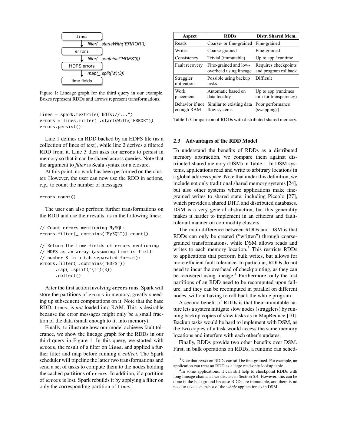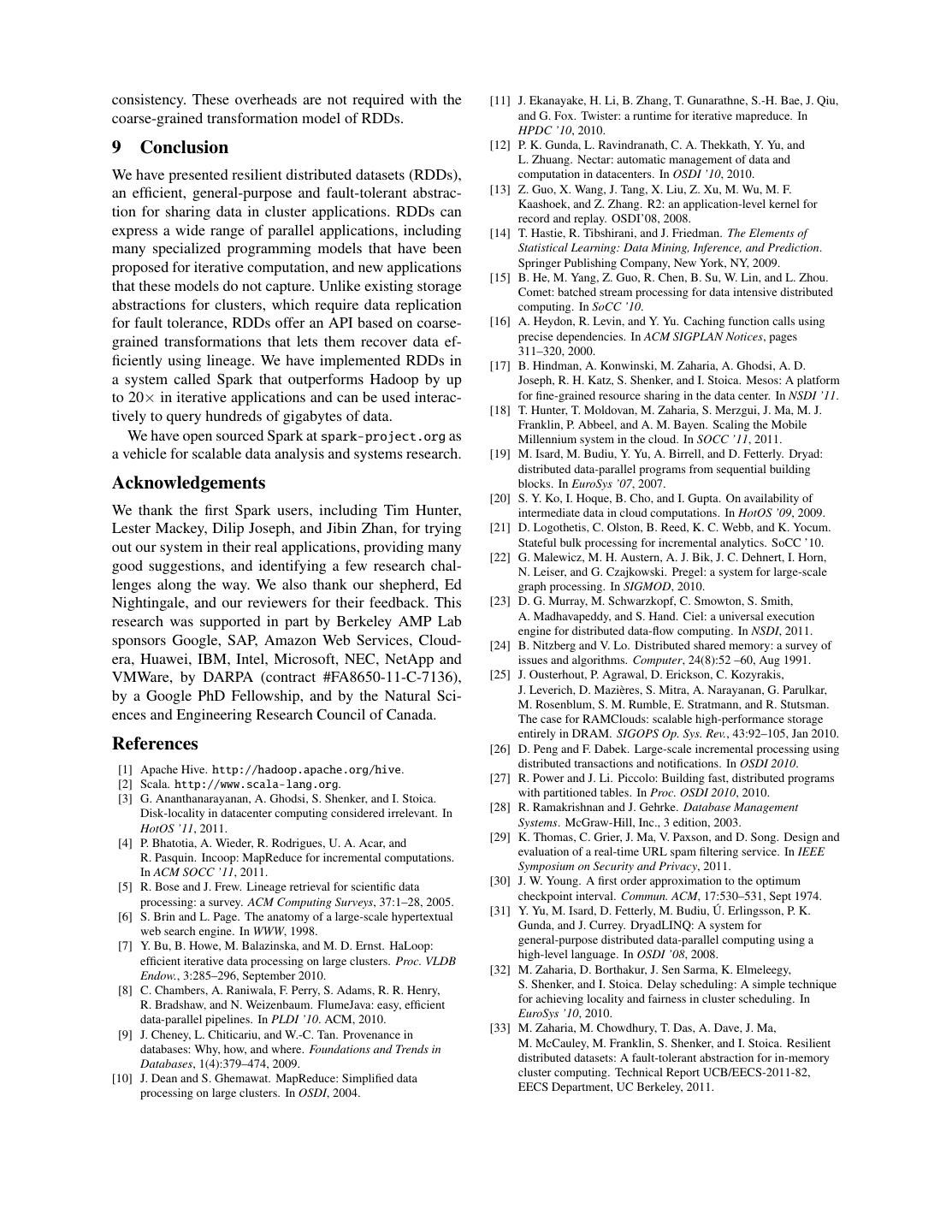 14 .consistency. These overheads are not required with the [11] J. Ekanayake, H. Li, B. Zhang, T. Gunarathne, S.-H. Bae, J. Qiu, coarse-grained transformation model of RDDs. and G. Fox. Twister: a runtime for iterative mapreduce. In HPDC ’10, 2010. 9 Conclusion [12] P. K. Gunda, L. Ravindranath, C. A. Thekkath, Y. Yu, and L. Zhuang. Nectar: automatic management of data and We have presented resilient distributed datasets (RDDs), computation in datacenters. In OSDI ’10, 2010. an efficient, general-purpose and fault-tolerant abstrac- [13] Z. Guo, X. Wang, J. Tang, X. Liu, Z. Xu, M. Wu, M. F. Kaashoek, and Z. Zhang. R2: an application-level kernel for tion for sharing data in cluster applications. RDDs can record and replay. OSDI’08, 2008. express a wide range of parallel applications, including [14] T. Hastie, R. Tibshirani, and J. Friedman. The Elements of many specialized programming models that have been Statistical Learning: Data Mining, Inference, and Prediction. proposed for iterative computation, and new applications Springer Publishing Company, New York, NY, 2009. [15] B. He, M. Yang, Z. Guo, R. Chen, B. Su, W. Lin, and L. Zhou. that these models do not capture. Unlike existing storage Comet: batched stream processing for data intensive distributed abstractions for clusters, which require data replication computing. In SoCC ’10. for fault tolerance, RDDs offer an API based on coarse- [16] A. Heydon, R. Levin, and Y. Yu. Caching function calls using precise dependencies. In ACM SIGPLAN Notices, pages grained transformations that lets them recover data ef- 311–320, 2000. ficiently using lineage. We have implemented RDDs in [17] B. Hindman, A. Konwinski, M. Zaharia, A. Ghodsi, A. D. a system called Spark that outperforms Hadoop by up Joseph, R. H. Katz, S. Shenker, and I. Stoica. Mesos: A platform to 20× in iterative applications and can be used interac- for fine-grained resource sharing in the data center. In NSDI ’11. [18] T. Hunter, T. Moldovan, M. Zaharia, S. Merzgui, J. Ma, M. J. tively to query hundreds of gigabytes of data. Franklin, P. Abbeel, and A. M. Bayen. Scaling the Mobile We have open sourced Spark at spark-project.org as Millennium system in the cloud. In SOCC ’11, 2011. a vehicle for scalable data analysis and systems research. [19] M. Isard, M. Budiu, Y. Yu, A. Birrell, and D. Fetterly. Dryad: distributed data-parallel programs from sequential building Acknowledgements blocks. In EuroSys ’07, 2007. [20] S. Y. Ko, I. Hoque, B. Cho, and I. Gupta. On availability of We thank the first Spark users, including Tim Hunter, intermediate data in cloud computations. In HotOS ’09, 2009. Lester Mackey, Dilip Joseph, and Jibin Zhan, for trying [21] D. Logothetis, C. Olston, B. Reed, K. C. Webb, and K. Yocum. out our system in their real applications, providing many Stateful bulk processing for incremental analytics. SoCC ’10. [22] G. Malewicz, M. H. Austern, A. J. Bik, J. C. Dehnert, I. Horn, good suggestions, and identifying a few research chal- N. Leiser, and G. Czajkowski. Pregel: a system for large-scale lenges along the way. We also thank our shepherd, Ed graph processing. In SIGMOD, 2010. Nightingale, and our reviewers for their feedback. This [23] D. G. Murray, M. Schwarzkopf, C. Smowton, S. Smith, A. Madhavapeddy, and S. Hand. Ciel: a universal execution research was supported in part by Berkeley AMP Lab engine for distributed data-flow computing. In NSDI, 2011. sponsors Google, SAP, Amazon Web Services, Cloud- [24] B. Nitzberg and V. Lo. Distributed shared memory: a survey of era, Huawei, IBM, Intel, Microsoft, NEC, NetApp and issues and algorithms. Computer, 24(8):52 –60, Aug 1991. VMWare, by DARPA (contract #FA8650-11-C-7136), [25] J. Ousterhout, P. Agrawal, D. Erickson, C. Kozyrakis, J. Leverich, D. Mazi`eres, S. Mitra, A. Narayanan, G. Parulkar, by a Google PhD Fellowship, and by the Natural Sci- M. Rosenblum, S. M. Rumble, E. Stratmann, and R. Stutsman. ences and Engineering Research Council of Canada. The case for RAMClouds: scalable high-performance storage entirely in DRAM. SIGOPS Op. Sys. Rev., 43:92–105, Jan 2010. References [26] D. Peng and F. Dabek. Large-scale incremental processing using [1] Apache Hive. http://hadoop.apache.org/hive. distributed transactions and notifications. In OSDI 2010. [2] Scala. http://www.scala-lang.org. [27] R. Power and J. Li. Piccolo: Building fast, distributed programs [3] G. Ananthanarayanan, A. Ghodsi, S. Shenker, and I. Stoica. with partitioned tables. In Proc. OSDI 2010, 2010. Disk-locality in datacenter computing considered irrelevant. In [28] R. Ramakrishnan and J. Gehrke. Database Management HotOS ’11, 2011. Systems. McGraw-Hill, Inc., 3 edition, 2003. [4] P. Bhatotia, A. Wieder, R. Rodrigues, U. A. Acar, and [29] K. Thomas, C. Grier, J. Ma, V. Paxson, and D. Song. Design and R. Pasquin. Incoop: MapReduce for incremental computations. evaluation of a real-time URL spam filtering service. In IEEE In ACM SOCC ’11, 2011. Symposium on Security and Privacy, 2011. [5] R. Bose and J. Frew. Lineage retrieval for scientific data [30] J. W. Young. A first order approximation to the optimum processing: a survey. ACM Computing Surveys, 37:1–28, 2005. checkpoint interval. Commun. ACM, 17:530–531, Sept 1974. [31] Y. Yu, M. Isard, D. Fetterly, M. Budiu, U.´ Erlingsson, P. K. [6] S. Brin and L. Page. The anatomy of a large-scale hypertextual web search engine. In WWW, 1998. Gunda, and J. Currey. DryadLINQ: A system for [7] Y. Bu, B. Howe, M. Balazinska, and M. D. Ernst. HaLoop: general-purpose distributed data-parallel computing using a efficient iterative data processing on large clusters. Proc. VLDB high-level language. In OSDI ’08, 2008. Endow., 3:285–296, September 2010. [32] M. Zaharia, D. Borthakur, J. Sen Sarma, K. Elmeleegy, [8] C. Chambers, A. Raniwala, F. Perry, S. Adams, R. R. Henry, S. Shenker, and I. Stoica. Delay scheduling: A simple technique R. Bradshaw, and N. Weizenbaum. FlumeJava: 