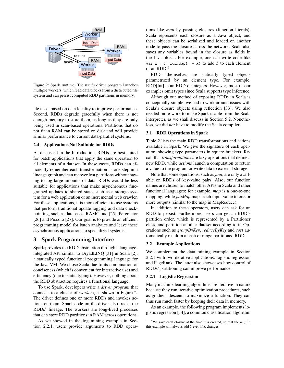 4 . RAM tions like map by passing closures (function literals). Worker Scala represents each closure as a Java object, and Input Data these objects can be serialized and loaded on another RAM node to pass the closure across the network. Scala also Driver Worker saves any variables bound in the closure as fields in results the Java object. For example, one can write code like RAM Input Data tasks var x = 5; rdd.map(_ + x) to add 5 to each element Worker of an RDD.5 Input Data RDDs themselves are statically typed objects parametrized by an element type. For example, Figure 2: Spark runtime. The user’s driver program launches RDD[Int] is an RDD of integers. However, most of our multiple workers, which read data blocks from a distributed file examples omit types since Scala supports type inference. system and can persist computed RDD partitions in memory. Although our method of exposing RDDs in Scala is conceptually simple, we had to work around issues with ule tasks based on data locality to improve performance. Scala’s closure objects using reflection [33]. We also Second, RDDs degrade gracefully when there is not needed more work to make Spark usable from the Scala enough memory to store them, as long as they are only interpreter, as we shall discuss in Section 5.2. Nonethe- being used in scan-based operations. Partitions that do less, we did not have to modify the Scala compiler. not fit in RAM can be stored on disk and will provide 3.1 RDD Operations in Spark similar performance to current data-parallel systems. Table 2 lists the main RDD transformations and actions 2.4 Applications Not Suitable for RDDs available in Spark. We give the signature of each oper- As discussed in the Introduction, RDDs are best suited ation, showing type parameters in square brackets. Re- for batch applications that apply the same operation to call that transformations are lazy operations that define a all elements of a dataset. In these cases, RDDs can ef- new RDD, while actions launch a computation to return ficiently remember each transformation as one step in a a value to the program or write data to external storage. lineage graph and can recover lost partitions without hav- Note that some operations, such as join, are only avail- ing to log large amounts of data. RDDs would be less able on RDDs of key-value pairs. Also, our function suitable for applications that make asynchronous fine- names are chosen to match other APIs in Scala and other grained updates to shared state, such as a storage sys- functional languages; for example, map is a one-to-one tem for a web application or an incremental web crawler. mapping, while flatMap maps each input value to one or For these applications, it is more efficient to use systems more outputs (similar to the map in MapReduce). that perform traditional update logging and data check- In addition to these operators, users can ask for an pointing, such as databases, RAMCloud [25], Percolator RDD to persist. Furthermore, users can get an RDD’s [26] and Piccolo [27]. Our goal is to provide an efficient partition order, which is represented by a Partitioner programming model for batch analytics and leave these class, and partition another dataset according to it. Op- asynchronous applications to specialized systems. erations such as groupByKey, reduceByKey and sort au- tomatically result in a hash or range partitioned RDD. 3 Spark Programming Interface 3.2 Example Applications Spark provides the RDD abstraction through a language- integrated API similar to DryadLINQ [31] in Scala [2], We complement the data mining example in Section a statically typed functional programming language for 2.2.1 with two iterative applications: logistic regression the Java VM. We chose Scala due to its combination of and PageRank. The latter also showcases how control of conciseness (which is convenient for interactive use) and RDDs’ partitioning can improve performance. efficiency (due to static typing). However, nothing about 3.2.1 Logistic Regression the RDD abstraction requires a functional language. Many machine learning algorithms are iterative in nature To use Spark, developers write a driver program that because they run iterative optimization procedures, such connects to a cluster of workers, as shown in Figure 2. as gradient descent, to maximize a function. They can The driver defines one or more RDDs and invokes ac- thus run much faster by keeping their data in memory. tions on them. Spark code on the driver also tracks the As an example, the following program implements lo- RDDs’ lineage. The workers are long-lived processes gistic regression [14], a common classification algorithm that can store RDD partitions in RAM across operations. As we showed in the log mining example in Sec- 5 We save each closure at the time it is created, so that the map in tion 2.2.1, users provide arguments to RDD opera- this example will always add 5 even if x changes.