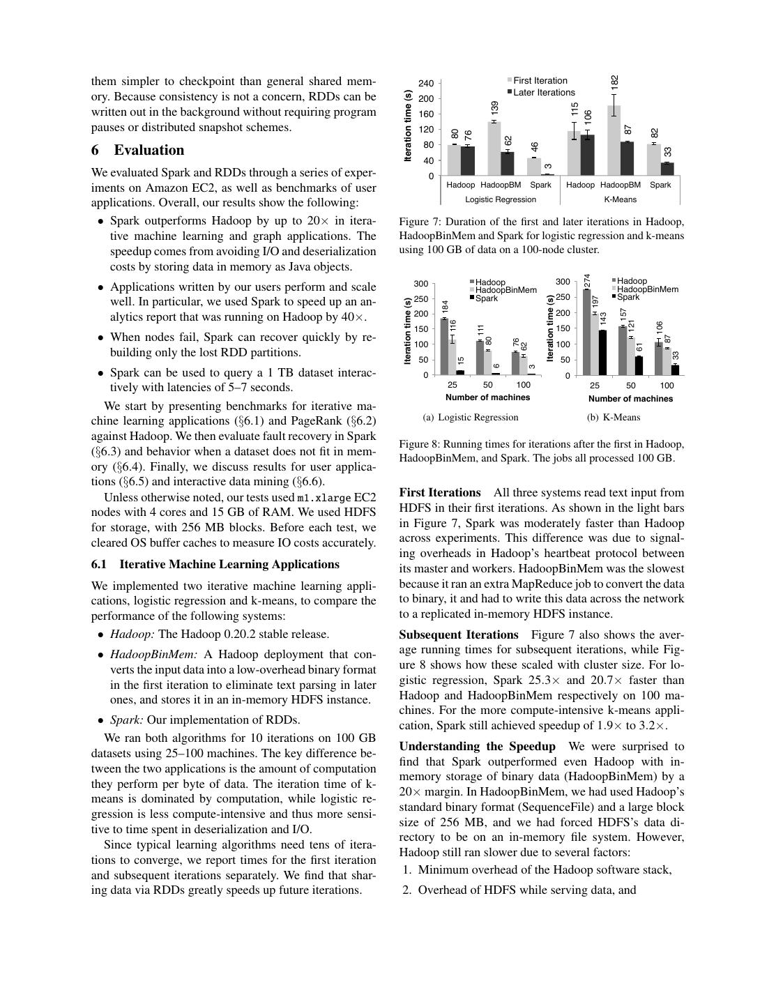 9 . 182! them simpler to checkpoint than general shared mem- 240! First Iteration! Iteration time (s)! Later Iterations! ory. Because consistency is not a concern, RDDs can be 200! 139! 115! written out in the background without requiring program 106! 160! 87! pauses or distributed snapshot schemes. 82! 120! 80! 76! 62! 46! 80! 33! 6 Evaluation 40! 3! We evaluated Spark and RDDs through a series of exper- 0! iments on Amazon EC2, as well as benchmarks of user Hadoop! HadoopBM! Spark! Hadoop! HadoopBM! Spark! Logistic Regression! K-Means! applications. Overall, our results show the following: • Spark outperforms Hadoop by up to 20× in itera- Figure 7: Duration of the first and later iterations in Hadoop, tive machine learning and graph applications. The HadoopBinMem and Spark for logistic regression and k-means speedup comes from avoiding I/O and deserialization using 100 GB of data on a 100-node cluster. costs by storing data in memory as Java objects. 274! 300! Hadoop! 300! Hadoop ! • Applications written by our users perform and scale HadoopBinMem! HadoopBinMem! Iteration time (s)! 197! 250! Spark! 250! Spark! Iteration time (s)! well. In particular, we used Spark to speed up an an- 184! 157! 200! 143! alytics report that was running on Hadoop by 40×. 200! 121! 116! 106! 111! 150! 150! • When nodes fail, Spark can recover quickly by re- 87! 80! 76! 62! 61! 100! 100! building only the lost RDD partitions. 33! 15! 50! 50! 6! 3! • Spark can be used to query a 1 TB dataset interac- 0! 0! tively with latencies of 5–7 seconds. 25! 50! 100! 25! 50! 100! Number of machines! Number of machines! We start by presenting benchmarks for iterative ma- chine learning applications (§6.1) and PageRank (§6.2) (a) Logistic Regression (b) K-Means against Hadoop. We then evaluate fault recovery in Spark Figure 8: Running times for iterations after the first in Hadoop, (§6.3) and behavior when a dataset does not fit in mem- HadoopBinMem, and Spark. The jobs all processed 100 GB. ory (§6.4). Finally, we discuss results for user applica- tions (§6.5) and interactive data mining (§6.6). Unless otherwise noted, our tests used m1.xlarge EC2 First Iterations All three systems read text input from nodes with 4 cores and 15 GB of RAM. We used HDFS HDFS in their first iterations. As shown in the light bars for storage, with 256 MB blocks. Before each test, we in Figure 7, Spark was moderately faster than Hadoop cleared OS buffer caches to measure IO costs accurately. across experiments. This difference was due to signal- ing overheads in Hadoop’s heartbeat protocol between 6.1 Iterative Machine Learning Applications its master and workers. HadoopBinMem was the slowest We implemented two iterative machine learning appli- because it ran an extra MapReduce job to convert the data cations, logistic regression and k-means, to compare the to binary, it and had to write this data across the network performance of the following systems: to a replicated in-memory HDFS instance. • Hadoop: The Hadoop 0.20.2 stable release. Subsequent Iterations Figure 7 also shows the aver- • HadoopBinMem: A Hadoop deployment that con- age running times for subsequent iterations, while Fig- verts the input data into a low-overhead binary format ure 8 shows how these scaled with cluster size. For lo- in the first iteration to eliminate text parsing in later gistic regression, Spark 25.3× and 20.7× faster than ones, and stores it in an in-memory HDFS instance. Hadoop and HadoopBinMem respectively on 100 ma- chines. For the more compute-intensive k-means appli- • Spark: Our implementation of RDDs. cation, Spark still achieved speedup of 1.9× to 3.2×. We ran both algorithms for 10 iterations on 100 GB Understanding the Speedup We were surprised to datasets using 25–100 machines. The key difference be- find that Spark outperformed even Hadoop with in- tween the two applications is the amount of computation memory storage of binary data (HadoopBinMem) by a they perform per byte of data. The iteration time of k- 20× margin. In HadoopBinMem, we had used Hadoop’s means is dominated by computation, while logistic re- standard binary format (SequenceFile) and a large block gression is less compute-intensive and thus more sensi- size of 256 MB, and we had forced HDFS’s data di- tive to time spent in deserialization and I/O. rectory to be on an in-memory file system. However, Since typical learning algorithms need tens of itera- Hadoop still ran slower due to several factors: tions to converge, we report times for the first iteration and subsequent iterations separately. We find that shar- 1. Minimum overhead of the Hadoop software stack, ing data via RDDs greatly speeds up future iterations. 2. Overhead of HDFS while serving data, and