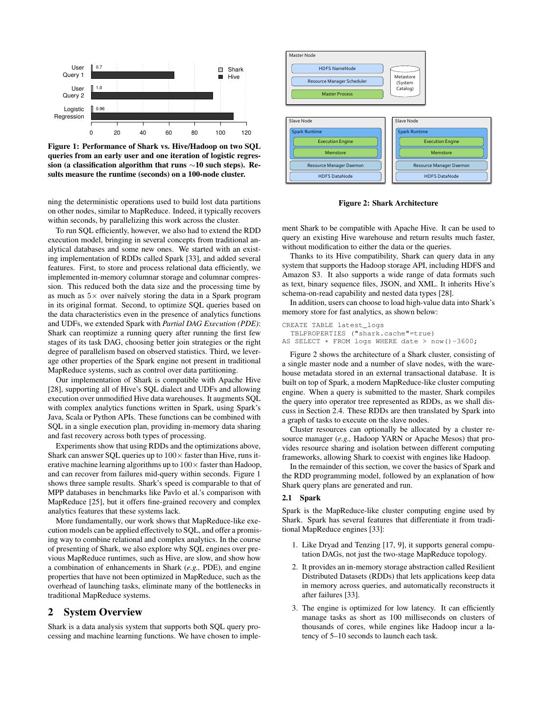 13 . To truly optimize the execution of relational queries, however, More fundamentally, there are few reasons why sub-second tasks we found it necessary to select execution plans based on data statis- should not be feasible even at higher scales than we have explored, tics. This becomes difficult in the presence of UDFs and complex such as tens of thousands of nodes. Systems like Dremel [24] rou- analytics functions, which we seek to support as first-class citizens tinely run sub-second, multi-thousand-node jobs. Indeed, even if in Shark. To address this problem, we proposed partial DAG execu- a single master cannot keep up with the scheduling decisions, the tion (PDE), which allows our modified version of Spark to change scheduling could be delegated across “lieutenant” masters for sub- the downstream portion of an execution graph once each stage com- sets of the cluster. Fine-grained tasks also offer many advantages pletes based on data statistics. PDE goes beyond the runtime graph over coarser-grained execution graphs beyond load balancing, such rewriting features in previous systems, such as DryadLINQ [19], as faster recovery (by spreading out lost tasks across more nodes) by collecting fine-grained statistics about ranges of keys and by and query elasticity; we discuss some of these next. allowing switches to a completely different join strategy, such as 7.2 Other Benefits of the Fine-Grained Task Model broadcast join, instead of just selecting the number of reduce tasks. While this paper has focused primarily on the fault tolerance ben- Task Scheduling Cost: Perhaps the most surprising engine prop- efits of fine-grained deterministic tasks, the model also provides erty that affected Shark, however, was a purely “engineering” con- other attractive properties. We wish to point out two benefits that cern: the overhead of launching tasks. Traditional MapReduce sys- have been explored in MapReduce-based systems. tems, such as Hadoop, were designed for multi-hour batch jobs consisting of tasks that were several minutes long. They launched Elasticity: In traditional MPP databases, a distributed query plan each task in a separate OS process, and in some cases had a high is selected once, and the system needs to run at that level of par- latency to even submit a task. For instance, Hadoop uses periodic allelism for the whole duration of the query. In a fine-grained task “heartbeats” from each worker every 3 seconds to assign tasks, and system, however, nodes can appear or go away during a query, and sees overall task startup delays of 5–10 seconds. This was sufficient pending work will automatically be spread onto them. This en- for batch workloads, but clearly falls short for ad-hoc queries. ables the database engine to naturally be elastic. If an administrator Spark avoids this problem by using a fast event-driven RPC li- wishes to remove nodes from the engine (e.g., in a virtualized cor- brary to launch tasks and by reusing its worker processes. It can porate data center), the engine can simply treat those as failed, or launch thousands of tasks per second with only about 5 ms of over- (better yet) proactively replicate their data to other nodes if given head per task, making task lengths of 50-100 ms and MapReduce a few minutes’ warning. Similarly, a database engine running on a jobs of 500 ms viable. What surprised us is how much this affected cloud could scale up by requesting new VMs if a query is expen- query performance, even in large (multi-minute) queries. sive. Amazon’s Elastic MapReduce [2] already supports resizing Sub-second tasks allow the engine to balance work across nodes clusters at runtime. extremely well, even when some nodes incur unpredictable delays Multitenancy: The same elasticity, mentioned above, enables dy- (e.g., network delays or JVM garbage collection). They also help namic resource sharing between users. In a traditional MPP database, dramatically with skew. Consider, for example, a system that needs if an important query arrives while another large query using most to run a hash aggregation on 100 cores. If the system launches 100 of the cluster, there are few options beyond canceling the earlier reduce tasks, the key range for each task needs to be carefully cho- query. In systems based on fine-grained tasks, one can simply wait sen, as any imbalance will slow down the entire job. If it could split a few seconds for the current tasks from the first query to finish, the work among 1000 tasks, then the slowest task can be as much and start giving the nodes tasks from the second query. For in- as 10× slower than the average without affecting the job response stance, Facebook and Microsoft have developed fair schedulers for time much! After implementing skew-aware partition selection in Hadoop and Dryad that allow large historical queries, compute- PDE, we were somewhat disappointed that it did not help compared intensive machine learning jobs, and short ad-hoc queries to safely to just having a higher number of reduce tasks in most workloads, coexist [32, 18]. because Spark could comfortably support thousands of such tasks. However, this property makes the engine highly robust to unex- 8 Related Work pected skew. To the best of our knowledge, Shark is the only low-latency system In this way, Spark stands in contrast to Hadoop/Hive, where us- that can efficiently combine SQL and machine learning workloads, ing the wrong number of tasks was sometimes 10× slower than while supporting fine-grained fault recovery. an optimal plan, and there has been considerable work to auto- We categorize large-scale data analytics systems into three classes. matically choose the number of reduce tasks [21, 15]. Figure 13 First, systems like Hive [28], Tenzing [9], SCOPE [8], and Chee- shows how job execution times varies as the number of reduce tasks tah [10] compile declarative queries into MapReduce-style jobs. launched by Hadoop and Spark. Since a Spark 