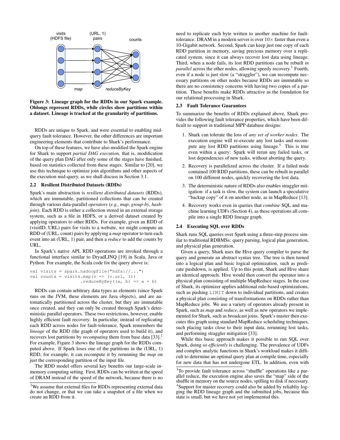 5 . visits (URL, 1) need to replicate each byte written to another machine for fault- (HDFS file) pairs counts tolerance. DRAM in a modern server is over 10× faster than even a 10-Gigabit network. Second, Spark can keep just one copy of each RDD partition in memory, saving precious memory over a repli- cated system, since it can always recover lost data using lineage. Third, when a node fails, its lost RDD partitions can be rebuilt in parallel across the other nodes, allowing speedy recovery.3 Fourth, even if a node is just slow (a “straggler”), we can recompute nec- essary partitions on other nodes because RDDs are immutable so there are no consistency concerns with having two copies of a par- map reduceByKey tition. These benefits make RDDs attractive as the foundation for our relational processing in Shark. Figure 3: Lineage graph for the RDDs in our Spark example. Oblongs represent RDDs, while circles show partitions within 2.3 Fault Tolerance Guarantees a dataset. Lineage is tracked at the granularity of partitions. To summarize the benefits of RDDs explained above, Shark pro- vides the following fault tolerance properties, which have been dif- ficult to support in traditional MPP database designs: RDDs are unique to Spark, and were essential to enabling mid- query fault tolerance. However, the other differences are important 1. Shark can tolerate the loss of any set of worker nodes. The engineering elements that contribute to Shark’s performance. execution engine will re-execute any lost tasks and recom- On top of these features, we have also modified the Spark engine pute any lost RDD partitions using lineage.4 This is true for Shark to support partial DAG execution, that is, modification even within a query: Spark will rerun any failed tasks, or of the query plan DAG after only some of the stages have finished, lost dependencies of new tasks, without aborting the query. based on statistics collected from these stages. Similar to [20], we 2. Recovery is parallelized across the cluster. If a failed node use this technique to optimize join algorithms and other aspects of contained 100 RDD partitions, these can be rebuilt in parallel the execution mid-query, as we shall discuss in Section 3.1. on 100 different nodes, quickly recovering the lost data. 2.2 Resilient Distributed Datasets (RDDs) 3. The deterministic nature of RDDs also enables straggler mit- Spark’s main abstraction is resilient distributed datasets (RDDs), igation: if a task is slow, the system can launch a speculative which are immutable, partitioned collections that can be created “backup copy” of it on another node, as in MapReduce [13]. through various data-parallel operators (e.g., map, group-by, hash- 4. Recovery works even in queries that combine SQL and ma- join). Each RDD is either a collection stored in an external storage chine learning UDFs (Section 4), as these operations all com- system, such as a file in HDFS, or a derived dataset created by pile into a single RDD lineage graph. applying operators to other RDDs. For example, given an RDD of (visitID, URL) pairs for visits to a website, we might compute an 2.4 Executing SQL over RDDs RDD of (URL, count) pairs by applying a map operator to turn each Shark runs SQL queries over Spark using a three-step process sim- event into an (URL, 1) pair, and then a reduce to add the counts by ilar to traditional RDBMSs: query parsing, logical plan generation, URL. and physical plan generation. In Spark’s native API, RDD operations are invoked through a Given a query, Shark uses the Hive query compiler to parse the functional interface similar to DryadLINQ [19] in Scala, Java or query and generate an abstract syntax tree. The tree is then turned Python. For example, the Scala code for the query above is: into a logical plan and basic logical optimization, such as predi- val visits = spark.hadoopFile("hdfs://...") cate pushdown, is applied. Up to this point, Shark and Hive share val counts = visits.map(v => (v.url, 1)) an identical approach. Hive would then convert the operator into a .reduceByKey((a, b) => a + b) physical plan consisting of multiple MapReduce stages. In the case of Shark, its optimizer applies additional rule-based optimizations, RDDs can contain arbitrary data types as elements (since Spark such as pushing LIMIT down to individual partitions, and creates runs on the JVM, these elements are Java objects), and are au- a physical plan consisting of transformations on RDDs rather than tomatically partitioned across the cluster, but they are immutable MapReduce jobs. We use a variety of operators already present in once created, and they can only be created through Spark’s deter- Spark, such as map and reduce, as well as new operators we imple- ministic parallel operators. These two restrictions, however, enable mented for Shark, such as broadcast joins. Spark’s master then exe- highly efficient fault recovery. In particular, instead of replicating cutes this graph using standard MapReduce scheduling techniques, each RDD across nodes for fault-tolerance, Spark remembers the such placing tasks close to their input data, rerunning lost tasks, lineage of the RDD (the graph of operators used to build it), and and performing straggler mitigation [33]. recovers lost partitions by recomputing them from base data [33].2 While this basic approach makes it possible to run SQL over For example, Figure 3 shows the lineage graph for the RDDs com- Spark, doing so efficiently is challenging. The prevalence of UDFs puted above. If Spark loses one of the partitions in the (URL, 1) and complex analytic functions in Shark’s workload makes it diffi- RDD, for example, it can recompute it by rerunning the map on cult to determine an optimal query plan at compile time, especially just the corresponding partition of the input file. for new data that has not undergone ETL. In addition, even with The RDD model offers several key benefits our large-scale in- 3 me