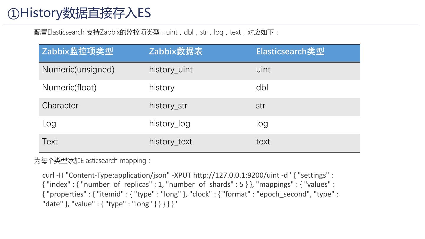 12 . E curl -H "Content-Type:application/json" -XPUT http://127.0.0.1:9200/uint -d ' { "settings" : { "index" : { "number_of_replicas" : 1, "number_of_shards" : 5 } }, "mappings" : { "values" : { "properties" : { "itemid" : { "type" : "long" }, "clock" : { "format" : "epoch_second", "type" : "date" }, "value" : { "type" : "long" } } } } } '