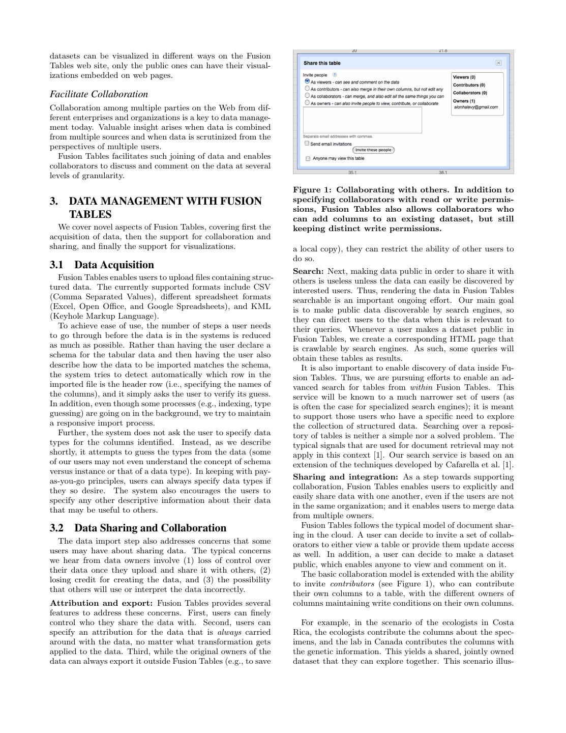 3 .datasets can be visualized in different ways on the Fusion Tables web site, only the public ones can have their visual- izations embedded on web pages. Facilitate Collaboration Collaboration among multiple parties on the Web from dif- ferent enterprises and organizations is a key to data manage- ment today. Valuable insight arises when data is combined from multiple sources and when data is scrutinized from the perspectives of multiple users. Fusion Tables facilitates such joining of data and enables collaborators to discuss and comment on the data at several levels of granularity. Figure 1: Collaborating with others. In addition to 3. DATA MANAGEMENT WITH FUSION specifying collaborators with read or write permis- sions, Fusion Tables also allows collaborators who TABLES can add columns to an existing dataset, but still We cover novel aspects of Fusion Tables, covering first the keeping distinct write permissions. acquisition of data, then the support for collaboration and sharing, and finally the support for visualizations. a local copy), they can restrict the ability of other users to do so. 3.1 Data Acquisition Search: Next, making data public in order to share it with Fusion Tables enables users to upload files containing struc- others is useless unless the data can easily be discovered by tured data. The currently supported formats include CSV interested users. Thus, rendering the data in Fusion Tables (Comma Separated Values), different spreadsheet formats searchable is an important ongoing effort. Our main goal (Excel, Open Office, and Google Spreadsheets), and KML is to make public data discoverable by search engines, so (Keyhole Markup Language). they can direct users to the data when this is relevant to To achieve ease of use, the number of steps a user needs their queries. Whenever a user makes a dataset public in to go through before the data is in the systems is reduced Fusion Tables, we create a corresponding HTML page that as much as possible. Rather than having the user declare a is crawlable by search engines. As such, some queries will schema for the tabular data and then having the user also obtain these tables as results. describe how the data to be imported matches the schema, It is also important to enable discovery of data inside Fu- the system tries to detect automatically which row in the sion Tables. Thus, we are pursuing efforts to enable an ad- imported file is the header row (i.e., specifying the names of vanced search for tables from within Fusion Tables. This the columns), and it simply asks the user to verify its guess. service will be known to a much narrower set of users (as In addition, even though some processes (e.g., indexing, type is often the case for specialized search engines); it is meant guessing) are going on in the background, we try to maintain to support those users who have a specific need to explore a responsive import process. the collection of structured data. Searching over a reposi- Further, the system does not ask the user to specify data tory of tables is neither a simple nor a solved problem. The types for the columns identified. Instead, as we describe typical signals that are used for document retrieval may not shortly, it attempts to guess the types from the data (some apply in this context [1]. Our search service is based on an of our users may not even understand the concept of schema extension of the techniques developed by Cafarella et al. [1]. versus instance or that of a data type). In keeping with pay- as-you-go principles, users can always specify data types if Sharing and integration: As a step towards supporting they so desire. The system also encourages the users to collaboration, Fusion Tables enables users to explicitly and specify any other descriptive information about their data easily share data with one another, even if the users are not that may be useful to others. in the same organization; and it enables users to merge data from multiple owners. 3.2 Data Sharing and Collaboration Fusion Tables follows the typical model of document shar- ing in the cloud. A user can decide to invite a set of collab- The data import step also addresses concerns that some orators to either view a table or provide them update access users may have about sharing data. The typical concerns as well. In addition, a user can decide to make a dataset we hear from data owners involve (1) loss of control over public, which enables anyone to view and comment on it. their data once they upload and share it with others, (2) The basic collaboration model is extended with the ability losing credit for creating the data, and (3) the possibility to invite contributors (see Figure 1), who can contribute that others will use or interpret the data incorrectly. their own columns to a table, with the different owners of Attribution and export: Fusion Tables provides several columns maintaining write conditions on their own columns. features to address these concerns. First, users can finely control who they share the data with. Second, users can For example, in the scenario of the ecologists in Costa specify an attribution for the data that is always carried Rica, the ecologists contribute the columns about the spec- around with the data, no matter what transformation gets imens, and the lab in Canada contributes the columns with applied to the data. Third, while the original owners of the the genetic information. This yields a shared, jointly owned data can always export it outside Fusion Tables (e.g., to save dataset that they can explore together. This scenario illus-