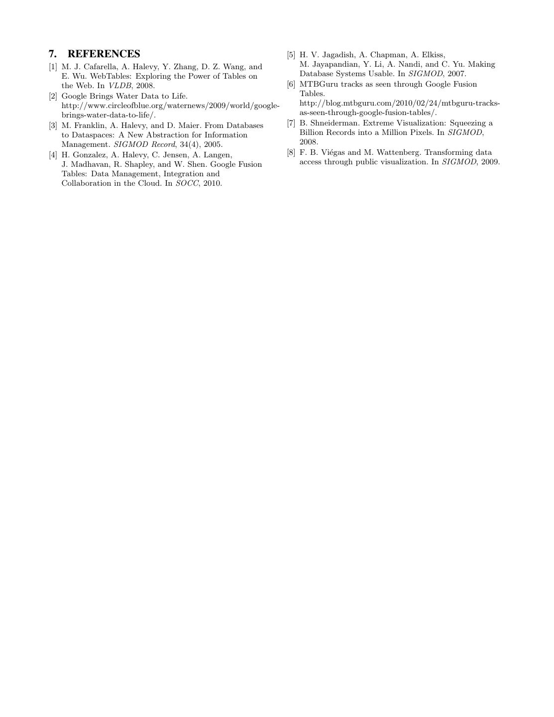 6 .7. REFERENCES [5] H. V. Jagadish, A. Chapman, A. Elkiss, [1] M. J. Cafarella, A. Halevy, Y. Zhang, D. Z. Wang, and M. Jayapandian, Y. Li, A. Nandi, and C. Yu. Making E. Wu. WebTables: Exploring the Power of Tables on Database Systems Usable. In SIGMOD, 2007. the Web. In VLDB, 2008. [6] MTBGuru tracks as seen through Google Fusion [2] Google Brings Water Data to Life. Tables. http://www.circleofblue.org/waternews/2009/world/google- http://blog.mtbguru.com/2010/02/24/mtbguru-tracks- brings-water-data-to-life/. as-seen-through-google-fusion-tables/. [3] M. Franklin, A. Halevy, and D. Maier. From Databases [7] B. Shneiderman. Extreme Visualization: Squeezing a to Dataspaces: A New Abstraction for Information Billion Records into a Million Pixels. In SIGMOD, Management. SIGMOD Record, 34(4), 2005. 2008. [4] H. Gonzalez, A. Halevy, C. Jensen, A. Langen, [8] F. B. Vi´egas and M. Wattenberg. Transforming data J. Madhavan, R. Shapley, and W. Shen. Google Fusion access through public visualization. In SIGMOD, 2009. Tables: Data Management, Integration and Collaboration in the Cloud. In SOCC, 2010.