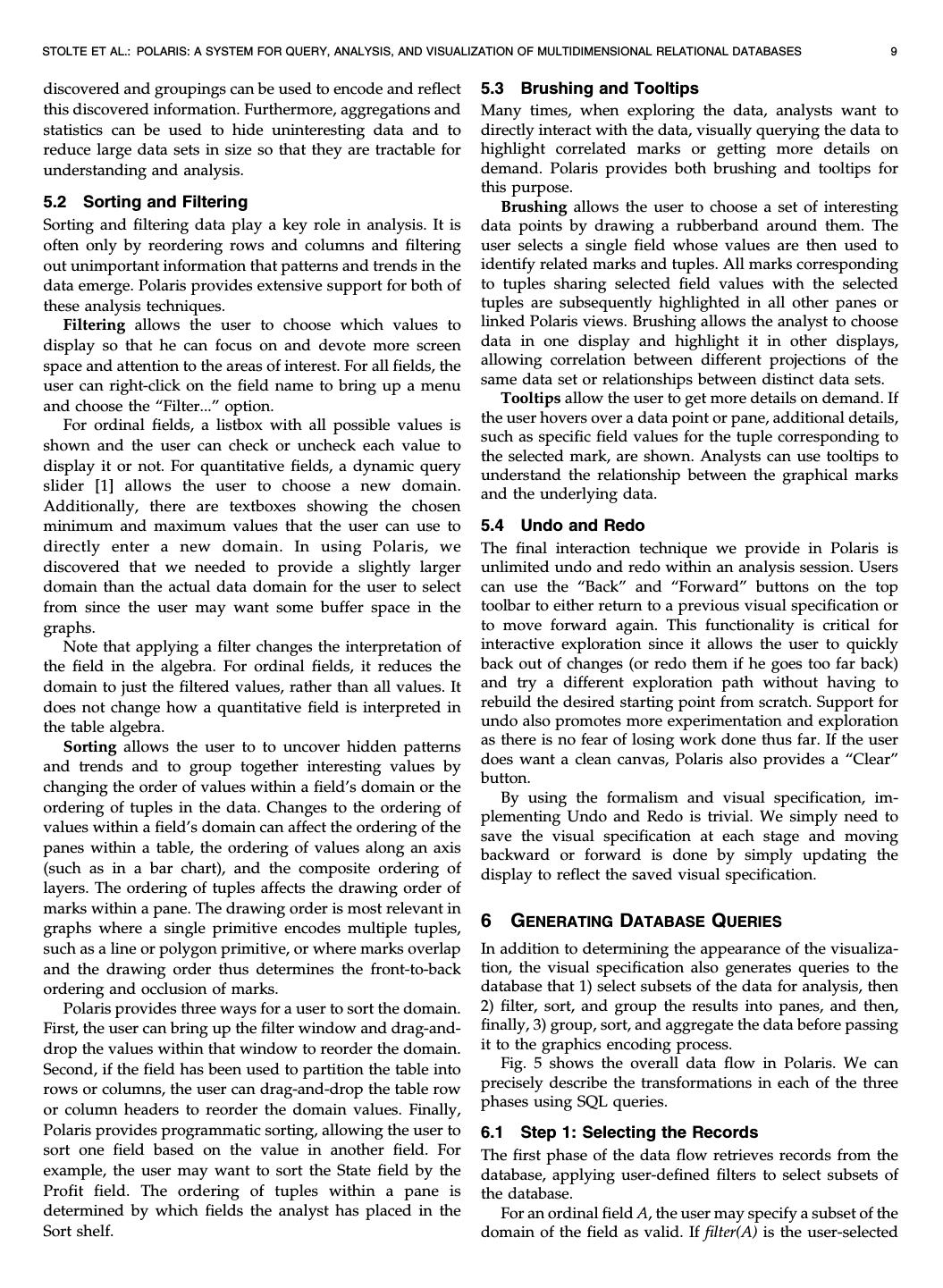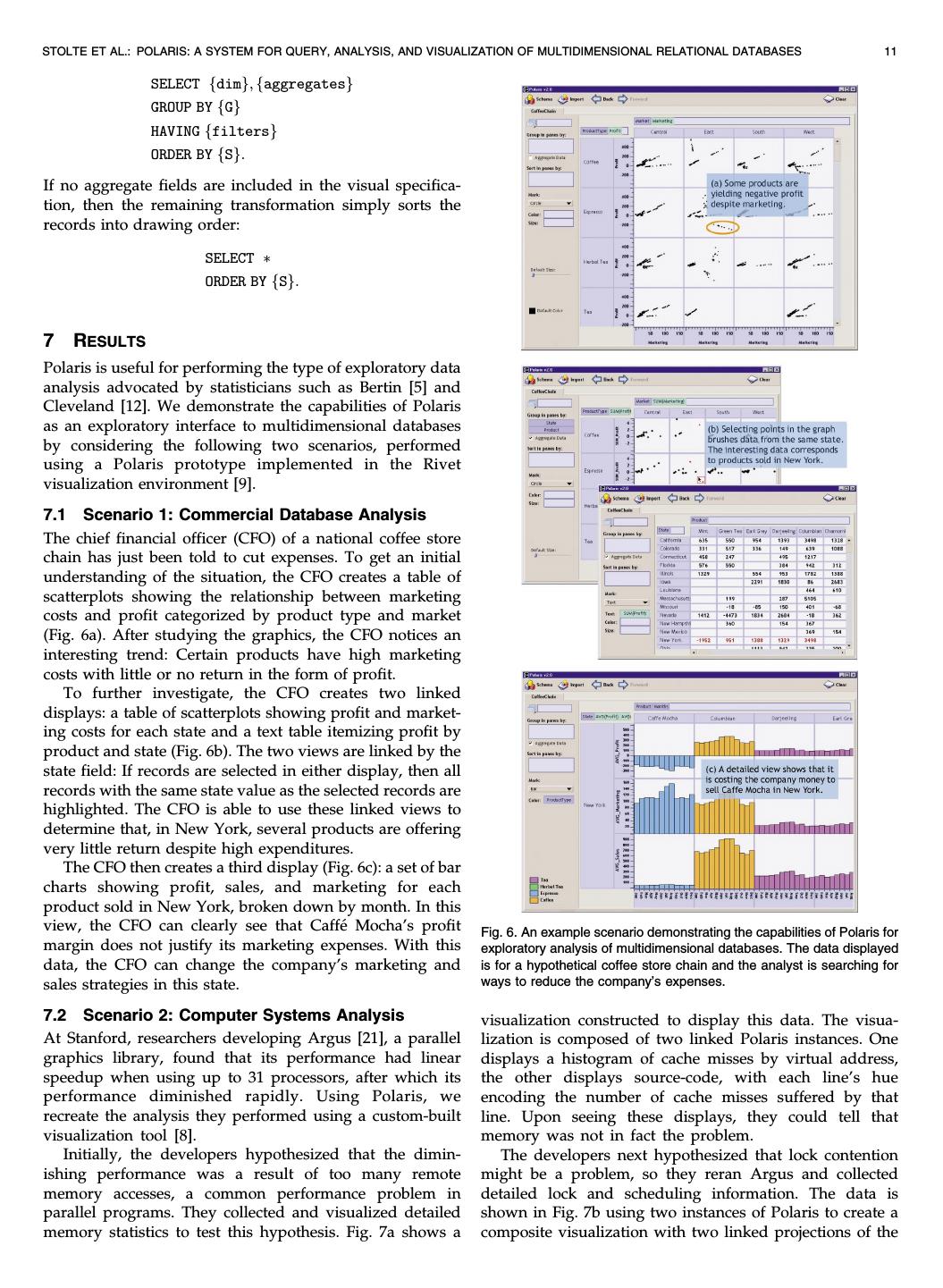 12 .12 IEEE TRANSACTIONS ON VISUALIZATION AND COMPUTER GRAPHICS, VOL. 8, NO. 1, JANUARY-MARCH 2002 lock requests correspond to descheduled periods for most processes. One process, however, has a descheduled period corresponding to a period during which the lock was held. This behavior, which was due to a bug in the operating system, was the source of the performance issues. 7.3 Summary These two examples illustrate several important points about the exploratory process. Throughout the analyses, both what the data users want to see and how they want to see it change continually. Analysts first form hypoth- eses about the data and then create new views to perform tests and experiments to validate or disprove those hypotheses. Certain displays enable an understanding of overall trends, whereas others show causal relationships. As the analysts better understand the data, they may want to drill-down in the visible dimensions or display entirely different dimensions. Polaris supports this exploratory process through its visual interface. By formally categorizing the types of graphics, Polaris is able to provide a simple interface for rapidly generating a wide range of displays. This allows analysts to focus on the analysis task rather than the steps needed to retrieve and display the data. 8 DISCUSSION In this section, we focus on three points of discussion. First, we discuss how our work compares to that of Wilkinson [41], second, the interpretation of our visual specifications as database queries, and, finally, the interactivity and performance of Polaris. Several of the ideas in our specification are extensions of Wilkinson's [41] efforts to develop a grammar for statistical graphics. His grammar encapsulates both the statistical transformation of datasets and their mapping to graphic representations. The primary distinctions between Wilkinson's system and ours arise because of differences in the data models. We chose to focus on developing a tool for multidimensional relational databases and we decided to build as much of the system as possible using relational algebra. All of the data transformations required by our visual specifications can be precisely interpreted as standard SQL queries to OLAP Fig. 7. A scenario demonstrating how researchers use Polaris to analyze servers. Wilkinson instead intentionally uses a data model the performance problems of a parallel graphics library. that is not relational, citing shortcomings in the relational model's support for statistical analysis. Consequently, his same data. One projection shows a scatterplot of the start specification defines operations and function in terms of his own data model, consisting of variable sets and indexed cycle versus cycle duration for the lock events (requests and variables. holds). The second shows a histogram over time of initiated The differences in design are most apparent in the table lock events. The scatterplot shows that toward the end of algebra. As in our system, Wilkinson's table algebra the run, the duration of lock events (both holds and performs two functions: it provides database services such requests) were taking an unexpectedly long time. That as set operations and it specifies the layout of the tables and observation correlated with the histogram showing that the graphs. Since we use relational algebra for all our database number of lock requests peaked and then tailed off toward services, our algebra is different. For example, his blend the end of the run, indicating that this might be a fruitful operator performs both set union and may partition the area for further investigation. axes of a table; our concatenation operation is different since A third visualization, shown in Fig. 7c, shows the same it just performs partitioning. Another difference is in his data using Gantt charts to display both lock events and cross and nest operators: cross generates a 2D graphic and process scheduling events. This display shows that the long nest only a 1D graphic. We use a different mechanism