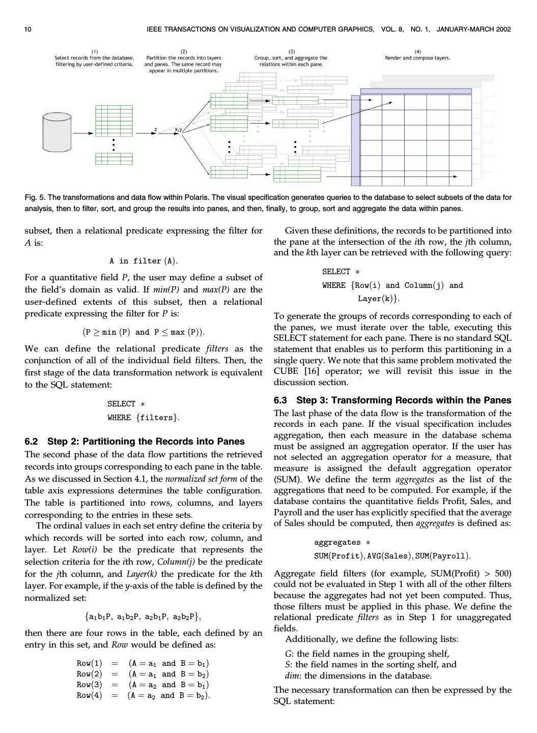 10 .10 IEEE TRANSACTIONS ON VISUALIZATION AND COMPUTER GRAPHICS, VOL. 8, NO. 1, JANUARY-MARCH 2002 Fig. 5. The transformations and data flow within Polaris. The visual specification generates queries to the database to select subsets of the data for analysis, then to filter, sort, and group the results into panes, and then, finally, to group, sort and aggregate the data within panes. subset, then a relational predicate expressing the filter for Given these definitions, the records to be partitioned into A is: the pane at the intersection of the ith row, the jth column, and the kth layer can be retrieved with the following query: A in filter A: SELECT à For a quantitative field P, the user may define a subset of WHERE fRow i and Column j and the field's domain as valid. If min(P) and max(P) are the user-defined extents of this subset, then a relational Layer kg: predicate expressing the filter for P is: To generate the groups of records corresponding to each of the panes, we must iterate over the table, executing this P ! min P and P max P: SELECT statement for each pane. There is no standard SQL We can define the relational predicate filters as the statement that enables us to perform this partitioning in a conjunction of all of the individual field filters. Then, the single query. We note that this same problem motivated the first stage of the data transformation network is equivalent CUBE [16] operator; we will revisit this issue in the to the SQL statement: discussion section. SELECT à 6.3 Step 3: Transforming Records within the Panes WHERE ffiltersg: The last phase of the data flow is the transformation of the records in each pane. If the visual specification includes aggregation, then each measure in the database schema 6.2 Step 2: Partitioning the Records into Panes must be assigned an aggregation operator. If the user has The second phase of the data flow partitions the retrieved not selected an aggregation operator for a measure, that records into groups corresponding to each pane in the table. measure is assigned the default aggregation operator As we discussed in Section 4.1, the normalized set form of the (SUM). We define the term aggregates as the list of the table axis expressions determines the table configuration. aggregations that need to be computed. For example, if the The table is partitioned into rows, columns, and layers database contains the quantitative fields Profit, Sales, and corresponding to the entries in these sets. Payroll and the user has explicitly specified that the average The ordinal values in each set entry define the criteria by of Sales should be computed, then aggregates is defined as: which records will be sorted into each row, column, and aggregates à layer. Let Row(i) be the predicate that represents the SUM Profit; AVG Sales; SUM Payroll: selection criteria for the ith row, Column(j) be the predicate for the jth column, and Layer(k) the predicate for the kth Aggregate field filters (for example, SUM(Profit) > 500) layer. For example, if the y-axis of the table is defined by the could not be evaluated in Step 1 with all of the other filters normalized set: because the aggregates had not yet been computed. Thus, those filters must be applied in this phase. We define the fa1 b1 P; a1 b2 P; a2 b1 P; a2 b2 Pg; relational predicate filters as in Step 1 for unaggregated then there are four rows in the table, each defined by an fields. Additionally, we define the following lists: entry in this set, and Row would be defined as: G: the field names in the grouping shelf, Row 1 A a1 and B b1 S: the field names in the sorting shelf, and Row 2 A a1 and B b2 dim: the dimensions in the database. Row 3 A a2 and B b1 The necessary transformation can then be expressed by the Row 4 A a2 and B b2 : SQL statement:
