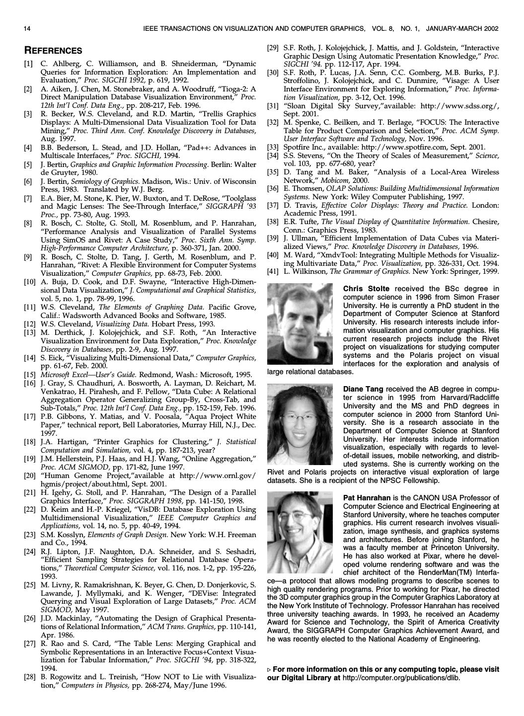 14 .14 IEEE TRANSACTIONS ON VISUALIZATION AND COMPUTER GRAPHICS, VOL. 8, NO. 1, JANUARY-MARCH 2002 REFERENCES [29] S.F. Roth, J. Kolojejchick, J. Mattis, and J. Goldstein, ªInteractive Graphic Design Using Automatic Presentation Knowledge,º Proc. [1] C. Ahlberg, C. Williamson, and B. Shneiderman, ªDynamic SIGCHI '94. pp. 112-117, Apr. 1994. Queries for Information Exploration: An Implementation and [30] S.F. Roth, P. Lucas, J.A. Senn, C.C. Gomberg, M.B. Burks, P.J. Evaluation,º Proc. SIGCHI 1992, p. 619, 1992. Stroffolino, J. Kolojejchick, and C. Dunmire, ªVisage: A User [2] A. Aiken, J. Chen, M. Stonebraker, and A. Woodruff, ªTioga-2: A Interface Environment for Exploring Information,º Proc. Informa- Direct Manipulation Database Visualization Environment,º Proc. tion Visualization, pp. 3-12, Oct. 1996. 12th Int'l Conf. Data Eng., pp. 208-217, Feb. 1996. [31] ªSloan Digital Sky Survey,ºavailable: http://www.sdss.org/, [3] R. Becker, W.S. Cleveland, and R.D. Martin, ªTrellis Graphics Sept. 2001. Displays: A Multi-Dimensional Data Visualization Tool for Data [32] M. Spenke, C. Beilken, and T. Berlage, ªFOCUS: The Interactive Mining,º Proc. Third Ann. Conf. Knowledge Discovery in Databases, Table for Product Comparison and Selection,º Proc. ACM Symp. Aug. 1997. User Interface Software and Technology, Nov. 1996. [4] B.B. Bederson, L. Stead, and J.D. Hollan, ªPad++: Advances in [33] Spotfire Inc., available: http://www.spotfire.com, Sept. 2001. Multiscale Interfaces,º Proc. SIGCHI, 1994. [34] S.S. Stevens, ªOn the Theory of Scales of Measurement,º Science, [5] J. Bertin, Graphics and Graphic Information Processing. Berlin: Walter vol. 103, pp. 677-680, year? de Gruyter, 1980. [35] D. Tang and M. Baker, ªAnalysis of a Local-Area Wireless [6] J. Bertin, Semiology of Graphics. Madison, Wis.: Univ. of Wisconsin Network,º Mobicom, 2000. Press, 1983. Translated by W.J. Berg. [36] E. Thomsen, OLAP Solutions: Building Multidimensional Information [7] E.A. Bier, M. Stone, K. Pier, W. Buxton, and T. DeRose, ªToolglass Systems. New York: Wiley Computer Publishing, 1997. and Magic Lenses: The See-Through Interface,º SIGGRAPH '93 [37] D. Travis, Effective Color Displays: Theory and Practice. London: Proc., pp. 73-80, Aug. 1993. Academic Press, 1991. [8] R. Bosch, C. Stolte, G. Stoll, M. Rosenblum, and P. Hanrahan, [38] E.R. Tufte, The Visual Display of Quantitative Information. Chesire, ªPerformance Analysis and Visualization of Parallel Systems Conn.: Graphics Press, 1983. Using SimOS and Rivet: A Case Study,º Proc. Sixth Ann. Symp. [39] J. Ullman, ªEfficient Implementation of Data Cubes via Materi- High-Performance Computer Architecture, p. 360-371, Jan. 2000. alized Views,º Proc. Knowledge Discovery in Databases, 1996. [9] R. Bosch, C. Stolte, D. Tang, J. Gerth, M. Rosenblum, and P. [40] M. Ward, ªXmdvTool: Integrating Multiple Methods for Visualiz- Hanrahan, ªRivet: A Flexible Environment for Computer Systems ing Multivariate Data,º Proc. Visualization, pp. 326-331, Oct. 1994. Visualization,º Computer Graphics, pp. 68-73, Feb. 2000. [41] L. Wilkinson, The Grammar of Graphics. New York: Springer, 1999. [10] A. Buja, D. Cook, and D.F. Swayne, ªInteractive High-Dimen- sional Data Visualization,º J. Computational and Graphical Statistics, Chris Stolte received the BSc degree in vol. 5, no. 1, pp. 78-99, 1996. computer science in 1996 from Simon Fraser [11] W.S. Cleveland, The Elements of Graphing Data. Pacific Grove, University. He is currently a PhD student in the Calif.: Wadsworth Advanced Books and Software, 1985. Department of Computer Science at Stanford [12] W.S. Cleveland, Visualizing Data. Hobart Press, 1993. University. His research interests include infor- [13] M. Derthick, J. Kolojejchick, and S.F. Roth, ªAn Interactive mation visualization and computer graphics. His Visualization Environment for Data Exploration,º Proc. Knowledge current research projects include the Rivet Discovery in Databases, pp. 2-9, Aug. 1997. project on visualizations for studying computer [14] S. Eick, ªVisualizing Multi-Dimensional Data,º Computer Graphics, systems and the Polaris project on visual pp. 61-67, Feb. 2000. interfaces for the exploration and analysis of [15] Microsoft ExcelÐUser's Guide. Redmond, Wash.: Microsoft, 1995. large relational databases. [16] J. Gray, S. Chaudhuri, A. Bosworth, A. Layman, D. Reichart, M. Venkatrao, H. Pirahesh, and F. Pellow, ªData Cube: A Relational Diane Tang received the AB degree in compu- Aggregation Operator Generalizing Group-By, Cross-Tab, and ter science in 1995 from Harvard/Radcliffe Sub-Totals,º Proc. 12th Int'l Conf. Data Eng., pp. 152-159, Feb. 1996. University and the MS and PhD degrees in [17] P.B. Gibbons, Y. Matias, and V. Poosala, ªAqua Project White computer science in 2000 from Stanford Uni- Paper,º technical report, Bell Laboratories, Murray Hill, N.J., Dec. versity. She is a research associate in the 1997. Department of Computer Science at Stanford [18] J.A. Hartigan, ªPrinter Graphics for Clustering,º J. Statistical University. Her interests include information Computation and Simulation, vol. 4, pp. 187-213, year? visualization, especially with regards to level- [19] J.M. Hellerstein, P.J. Haas, and H.J. Wang, ªOnline Aggregation,º of-detail issues, mobile networking, and distrib- Proc. ACM SIGMOD, pp. 171-82, June 1997. uted systems. She is currently working on the [20] ªHuman Genome Project,ºavailable at http://www.ornl.gov/ Rivet and Polaris projects on interactive visual exploration of large hgmis/project/about.html, Sept. 2001. datasets. She is a recipient of the NPSC Fellowship. [21] H. Igehy, G. Stoll, and P. Hanrahan, ªThe Design of a Parallel Graphics Interface,º Proc. SIGGRAPH 1998, pp. 141-150, 1998. Pat Hanrahan is the CANON USA Professor of [22] D. Keim and H.-P. Kriegel, ªVisDB: Database Exploration Using Computer Science and Electrical Engineering at Multidimensional Visualization,º IEEE Co