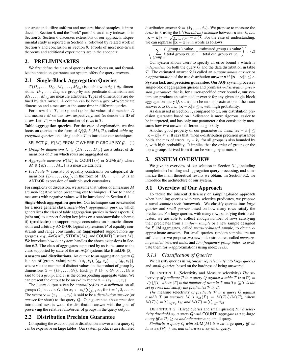 3 .construct and utilize uniform and measure-biased samples, is intro- distribution answer xˆ= x ˆ1 , . . . , x ˆr . We propose to measure the duced in Section 4, and the “seek” part, i.e., auxiliary indexes, is in ˆ using the L2 (Euclidean)-distance between x and x error in x ˆ , i.e., r Section 5. Section 6 discusses extensions of our approach. Exper- x−x ˆ 2 = i=1 (xi − x ˆi )2 . For the ease of understanding, imental study is reported in Section 7, followed by related work in we can rephrase x − x ˆ 2 in words as follows: Section 8 and conclusion in Section 9. Proofs of most non-trivial group i’s value estimated group i’s value 2 theorems and additional experiments are in the appendix. − . (2) total group value total est. group value group i 2. PRELIMINARIES Our system allows users to specify an error bound which is We first define the class of queries that we focus on, and formal- independent on both the query Q and the data distribution in table ize the precision guarantee our system offers for query answers. T . The estimated answer x ˆ is called an -approximate answer or -approximation of the true distribution answer x if x − x ˆ 2≤ . 2.1 Single-Block Aggregation Queries System task and precision guarantee. Our AQP system processes T (D1 , . . . , DdC , M1 , . . . , MdM ) is a table with dC + dM dimen- single-block aggregation queries and promises -distribution preci- sions. D1 , . . . , DdC are group-by and predicate dimensions and sion guarantee: that is, for a user-specified error bound , our sys- M1 , . . . , MdM are measure attributes. Types of dimensions are de- tem can produce an estimated answer x ˆ for any given single-block fined by data owner. A column can be both a group-by/predicate aggregation query Q, s.t. xˆ must be an -approximation of the exact dimension and a measure at the same time in different queries. answer x to Q, i.e., x − x ˆ 2 ≤ , with high probability. For a row t ∈ T , let tD and tM be the values of dimension D As discussed in Section 1, compared to CI, our distribution pre- and measure M on this row, respectively, and tID denote the ID of cision guarantee based on L2 -distance is more rigorous, easier to a row. Let |T | = n be the number of rows in T . be interpreted, and has only one parameter that consistently mea- Table aggregation queries. For the ease of explanation, we first sures how two answers differentiate globally. focus on queries in the form of Q(G, F (M ), P), called table ag- Another good property of our guarantee is: maxi |xi − x ˆi | ≤ gregation queries, on a single table T to introduce our techniques: x−x ˆ 2 ≤ . It says that, when -distribution precision guarantee holds, the max of errors |xi − x ˆi | for all groups is also bounded by SELECT G, F (M ) FROM T WHERE P GROUP BY G. (1) , with high probability. It implies that the order of groups or the • Group-by dimensions G ⊆ {D1 , . . . , DdC } are a subset of di- top-k groups derived from x ˆ can be wrong by at most . mensions of T on which rows are aggregated on. • Aggregate measure F (M ) is COUNT(∗) or SUM(M ) where 3. SYSTEM OVERVIEW M ∈ {M1 , . . . , Mm } is a measure attribute. We give an overview of our solution in Section 3.1, including • Predicate P consists of equality constraints on categorical di- sample/index building and aggregation query processing, and sum- mensions {D1 , . . . , DdC }, in the form of “Di = vi ”. P is an marize the main theoretical results we obtain. In Section 3.2, we AND-OR expression of multiple such constraints. introduce the architecture of our system. For simplicity of discussion, we assume that values of a measure M 3.1 Overview of Our Approach are non-negative when presenting our techniques. How to handle To tackle the inherent deficiency of sampling-based approach measures with negative values will be introduced in Section 6.1 . when handling queries with very selective predicates, we propose Single-block aggregation queries. Our techniques can be extended a novel sample+seek framework. We classify queries into large for a more general class, single-block aggregation queries, which queries and small queries based on how many rows satisfy the generalizes the class of table aggregation queries in three aspects: i) predicates. For large queries, with many rows satisfying their pred- (schema) to support foreign key joins on a star/snowflake schema; icates, we are able to collect enough number of rows satisfying ii) (predicates) to support range constraints on numeric dimen- their predicates from a uniform sample or a new sample designed sions and arbitrary AND-OR logical expressions P of equality con- for SUM aggregates, called measure-biased sample, to obtain - straints and range constraints; iii) (aggregates) support more ag- approximate answers. For small queries, random samples are not gregates, e.g., AVG(M ), STDEV(M ), and COUNT(Distinct M ). sufficient, so we propose two new index structures, called measure- We introduce how our system handles the above extensions in Sec- augmented inverted index and low-frequency group index, to eval- tion 6.2. The class of aggregates supported by us is the same as the uate them for -approximations using index seeks. class supported by state of the art AQP systems like BlinkDB [5]. Answers and distributions. An output to an aggregation query Q 3.1.1 Classification of Queries is a set of (group, value)-pairs, {(g1 , z1 ), (g2 , z2 ), . . . , (gr , zr )}, We classify queries using (measure) selectivity into large queries where r is the number of distinct values on the product of group-by and small queries, based on the hardness of being answered. dimensions G = {G1 , . . . , Gl }. Each gi ∈ G1 × G2 × . . . Gl is D EFINITION 1. (Selectivity and Measure selectivity) The se- said to be a group, and zi is the corresponding aggregate value. We lectivity of predicate P in a query Q against a table T is s(P) = can present the output to be 