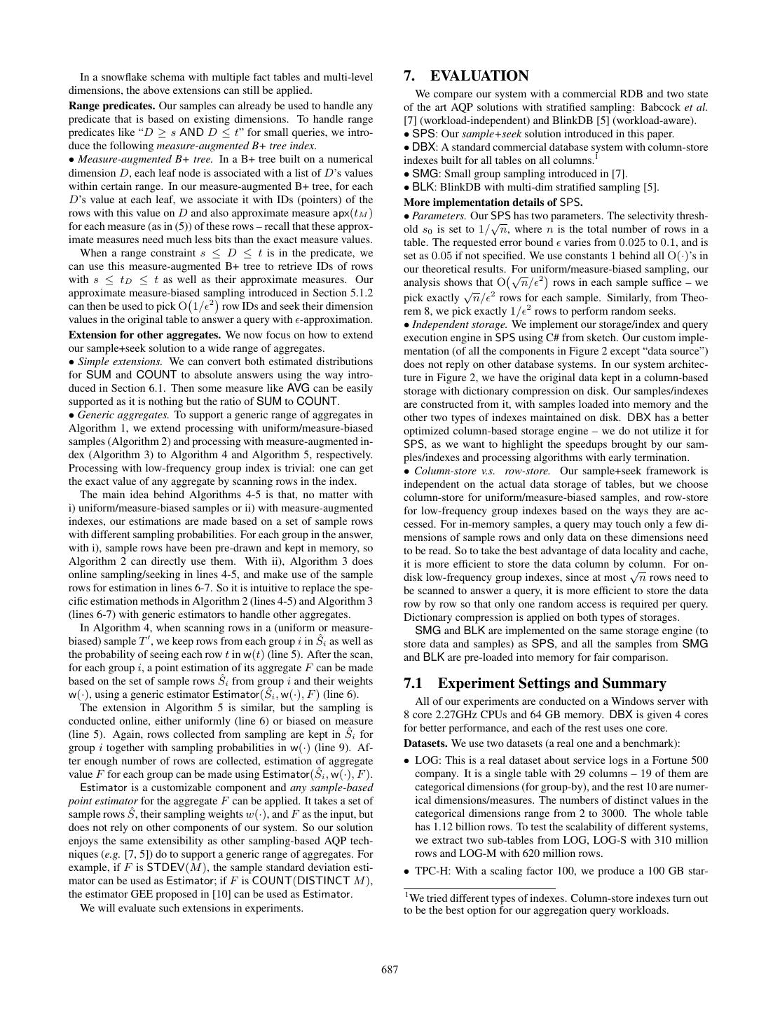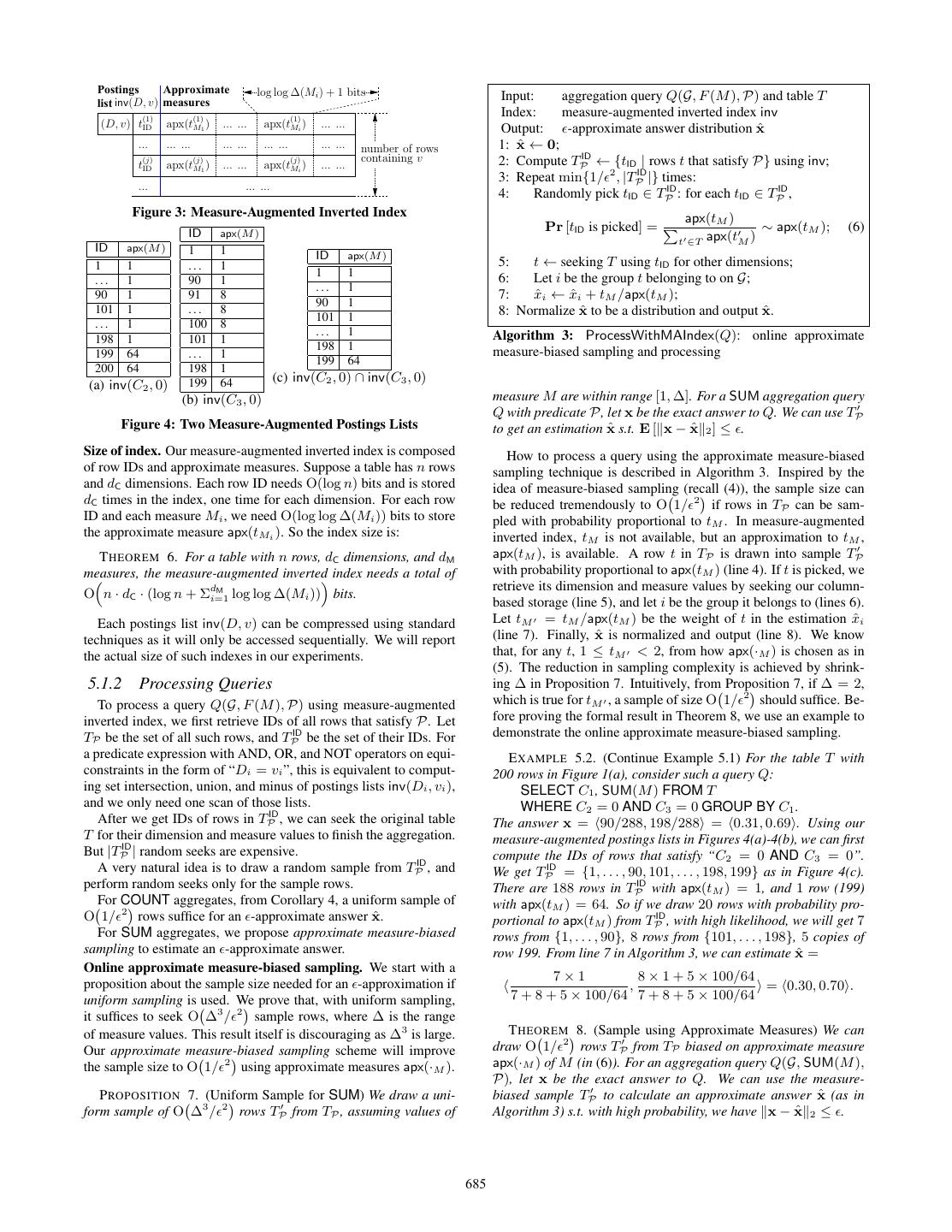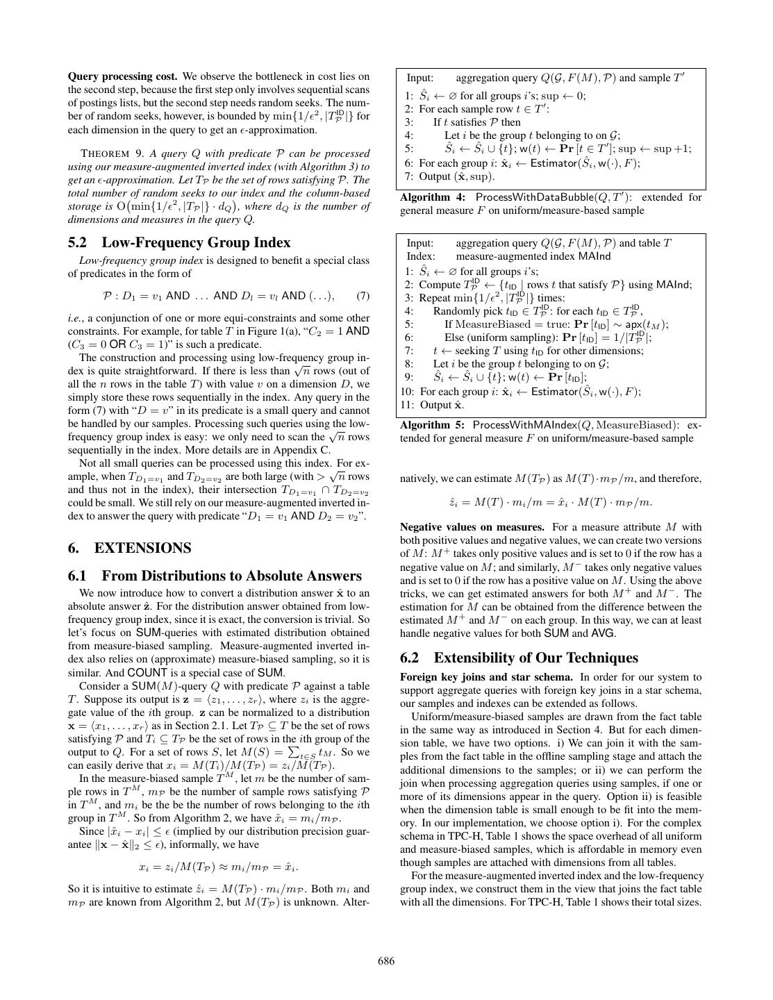 8 .Query processing cost. We observe the bottleneck in cost lies on Input: aggregation query Q(G, F (M ), P) and sample T the second step, because the first step only involves sequential scans 1: Sˆi ← ∅ for all groups i’s; sup ← 0; of postings lists, but the second step needs random seeks. The num- 2: For each sample row t ∈ T : ber of random seeks, however, is bounded by min{1/ 2 , |TPID |} for 3: If t satisfies P then each dimension in the query to get an -approximation. 4: Let i be the group t belonging to on G; T HEOREM 9. A query Q with predicate P can be processed 5: Sˆi ← Sˆi ∪ {t}; w(t) ← Pr [t ∈ T ]; sup ← sup +1; using our measure-augmented inverted index (with Algorithm 3) to 6: For each group i: x ˆ i ← Estimator(Sˆi , w(·), F ); get an -approximation. Let TP be the set of rows satisfying P. The 7: Output (ˆ x, sup). total number of random seeks to our index and the column-based Algorithm 4: ProcessWithDataBubble(Q, T ): extended for storage is O min{1/ 2 , |TP |} · dQ , where dQ is the number of general measure F on uniform/measure-based sample dimensions and measures in the query Q. 5.2 Low-Frequency Group Index Input: aggregation query Q(G, F (M ), P) and table T Low-frequency group index is designed to benefit a special class Index: measure-augmented index MAInd of predicates in the form of 1: Sˆi ← ∅ for all groups i’s; 2: Compute TPID ← {tID | rows t that satisfy P} using MAInd; P : D1 = v1 AND . . . AND Dl = vl AND (. . .), (7) 3: Repeat min{1/ 2 , |TPID |} times: 4: Randomly pick tID ∈ TPID : for each tID ∈ TPID , i.e., a conjunction of one or more equi-constraints and some other 5: If MeasureBiased = true: Pr [tID ] ∼ apx(tM ); constraints. For example, for table T in Figure 1(a), “C2 = 1 AND 6: Else (uniform sampling): Pr [tID ] = 1/|TPID |; (C3 = 0 OR C3 = 1)” is such a predicate. 7: t ← seeking T using tID for other dimensions; The construction and processing using low-frequency √ group in- 8: Let i be the group t belonging to on G; dex is quite straightforward. If there is less than n rows (out of 9: Sˆi ← Sˆi ∪ {t}; w(t) ← Pr [tID ]; all the n rows in the table T ) with value v on a dimension D, we simply store these rows sequentially in the index. Any query in the 10: For each group i: x ˆ i ← Estimator(Sˆi , w(·), F ); form (7) with “D = v” in its predicate is a small query and cannot 11: Output x ˆ. be handled by our samples. Processing such queries using√the low- Algorithm 5: ProcessWithMAIndex(Q, MeasureBiased): ex- frequency group index is easy: we only need to scan the n rows tended for general measure F on uniform/measure-based sample sequentially in the index. More details are in Appendix C. Not all small queries can be processed using this index.√For ex- ample, when TD1 =v1 and TD2 =v2 are both large (with > n rows natively, we can estimate M (TP ) as M (T )·mP /m, and therefore, and thus not in the index), their intersection TD1 =v1 ∩ TD2 =v2 could be small. We still rely on our measure-augmented inverted in- zˆi = M (T ) · mi /m = x ˆi · M (T ) · mP /m. dex to answer the query with predicate “D1 = v1 AND D2 = v2 ”. Negative values on measures. For a measure attribute M with both positive values and negative values, we can create two versions 6. EXTENSIONS of M : M + takes only positive values and is set to 0 if the row has a negative value on M ; and similarly, M − takes only negative values 6.1 From Distributions to Absolute Answers and is set to 0 if the row has a positive value on M . Using the above We now introduce how to convert a distribution answer x ˆ to an tricks, we can get estimated answers for both M + and M − . The absolute answer z ˆ. For the distribution answer obtained from low- estimation for M can be obtained from the difference between the frequency group index, since it is exact, the conversion is trivial. So estimated M + and M − on each group. In this way, we can at least let’s focus on SUM-queries with estimated distribution obtained handle negative values for both SUM and AVG. from measure-biased sampling. Measure-augmented inverted in- dex also relies on (approximate) measure-biased sampling, so it is 6.2 Extensibility of Our Techniques similar. And COUNT is a special case of SUM. Foreign key joins and star schema. In order for our system to Consider a SUM(M )-query Q with predicate P against a table support aggregate queries with foreign key joins in a star schema, T . Suppose its output is z = z1 , . . . , zr , where zi is the aggre- our samples and indexes can be extended as follows. gate value of the ith group. z can be normalized to a distribution Uniform/measure-biased samples are drawn from the fact table x = x1 , . . . , xr as in Section 2.1. Let TP ⊆ T be the set of rows in the same way as introduced in Section 4. But for each dimen- satisfying P and Ti ⊆ TP be the set of rows in the ith group of the sion table, we have two options. i) We can join it with the sam- output to Q. For a set of rows S, let M (S) = t∈S tM . So we ples from the fact table in the offline sampling stage and attach the can easily derive that xi = M (Ti )/M (TP ) = zi /M (TP ). additional dimensions to the samples; or ii) we can perform the In the measure-biased sample T M , let m be the number of sam- join when processing aggregation queries using samples, if one or ple rows in T M , mP be the number of sample rows satisfying P more of its dimensions appear in the query. Option ii) is feasible in T M , and mi be the be the number of rows belonging to the ith when the dimension table is small enough to be fit into the mem- group in T M . So from Algorithm 2, we have x ˆi = mi /mP . ory. In our implementation, we choose option i). For the complex Since |ˆ xi − xi | ≤ (implied by our distribution precision guar- schema in TPC-H, Table 1 shows the space overhead of all uniform antee x − x ˆ 2 ≤ ), informally, we have and measure-bias
