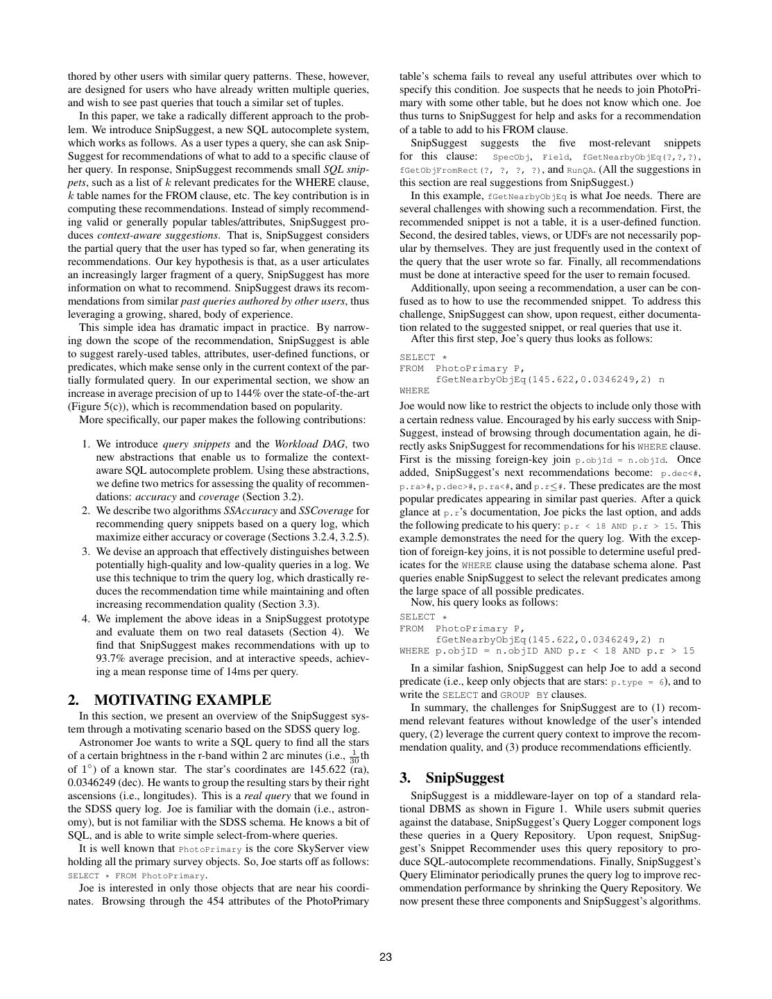 2 .thored by other users with similar query patterns. These, however, table’s schema fails to reveal any useful attributes over which to are designed for users who have already written multiple queries, specify this condition. Joe suspects that he needs to join PhotoPri- and wish to see past queries that touch a similar set of tuples. mary with some other table, but he does not know which one. Joe In this paper, we take a radically different approach to the prob- thus turns to SnipSuggest for help and asks for a recommendation lem. We introduce SnipSuggest, a new SQL autocomplete system, of a table to add to his FROM clause. which works as follows. As a user types a query, she can ask Snip- SnipSuggest suggests the five most-relevant snippets Suggest for recommendations of what to add to a specific clause of for this clause: SpecObj, Field, fGetNearbyObjEq(?,?,?), her query. In response, SnipSuggest recommends small SQL snip- fGetObjFromRect(?, ?, ?, ?), and RunQA. (All the suggestions in pets, such as a list of k relevant predicates for the WHERE clause, this section are real suggestions from SnipSuggest.) k table names for the FROM clause, etc. The key contribution is in In this example, fGetNearbyObjEq is what Joe needs. There are computing these recommendations. Instead of simply recommend- several challenges with showing such a recommendation. First, the ing valid or generally popular tables/attributes, SnipSuggest pro- recommended snippet is not a table, it is a user-defined function. duces context-aware suggestions. That is, SnipSuggest considers Second, the desired tables, views, or UDFs are not necessarily pop- the partial query that the user has typed so far, when generating its ular by themselves. They are just frequently used in the context of recommendations. Our key hypothesis is that, as a user articulates the query that the user wrote so far. Finally, all recommendations an increasingly larger fragment of a query, SnipSuggest has more must be done at interactive speed for the user to remain focused. information on what to recommend. SnipSuggest draws its recom- Additionally, upon seeing a recommendation, a user can be con- mendations from similar past queries authored by other users, thus fused as to how to use the recommended snippet. To address this leveraging a growing, shared, body of experience. challenge, SnipSuggest can show, upon request, either documenta- This simple idea has dramatic impact in practice. By narrow- tion related to the suggested snippet, or real queries that use it. ing down the scope of the recommendation, SnipSuggest is able After this first step, Joe’s query thus looks as follows: to suggest rarely-used tables, attributes, user-defined functions, or SELECT * predicates, which make sense only in the current context of the par- FROM PhotoPrimary P, tially formulated query. In our experimental section, we show an fGetNearbyObjEq(145.622,0.0346249,2) n increase in average precision of up to 144% over the state-of-the-art WHERE (Figure 5(c)), which is recommendation based on popularity. Joe would now like to restrict the objects to include only those with More specifically, our paper makes the following contributions: a certain redness value. Encouraged by his early success with Snip- Suggest, instead of browsing through documentation again, he di- 1. We introduce query snippets and the Workload DAG, two rectly asks SnipSuggest for recommendations for his WHERE clause. new abstractions that enable us to formalize the context- First is the missing foreign-key join p.objId = n.objId. Once aware SQL autocomplete problem. Using these abstractions, added, SnipSuggest’s next recommendations become: p.dec<#, we define two metrics for assessing the quality of recommen- p.ra>#, p.dec>#, p.ra<#, and p.r≤#. These predicates are the most dations: accuracy and coverage (Section 3.2). popular predicates appearing in similar past queries. After a quick 2. We describe two algorithms SSAccuracy and SSCoverage for glance at p.r’s documentation, Joe picks the last option, and adds recommending query snippets based on a query log, which the following predicate to his query: p.r < 18 AND p.r > 15. This maximize either accuracy or coverage (Sections 3.2.4, 3.2.5). example demonstrates the need for the query log. With the excep- 3. We devise an approach that effectively distinguishes between tion of foreign-key joins, it is not possible to determine useful pred- potentially high-quality and low-quality queries in a log. We icates for the WHERE clause using the database schema alone. Past use this technique to trim the query log, which drastically re- queries enable SnipSuggest to select the relevant predicates among duces the recommendation time while maintaining and often the large space of all possible predicates. increasing recommendation quality (Section 3.3). Now, his query looks as follows: 4. We implement the above ideas in a SnipSuggest prototype SELECT * and evaluate them on two real datasets (Section 4). We FROM PhotoPrimary P, fGetNearbyObjEq(145.622,0.0346249,2) n find that SnipSuggest makes recommendations with up to WHERE p.objID = n.objID AND p.r < 18 AND p.r > 15 93.7% average precision, and at interactive speeds, achiev- ing a mean response time of 14ms per query. In a similar fashion, SnipSuggest can help Joe to add a second predicate (i.e., keep only objects that are stars: p.type = 6), and to write the SELECT and GROUP BY clauses. 2. MOTIVATING EXAMPLE In summary, the challenges for SnipSuggest are to (1) recom- In this section, we present an overview of the SnipSuggest sys- mend relevant features without knowledge of the user’s intended tem through a motivating scenario based on the SDSS query log. query, (2) leverage the current query context to improve the recom- Astronomer Joe wants to write a SQL query to find all the stars mendation quality, and (3) produce recommendations efficiently. 1 of a certain brightness in the r-band within 2 