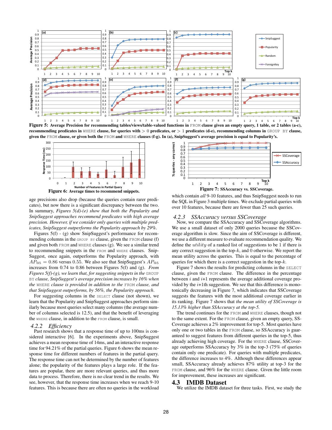 7 . $" $" $" 1)2' 1%2' 132' !#," !#," !#," !#+" !#+" Average Precision !#+" -./0-122345" !#*" !#*" !#*" !#)" !#)" !#)" 670189:/5;" !#(" !#(" !#(" !#'" !#'" !#'" <9.=7>" !#&" !#&" !#&" !#%" !#%" !#%" !#$" !#$" !#$" ?7:3/2.@3;" !" !" !" .,/'0' $" %" &" '" (" )" *" +" ," $!" $" %" &" '" (" )" *" +" ," $!" $" %" &" '" (" )" *" +" ," $!" $" $" $" $" 142' 1#2' 152' 1&2' !#," !#," !#," !#," !"#$%&#'($#)*+*,-' !#+" !#+" !#+" !#+" !#*" !#*" !#*" !#*" !#)" !#)" !#)" !#)" !#(" !#(" !#(" !#(" !#'" !#'" !#'" !#'" !#&" !#&" !#&" !#&" !#%" !#%" !#%" !#%" !#$" !#$" !#$" !#$" !" !" !" !" .,/'0' $" %" &" '" (" )" *" +" ," $!" $" %" &" '" (" )" *" +" ," $!" $" %" &" '" (" )" *" +" ," $!" $" %" &" '" (" )" *" +" ," $!" Figure 5: Average Precision for recommending tables/views/table-valued functions in FROM clause given an empty query, 1 table, or 2 tables (a-c), recommending predicates in WHERE clause, for queries with > 0 predicates, or > 1 predicates (d-e), recommending columns in GROUP BY clause, given the FROM clause, or given both the FROM and WHERE clauses (f-g). In (a), SnipSuggest’s average precision is equal to Popularity’s. &!!" !"#$%&'%(")"*+,"-.&&%-/"" $" %#!" !#," !"#$%&#"'()*"'+*#,' !#+" %!!" !#*" !#)" "--./012341" $#!" !#(" "--56672368" !#'" $!!" !#&" #!" !#%" !#$" !" !" 0.1"2" !" $" %" &" '" #" (" )" *" +" $!" $" %" &" '" (" )" *" +" ," $!" -.*/"0'%1'2"34.0"#')&'530637'8."09' Figure 6: Average times to recommend snippets. Figure 7: SSAccuracy vs. SSCoverage. which contain all 9-10 features, and thus SnipSuggest needs to run age precisions also drop (because the queries contain rarer predi- the SQL in Figure 3 multiple times. We exclude partial queries with cates), but now there is a significant discrepancy between the two. over 10 features, because there are fewer than 25 such queries. In summary, Figures 5(d)-(e) show that both the Popularity and SnipSuggest approaches recommend predicates with high average 4.2.3 SSAccuracy versus SSCoverage precision. However, if we consider only queries with multiple pred- Now, we compare the SSAccuracy and SSCoverage algorithms. icates, SnipSuggest outperforms the Popularity approach by 29%. We use a small dataset of only 2000 queries because the SSCov- Figures 5(f) - (g) show SnipSuggest’s performance for recom- erage algorithm is slow. Since the aim of SSCoverage is different, mending columns in the GROUP BY clause, given the FROM clause (f) we use a different measure to evaluate recommendation quality. We and given both FROM and WHERE clauses (g). We see a similar trend define the utility of a ranked list of suggestions to be 1 if there is to recommending snippets in the FROM and WHERE clauses. Snip- any correct suggestion in the top-k, and 0 otherwise. We report the Suggest, once again, outperforms the Popularity approach, with mean utility across the queries. This is equal to the percentage of AP@5 = 0.86 versus 0.55. We also see that SnipSuggest’s AP@5 queries for which there is a correct suggestion in the top-k. increases from 0.74 to 0.86 between Figures 5(f) and (g). From Figure 7 shows the results for predicting columns in the SELECT Figures 5(f)-(g), we learn that, for suggesting snippets in the GROUP clause, given the FROM clause. The difference in the percentage BY clause, SnipSuggest’s average precision increases by 16% when between i and i+1 represents the average additional coverage pro- the WHERE clause is provided in addition to the FROM clause, and vided by the i+1th suggestion. We see that this difference is mono- that SnipSuggest outperforms, by 56%, the Popularity approach. tonically decreasing in Figure 7, which indicates that SSCoverage For suggesting columns in the SELECT clause (not shown), we suggests the features with the most additional coverage earlier in learn that the Popularity and SnipSuggest approaches perform sim- its ranking. Figure 7 shows that the mean utility of SSCoverage is ilarly because most queries select many columns (the average num- 15.13% higher than SSAccuracy at the top-5. ber of columns selected is 12.5), and that the benefit of leveraging The trend continues for the FROM and WHERE clauses, though not the WHERE clause, in addition to the FROM clause, is small. to the same extent. For the FROM clause, given an empty query, SS- 4.2.2 Efficiency Coverage achieves a 2% improvement for top-5. Most queries have Past research shows that a response time of up to 100ms is con- only one or two tables in the FROM clause, so SSAccuracy is guar- sidered interactive [6]. In the experiments above, SnipSuggest anteed to suggest features from different queries in the top-5, thus achieves a mean response time of 14ms, and an interactive response already achieving high coverage. For the WHERE clause, SSCover- time for 94.21% of the partial queries. Figure 6 shows the mean re- age outperforms SSAccuracy by 3% in the top-3 (75% of queries sponse time for different numbers of features in the partial query. contain only one predicate). For queries with multiple predicates, The response time can not be determined by the number of features the difference increases to 4%. Although these differences appear alone; the popularity of the features plays a large role. If the fea- small, SSAccuracy already achieves 87% utility at top-3 for the tures are popular, there are more relevant queries, and thus more FROM clause, and 96% for the WHERE clause. Given the little room data to process. Therefore, there is no clear trend in the results. We for improvement, these increases are significant. see, however, that the response time increases when we reach 9-10 4.3 IMDB Dataset features. This is because there are often no queries in the workload We utilize the IMDB dataset for three tasks. First, we study the 28