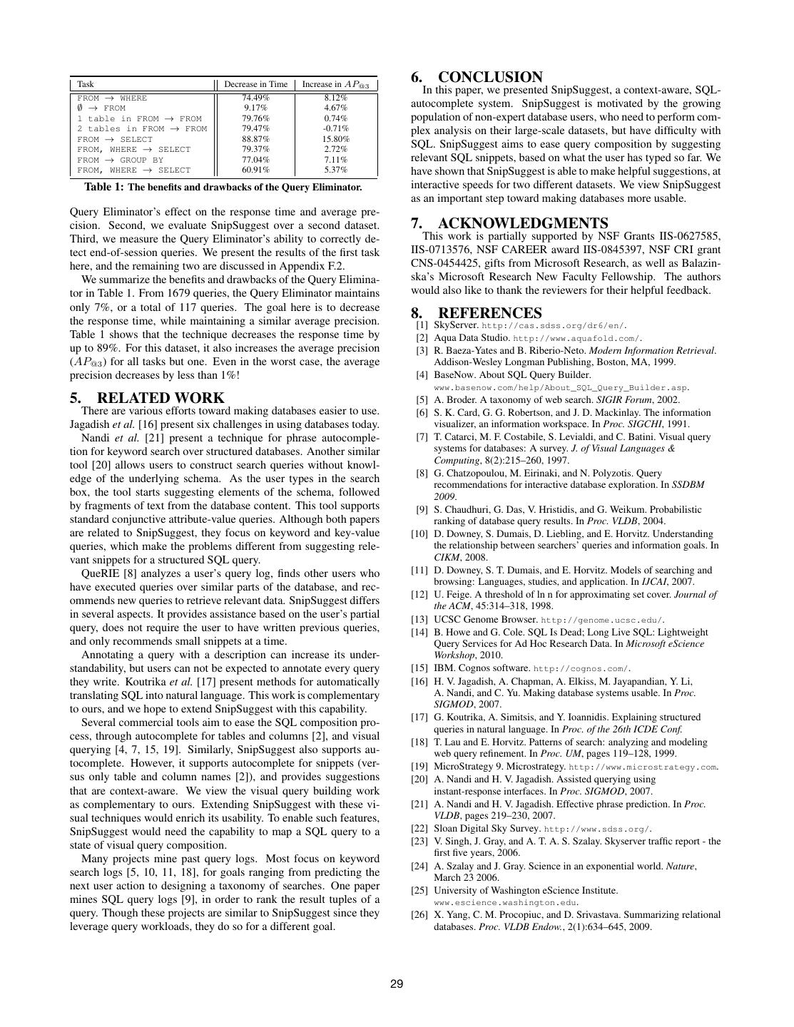 8 . Task Decrease in Time Increase in AP@3 6. CONCLUSION In this paper, we presented SnipSuggest, a context-aware, SQL- FROM → WHERE 74.49% 8.12% ∅ → FROM 9.17% 4.67% autocomplete system. SnipSuggest is motivated by the growing 1 table in FROM → FROM 79.76% 0.74% population of non-expert database users, who need to perform com- 2 tables in FROM → FROM 79.47% -0.71% plex analysis on their large-scale datasets, but have difficulty with FROM → SELECT 88.87% 15.80% FROM, WHERE → SELECT 79.37% 2.72% SQL. SnipSuggest aims to ease query composition by suggesting FROM → GROUP BY 77.04% 7.11% relevant SQL snippets, based on what the user has typed so far. We FROM, WHERE → SELECT 60.91% 5.37% have shown that SnipSuggest is able to make helpful suggestions, at Table 1: The benefits and drawbacks of the Query Eliminator. interactive speeds for two different datasets. We view SnipSuggest as an important step toward making databases more usable. Query Eliminator’s effect on the response time and average pre- cision. Second, we evaluate SnipSuggest over a second dataset. 7. ACKNOWLEDGMENTS Third, we measure the Query Eliminator’s ability to correctly de- This work is partially supported by NSF Grants IIS-0627585, tect end-of-session queries. We present the results of the first task IIS-0713576, NSF CAREER award IIS-0845397, NSF CRI grant here, and the remaining two are discussed in Appendix F.2. CNS-0454425, gifts from Microsoft Research, as well as Balazin- We summarize the benefits and drawbacks of the Query Elimina- ska’s Microsoft Research New Faculty Fellowship. The authors tor in Table 1. From 1679 queries, the Query Eliminator maintains would also like to thank the reviewers for their helpful feedback. only 7%, or a total of 117 queries. The goal here is to decrease the response time, while maintaining a similar average precision. 8. REFERENCES [1] SkyServer. http://cas.sdss.org/dr6/en/. Table 1 shows that the technique decreases the response time by [2] Aqua Data Studio. http://www.aquafold.com/. up to 89%. For this dataset, it also increases the average precision [3] R. Baeza-Yates and B. Riberio-Neto. Modern Information Retrieval. (AP@3 ) for all tasks but one. Even in the worst case, the average Addison-Wesley Longman Publishing, Boston, MA, 1999. precision decreases by less than 1%! [4] BaseNow. About SQL Query Builder. www.basenow.com/help/About_SQL_Query_Builder.asp. 5. RELATED WORK [5] A. Broder. A taxonomy of web search. SIGIR Forum, 2002. There are various efforts toward making databases easier to use. [6] S. K. Card, G. G. Robertson, and J. D. Mackinlay. The information Jagadish et al. [16] present six challenges in using databases today. visualizer, an information workspace. In Proc. SIGCHI, 1991. Nandi et al. [21] present a technique for phrase autocomple- [7] T. Catarci, M. F. Costabile, S. Levialdi, and C. Batini. Visual query tion for keyword search over structured databases. Another similar systems for databases: A survey. J. of Visual Languages & tool [20] allows users to construct search queries without knowl- Computing, 8(2):215–260, 1997. [8] G. Chatzopoulou, M. Eirinaki, and N. Polyzotis. Query edge of the underlying schema. As the user types in the search recommendations for interactive database exploration. In SSDBM box, the tool starts suggesting elements of the schema, followed 2009. by fragments of text from the database content. This tool supports [9] S. Chaudhuri, G. Das, V. Hristidis, and G. Weikum. Probabilistic standard conjunctive attribute-value queries. Although both papers ranking of database query results. In Proc. VLDB, 2004. are related to SnipSuggest, they focus on keyword and key-value [10] D. Downey, S. Dumais, D. Liebling, and E. Horvitz. Understanding queries, which make the problems different from suggesting rele- the relationship between searchers’ queries and information goals. In vant snippets for a structured SQL query. CIKM, 2008. QueRIE [8] analyzes a user’s query log, finds other users who [11] D. Downey, S. T. Dumais, and E. Horvitz. Models of searching and browsing: Languages, studies, and application. In IJCAI, 2007. have executed queries over similar parts of the database, and rec- [12] U. Feige. A threshold of ln n for approximating set cover. Journal of ommends new queries to retrieve relevant data. SnipSuggest differs the ACM, 45:314–318, 1998. in several aspects. It provides assistance based on the user’s partial [13] UCSC Genome Browser. http://genome.ucsc.edu/. query, does not require the user to have written previous queries, [14] B. Howe and G. Cole. SQL Is Dead; Long Live SQL: Lightweight and only recommends small snippets at a time. Query Services for Ad Hoc Research Data. In Microsoft eScience Annotating a query with a description can increase its under- Workshop, 2010. standability, but users can not be expected to annotate every query [15] IBM. Cognos software. http://cognos.com/. they write. Koutrika et al. [17] present methods for automatically [16] H. V. Jagadish, A. Chapman, A. Elkiss, M. Jayapandian, Y. Li, translating SQL into natural language. This work is complementary A. Nandi, and C. Yu. Making database systems usable. In Proc. to ours, and we hope to extend SnipSuggest with this capability. SIGMOD, 2007. [17] G. Koutrika, A. Simitsis, and Y. Ioannidis. Explaining structured Several commercial tools aim to ease the SQL composition pro- queries in natural language. In Proc. of the 26th ICDE Conf. cess, through autocomplete for tables and columns [2], and visual [18] T. Lau and E. Horvitz. Patterns of search: analyzing and modeling querying [4, 7, 15, 19]. Similarly, SnipSuggest also supports au- web query refinement. In Proc. UM, pages 119–128, 1999. tocomplete. However, it supports autocomplete for snippets (ver- [19] MicroStrategy 9. Microstrategy. http://www.microstrategy.com. sus only table and column names [2]), and provides suggestions [20] A. Nandi and H. V. Jagadish. Assisted