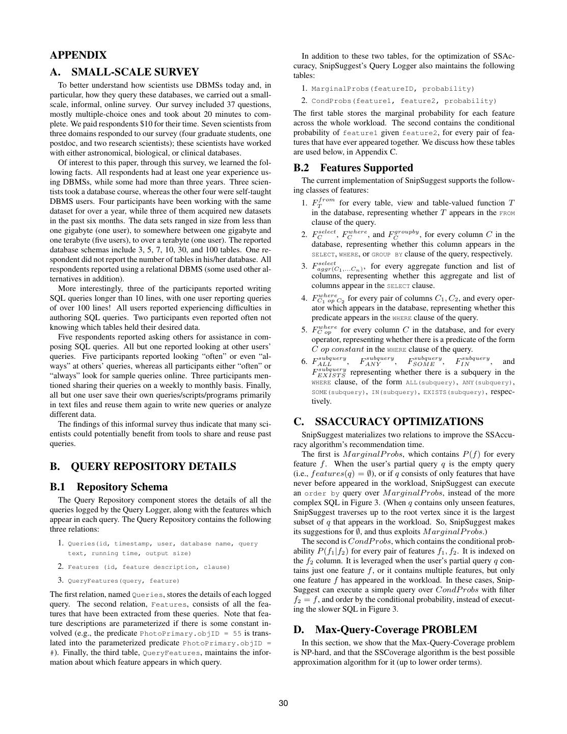 9 .APPENDIX In addition to these two tables, for the optimization of SSAc- curacy, SnipSuggest’s Query Logger also maintains the following A. SMALL-SCALE SURVEY tables: To better understand how scientists use DBMSs today and, in 1. MarginalProbs(featureID, probability) particular, how they query these databases, we carried out a small- scale, informal, online survey. Our survey included 37 questions, 2. CondProbs(feature1, feature2, probability) mostly multiple-choice ones and took about 20 minutes to com- The first table stores the marginal probability for each feature plete. We paid respondents $10 for their time. Seven scientists from across the whole workload. The second contains the conditional three domains responded to our survey (four graduate students, one probability of feature1 given feature2, for every pair of fea- postdoc, and two research scientists); these scientists have worked tures that have ever appeared together. We discuss how these tables with either astronomical, biological, or clinical databases. are used below, in Appendix C. Of interest to this paper, through this survey, we learned the fol- lowing facts. All respondents had at least one year experience us- B.2 Features Supported ing DBMSs, while some had more than three years. Three scien- The current implementation of SnipSuggest supports the follow- tists took a database course, whereas the other four were self-taught ing classes of features: DBMS users. Four participants have been working with the same 1. FTf rom for every table, view and table-valued function T dataset for over a year, while three of them acquired new datasets in the database, representing whether T appears in the FROM in the past six months. The data sets ranged in size from less than clause of the query. one gigabyte (one user), to somewhere between one gigabyte and 2. FCselect , FCwhere , and FCgroupby , for every column C in the one terabyte (five users), to over a terabyte (one user). The reported database, representing whether this column appears in the database schemas include 3, 5, 7, 10, 30, and 100 tables. One re- SELECT, WHERE, or GROUP BY clause of the query, respectively. spondent did not report the number of tables in his/her database. All select respondents reported using a relational DBMS (some used other al- 3. Faggr(C 1 ,...Cn ) , for every aggregate function and list of ternatives in addition). columns, representing whether this aggregate and list of More interestingly, three of the participants reported writing columns appear in the SELECT clause. SQL queries longer than 10 lines, with one user reporting queries 4. FCwhere 1 op C2 for every pair of columns C1 , C2 , and every oper- of over 100 lines! All users reported experiencing difficulties in ator which appears in the database, representing whether this authoring SQL queries. Two participants even reported often not predicate appears in the WHERE clause of the query. knowing which tables held their desired data. 5. FCwhere op for every column C in the database, and for every Five respondents reported asking others for assistance in com- operator, representing whether there is a predicate of the form posing SQL queries. All but one reported looking at other users’ C op constant in the WHERE clause of the query. queries. Five participants reported looking “often” or even “al- subquery subquery subquery subquery 6. FALL , FAN Y , FSOM E , FIN , and ways” at others’ queries, whereas all participants either “often” or subquery “always” look for sample queries online. Three participants men- FEXIST S representing whether there is a subquery in the WHERE clause, of the form ALL(subquery), ANY(subquery), tioned sharing their queries on a weekly to monthly basis. Finally, SOME(subquery), IN(subquery), EXISTS(subquery), respec- all but one user save their own queries/scripts/programs primarily in text files and reuse them again to write new queries or analyze tively. different data. The findings of this informal survey thus indicate that many sci- C. SSACCURACY OPTIMIZATIONS entists could potentially benefit from tools to share and reuse past SnipSuggest materializes two relations to improve the SSAccu- queries. racy algorithm’s recommendation time. The first is M arginalP robs, which contains P (f ) for every B. QUERY REPOSITORY DETAILS feature f . When the user’s partial query q is the empty query (i.e., f eatures(q) = ∅), or if q consists of only features that have never before appeared in the workload, SnipSuggest can execute B.1 Repository Schema an order by query over M arginalP robs, instead of the more The Query Repository component stores the details of all the complex SQL in Figure 3. (When q contains only unseen features, queries logged by the Query Logger, along with the features which SnipSuggest traverses up to the root vertex since it is the largest appear in each query. The Query Repository contains the following subset of q that appears in the workload. So, SnipSuggest makes three relations: its suggestions for ∅, and thus exploits M arginalP robs.) 1. Queries(id, timestamp, user, database name, query The second is CondP robs, which contains the conditional prob- text, running time, output size) ability P (f1 |f2 ) for every pair of features f1 , f2 . It is indexed on the f2 column. It is leveraged when the user’s partial query q con- 2. Features (id, feature description, clause) tains just one feature f , or it contains multiple features, but only 3. QueryFeatures(query, feature) one feature f has appeared in the workload. In these cases, Snip- Suggest can execute a simple query over CondP robs with filter The first relation, named Queries, stores the details of each logged f2 = f , and order by the conditional probability, instead of execut- query. The second relation, Features, consists of all the fea- ing the slower SQL in Figure 3. tures that have been extracted from these queries. Note that fea- ture descriptions are para