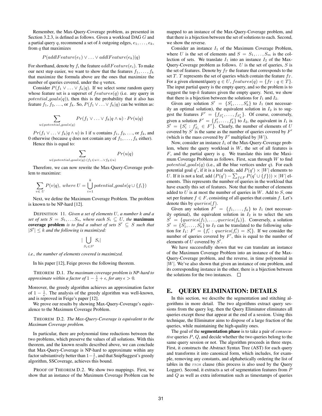 10 . Remember, the Max-Query-Coverage problem, as presented in mapped to an instance of the Max-Query-Coverage problem, and Section 3.2.3, is defined as follows. Given a workload DAG G and that there is a bijection between the set of solutions to each. Second, a partial query q, recommend a set of k outgoing edges, e1 , . . . , ek , we show the reverse. from q that maximizes Consider an instance I1 of the Maximum Coverage Problem, where U is the set of elements and S = S1 , . . . , Sm is the col- P (addlF eature(e1 ) ∨ . . . ∨ addlF eature(ek )|q) lection of sets. We translate I1 into an instance I2 of the Max- For shorthand, denote by fi the feature addlF eature(ei ). To make Query-Coverage problem as follows. U is the set of queries, S is our next step easier, we want to show that the features f1 , . . . , fk the set of features. Denote by fT the feature that corresponds to the that maximize the formula above are the ones that maximize the set T . T represents the set of queries which contain the feature fT . number of queries covered, under the q vertex. For a given element/query q ∈ U , f eatures(q) = {fT : q ∈ T }. Consider P (f1 ∨ . . . ∨ fk |q). If we select some random query The input partial query is the empty query, and so the problem is to whose feature set is a superset of f eatures(q) (i.e. any query in suggest the top-k features given the empty query. Next, we show potential goals(q)), then this is the probability that it also has that there is a bijection between the solutions for I1 and I2 . feature f1 , f2 , . . ., or fk . So, P (f1 ∨ . . . ∨ fk |q) can be written as: Given any solution S = {S1 , . . . , Sk } to I1 (not necessar- ily an optimal solution), the equivalent solution in I2 is to sug- gest the features F = {fS1 , . . . , fSk }. Of course, conversely, P r(f1 ∨ . . . ∨ fk |q ∧ u) · P r(u|q) given a solution F = {f1 , . . . , fk } to I2 , the equivalent in I1 is u∈potential goals(q) S = {Si : fSi ∈ F }. Clearly, the number of elements of U P r(f1 ∨ . . . ∨ fk |q ∧ u) is 1 if u contains f1 , f2 , . . ., or fk , and covered by S is the same as the number of queries covered by F 0 otherwise (because q does not contain any of f1 , . . . , fk either). (which is the mass covered by F multiplied by |W |). Hence this is equal to: Now, consider an instance I1 of the Max-Query-Coverage prob- lem, where the query workload is W , the set of all features is P r(u|q) F , and the partial query is q. We translate this into the Maxi- u∈potential goals(q):(f1 ∈u∨...∨fk ∈u) mum Coverage Problem as follows. First, scan through W to find potential goals(q) (i.e., all the blue vertices under q). For each Therefore, we can now rewrite the Max-Query-Coverage prob- potential goal q , if it is a leaf node, add P (q ) × |W | elements to lem to maximize: U . If it is not a leaf, add (P (q ) − f ∈F P (q ∪ {f })) × |W | el- k ements. This represents the number of queries in the workload that P (v|q), where U = potential goals(q ∪ {fi }) have exactly this set of features. Note that the number of elements v∈ U i=1 added to U is at most the number of queries in W . Add to S, one Next, we define the Maximum Coverage Problem. The problem set per feature f ∈ F , consisting of all queries that contain f . Let’s is known to be NP-hard [12]. denote this by queries(f ). Given any solution F = {f1 , . . . , fk } to I1 (not necessar- D EFINITION 11. Given a set of elements U , a number k and a ily optimal), the equivalent solution in I2 is to select the sets set of sets S = S1 , . . . Sn , where each Si ⊆ U , the maximum S = {queries(f1 ), . . . , queries(fk )}. Conversely, a solution coverage problem is to find a subset of sets S ⊆ S such that S = {S1 , . . . , Sk } to I2 can be translated to the following solu- |S | ≤ k and the following is maximized: tion for I1 : F = {fi : queries(fi ) = Si }. If we consider the number of queries covered by F , this is equal to the number of | Si | elements of U covered by S . Si ∈S We have successfully shown that we can translate an instance i.e., the number of elements covered is maximized. of the Maximum Coverage Problem into an instance of the Max- Query-Coverage problem, and the reverse, in time polynomial in In his paper [12], Feige proves the following theorem. |W |. We’ve also shown that given an instance of one problem, and its corresponding instance in the other, there is a bijection between T HEOREM D.1. The maximum coverage problem is NP-hard to the solutions for the two instances. approximate within a factor of 1 − 1e + , for any > 0. Moreover, the greedy algorithm achieves an approximation factor of 1 − 1e . The analysis of the greedy algorithm was well-known, E. QUERY ELIMINATION: DETAILS and is reproved in Feige’s paper [12]. In this section, we describe the segmentation and stitching al- We prove our results by showing Max-Query-Coverage’s equiv- gorithms in more detail. The two algorithms extract query ses- alence to the Maximum Coverage Problem. sions from the query log, then the Query Eliminator eliminates all queries except those that appear at the end of a session. Using this T HEOREM D.2. The Max-Query-Coverage is equivalent to the technique, the Eliminator aims to dispose of a large fraction of the Maximum Coverage problem. queries, while maintaining the high-quality ones. The goal of the segmentation phase is to take a pair of consecu- In particular, there are polynomial time reductions between the tive queries P , Q, and decide whether the two queries belong to the two problems, which preserve the values of all solutions. With this same query session or not. The algorithm proceeds in three steps. theorem, and the known results described above, we can conclude First, it constructs the Abstract Syntax Tree (AST) for each query that Max-Query-Coverage is NP-hard to approximate within any and transforms it into canonical form, which includes, for exam- factor substantiv