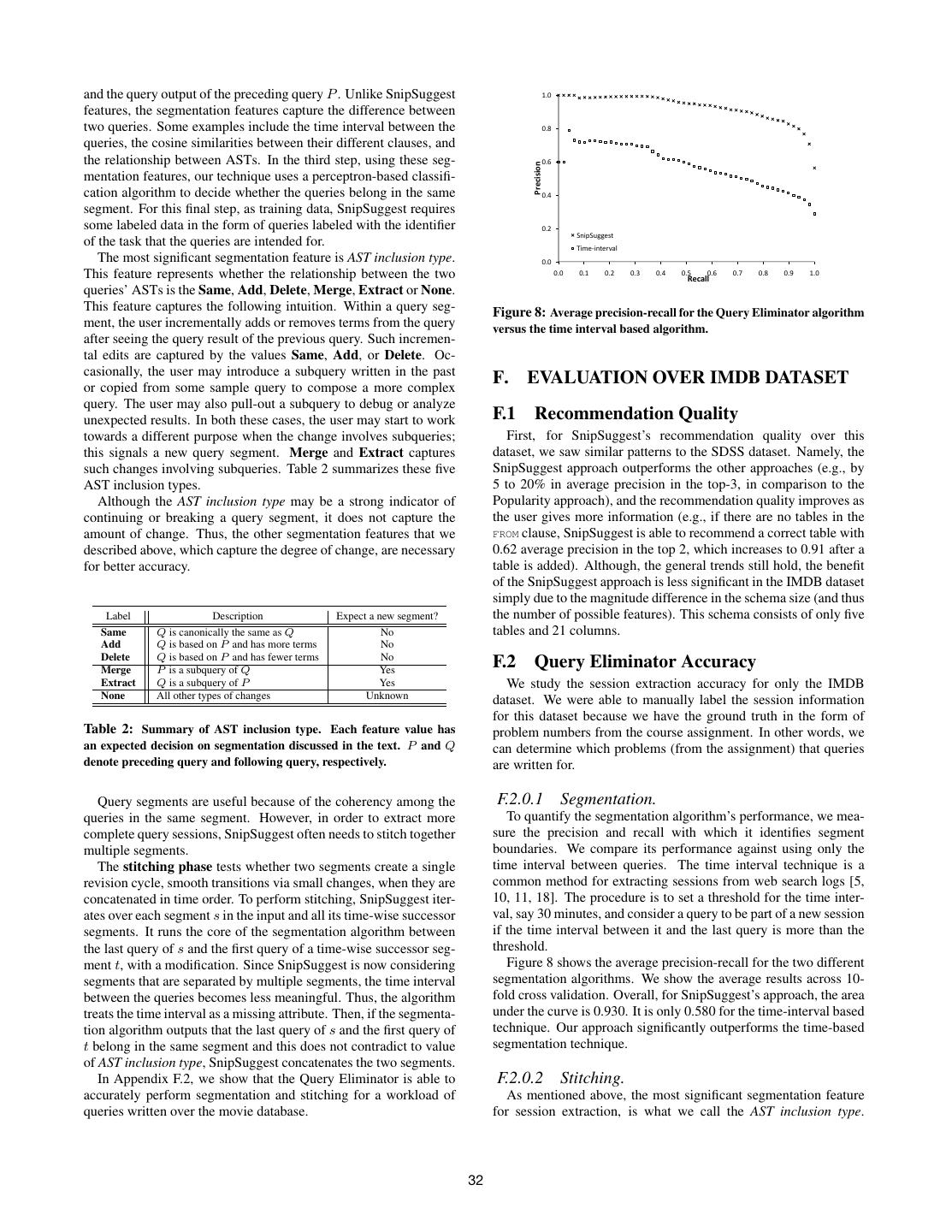 6 . (a) Query log This measure looks at the precision after each correct snippet is Segmentation included, and then takes their average. If a correct snippet is not included in the top-k, it contributes a precision of zero. The ben- (b) Session segments efit of using this approach, instead of recall or precision, is that it Stitching rewards the techniques that put the correct snippets near the top of the list. For an example, we refer the reader to Appendix G. (c) Query sessions 4.2 SDSS Dataset Figure 4: Extracting query sessions from the query log. We first evaluate SnipSuggest on the real SDSS dataset. description of the two algorithms in Appendix E. We also show 4.2.1 Quality of Recommendations that our technique is able to more accurately segment a query log We evaluate several aspects of SnipSuggest: its ability to rec- into sessions, in comparison to a time-interval-based technique. ommend relations, views and tables-valued functions in the FROM clause, predicates in the WHERE clause, columns and aggregates in 4. EVALUATION the SELECT clause, and columns in the GROUP BY clause. We evalu- We evaluate SnipSuggest over two datasets. The first consists ate only the SSAccuracy algorithm here because it is able to achieve of queries from the Sloan Digital Sky Survey. The SDSS database an interactive response time, and it is the algorithm that aims to logs all queries submitted through public interfaces including web solve the Max-Accuracy problem, which corresponds to achieving pages, query forms, and a web services API. Thus, query authors high average precision. We compare the SSAccuracy and SSCov- vary from bots, to the general public, and real scientists. We down- erage algorithms in Section 4.2.3. loaded 106 million queries from 2002 to 2009. Removing queries We do a 10-fold cross-validation, with the queries ordered ran- from bots, ill-formed queries, and queries with procedural SQL or domly; we use 90% of the queries as the past query workload and proprietary features, left us with approximately 93 million queries. test on the remaining 10%. We repeat the experiment 10 times, For our evaluation, we use a random sample of 10,000 queries, in each time selecting a different set of test queries, so that all queries which there are 49 features for tables, views and table-valued func- are part of the test set exactly once. We measure the mean average tions, 1835 columns and aggregates, and 395 predicates. precision for each of the ten experiments at top-1 through top-10. The second dataset consists of SQL queries written by stu- Figures 5(a) - (c) show the results for predicting snippets in the dents in an undergraduate database class, which were automati- FROM clause. For this experiment, we consider queries with at least cally logged as they worked on nine different problems for one three tables, views or table-valued functions in the FROM clause. Fig- assignment. All queries are over a local copy of the Internet Movie ure 5(a) shows how accurately SnipSuggest recommends snippets, Database (IMDB), consisting of five tables and 21 columns. To if an empty query is presented. It achieves the same average pre- evaluate, we use a sample consisting of ten students’ queries, which cision as the Popularity-based algorithm (and thus, SnipSuggest’s results in a total of 1679 queries. For each student, we manually la- points are not visible in the graph). This is expected, because with bel each query with the assignment problem number that it was no information, SnipSuggest recommends the most popular snip- written for, which gives us ground truth information about query pets across all queries. As soon as the user adds one table to the sessions and thus serves as training data for the Query Eliminator. query (out of three), SnipSuggest’s AP@5 jumps from 0.49 to 0.77 We aim to answer four questions: Is SnipSuggest able to ef- (nearly a 60% increase). In contrast, the other two techniques’ aver- fectively recommend relevant snippets? Does its recommendation age precisions degrade, because once we add one table to the query, quality improve as the user adds more information to a query? Can the number of correct snippets has decreased from 3 snippets per it make suggestions at interactive speeds? Is the Query Elimina- query, to only 2 snippets per query. The Popularity approach’s av- tor effective at reducing response times, while maintaining recom- erage precision, for example, drops from 0.49 to 0.46. This trend mendation quality? We evaluate the first three questions on both continues when we add two tables to the FROM clause. SnipSug- datasets. The fourth is answered on only the IMDB dataset because gest’s average precision jumps to 0.90 (an 84% increase from 0 we do not have the ground truth for the SDSS query sessions. tables), and Popularity drops to 0.42 (a 16% decrease from 0 ta- 4.1 Evaluation Technique bles). In brief, Figures 5(a)-(c) show that SnipSuggest’s average Neither query log includes “partial queries”; they only include precision improves greatly as the user makes progress in writing full SQL queries that were submitted for execution. Therefore, in the SQL query, whereas the other two techniques degrade. order to evaluate SnipSuggest on a given query, we remove some Figures 5(d) - (e) show how accurately SnipSuggest recommends portion of the query, and the task is to recommend snippets to add predicates in the WHERE clause, for queries with at least one predi- to this new partial query. We denote by f ullQuery(q), the full cate (d), and with at least two predicates (e). In our sample, 75% SQL query from which the partial query q was generated. For this of the queries have exactly one predicate, and 23% have more. We setting, we define correctness for a partial query q, and feature f . see that the Popularity approach performs well (AP@5 = 0.81). D EFINITION 9. A suggestion f is correct for partial query q if This is because all the techniques recommend only 
