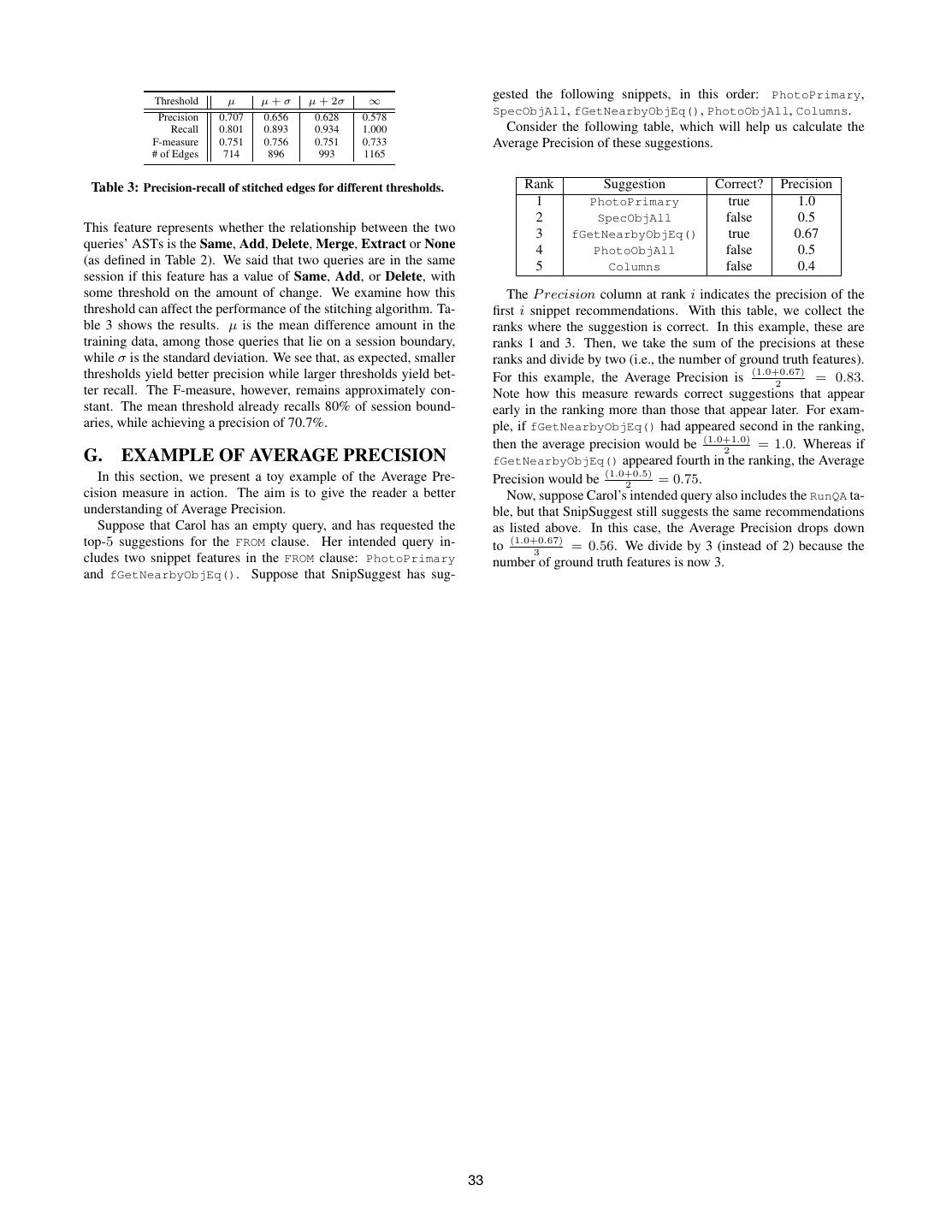 12 . Threshold µ µ+σ µ + 2σ ∞ gested the following snippets, in this order: PhotoPrimary, Precision 0.707 0.656 0.628 0.578 SpecObjAll, fGetNearbyObjEq(), PhotoObjAll, Columns. Recall 0.801 0.893 0.934 1.000 Consider the following table, which will help us calculate the F-measure 0.751 0.756 0.751 0.733 Average Precision of these suggestions. # of Edges 714 896 993 1165 Table 3: Precision-recall of stitched edges for different thresholds. Rank Suggestion Correct? Precision 1 PhotoPrimary true 1.0 2 SpecObjAll false 0.5 This feature represents whether the relationship between the two 3 fGetNearbyObjEq() true 0.67 queries’ ASTs is the Same, Add, Delete, Merge, Extract or None 4 PhotoObjAll false 0.5 (as defined in Table 2). We said that two queries are in the same 5 Columns false 0.4 session if this feature has a value of Same, Add, or Delete, with some threshold on the amount of change. We examine how this The P recision column at rank i indicates the precision of the threshold can affect the performance of the stitching algorithm. Ta- first i snippet recommendations. With this table, we collect the ble 3 shows the results. µ is the mean difference amount in the ranks where the suggestion is correct. In this example, these are training data, among those queries that lie on a session boundary, ranks 1 and 3. Then, we take the sum of the precisions at these while σ is the standard deviation. We see that, as expected, smaller ranks and divide by two (i.e., the number of ground truth features). thresholds yield better precision while larger thresholds yield bet- For this example, the Average Precision is (1.0+0.67) 2 = 0.83. ter recall. The F-measure, however, remains approximately con- Note how this measure rewards correct suggestions that appear stant. The mean threshold already recalls 80% of session bound- early in the ranking more than those that appear later. For exam- aries, while achieving a precision of 70.7%. ple, if fGetNearbyObjEq() had appeared second in the ranking, then the average precision would be (1.0+1.0) 2 = 1.0. Whereas if G. EXAMPLE OF AVERAGE PRECISION fGetNearbyObjEq() appeared fourth in the ranking, the Average In this section, we present a toy example of the Average Pre- Precision would be (1.0+0.5) 2 = 0.75. cision measure in action. The aim is to give the reader a better Now, suppose Carol’s intended query also includes the RunQA ta- understanding of Average Precision. ble, but that SnipSuggest still suggests the same recommendations Suppose that Carol has an empty query, and has requested the as listed above. In this case, the Average Precision drops down top-5 suggestions for the FROM clause. Her intended query in- to (1.0+0.67) = 0.56. We divide by 3 (instead of 2) because the 3 cludes two snippet features in the FROM clause: PhotoPrimary number of ground truth features is now 3. and fGetNearbyObjEq(). Suppose that SnipSuggest has sug- 33
