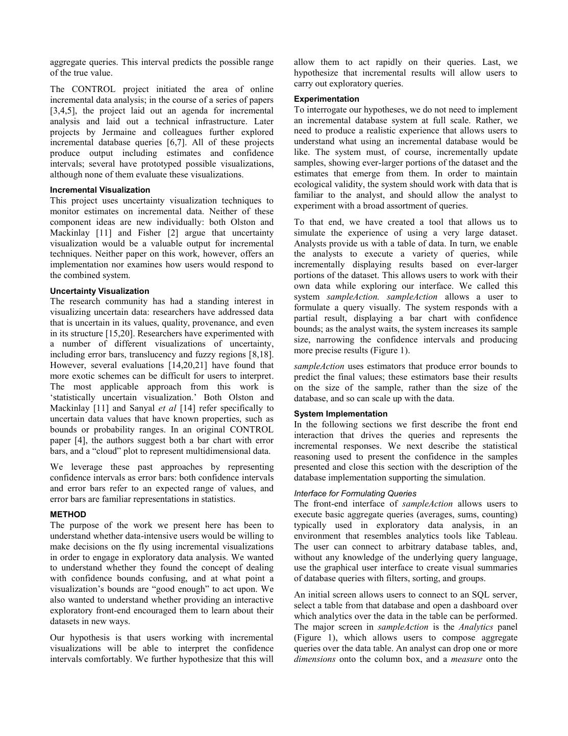 3 .aggregate queries. This interval predicts the possible range allow them to act rapidly on their queries. Last, we of the true value. hypothesize that incremental results will allow users to carry out exploratory queries. The CONTROL project initiated the area of online incremental data analysis; in the course of a series of papers Experimentation [3,4,5], the project laid out an agenda for incremental To interrogate our hypotheses, we do not need to implement analysis and laid out a technical infrastructure. Later an incremental database system at full scale. Rather, we projects by Jermaine and colleagues further explored need to produce a realistic experience that allows users to incremental database queries [6,7]. All of these projects understand what using an incremental database would be produce output including estimates and confidence like. The system must, of course, incrementally update intervals; several have prototyped possible visualizations, samples, showing ever-larger portions of the dataset and the although none of them evaluate these visualizations. estimates that emerge from them. In order to maintain ecological validity, the system should work with data that is Incremental Visualization familiar to the analyst, and should allow the analyst to This project uses uncertainty visualization techniques to experiment with a broad assortment of queries. monitor estimates on incremental data. Neither of these component ideas are new individually: both Olston and To that end, we have created a tool that allows us to Mackinlay [11] and Fisher [2] argue that uncertainty simulate the experience of using a very large dataset. visualization would be a valuable output for incremental Analysts provide us with a table of data. In turn, we enable techniques. Neither paper on this work, however, offers an the analysts to execute a variety of queries, while implementation nor examines how users would respond to incrementally displaying results based on ever-larger the combined system. portions of the dataset. This allows users to work with their own data while exploring our interface. We called this Uncertainty Visualization The research community has had a standing interest in system sampleAction. sampleAction allows a user to visualizing uncertain data: researchers have addressed data formulate a query visually. The system responds with a that is uncertain in its values, quality, provenance, and even partial result, displaying a bar chart with confidence in its structure [15,20]. Researchers have experimented with bounds; as the analyst waits, the system increases its sample a number of different visualizations of uncertainty, size, narrowing the confidence intervals and producing including error bars, translucency and fuzzy regions [8,18]. more precise results (Figure 1). However, several evaluations [14,20,21] have found that sampleAction uses estimators that produce error bounds to more exotic schemes can be difficult for users to interpret. predict the final values; these estimators base their results The most applicable approach from this work is on the size of the sample, rather than the size of the ‘statistically uncertain visualization.’ Both Olston and database, and so can scale up with the data. Mackinlay [11] and Sanyal et al [14] refer specifically to System Implementation uncertain data values that have known properties, such as In the following sections we first describe the front end bounds or probability ranges. In an original CONTROL interaction that drives the queries and represents the paper [4], the authors suggest both a bar chart with error incremental responses. We next describe the statistical bars, and a “cloud” plot to represent multidimensional data. reasoning used to present the confidence in the samples We leverage these past approaches by representing presented and close this section with the description of the confidence intervals as error bars: both confidence intervals database implementation supporting the simulation. and error bars refer to an expected range of values, and Interface for Formulating Queries error bars are familiar representations in statistics. The front-end interface of sampleAction allows users to METHOD execute basic aggregate queries (averages, sums, counting) The purpose of the work we present here has been to typically used in exploratory data analysis, in an understand whether data-intensive users would be willing to environment that resembles analytics tools like Tableau. make decisions on the fly using incremental visualizations The user can connect to arbitrary database tables, and, in order to engage in exploratory data analysis. We wanted without any knowledge of the underlying query language, to understand whether they found the concept of dealing use the graphical user interface to create visual summaries with confidence bounds confusing, and at what point a of database queries with filters, sorting, and groups. visualization’s bounds are “good enough” to act upon. We An initial screen allows users to connect to an SQL server, also wanted to understand whether providing an interactive select a table from that database and open a dashboard over exploratory front-end encouraged them to learn about their which analytics over the data in the table can be performed. datasets in new ways. The major screen in sampleAction is the Analytics panel Our hypothesis is that users working with incremental (Figure 1), which allows users to compose aggregate visualizations will be able to interpret the confidence queries over the data table. An analyst can drop one or more intervals comfortably. We further hypothesize that this will dimensions onto the column box, and a measure onto the