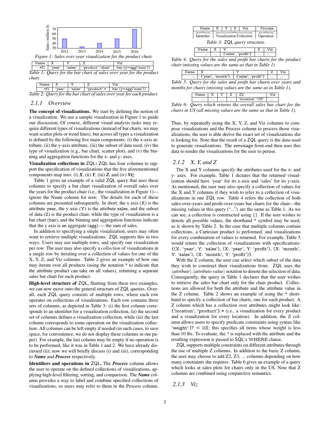 3 . Sales (million $) 70 Name X Y Z Viz Process 60 Identifier Visualization Collection Operation 50 40 Table 3: ZQL query structure. 30 Name X Y Z Viz 2012 2013 2014 2015 2016 ... ... {‘sales’, ‘profit’} ... ... Figure 1: Sales over year visualization for the product chair. Table 4: Query for the sales and profit bar charts for the product Name X Y Z Viz *f1 ‘year’ ‘sales’ ‘product’.‘chair’ bar.(y=agg(‘sum’)) chair (missing values are the same as that in Table 1) Table 1: Query for the bar chart of sales over year for the product Name X Y Z Viz chair. ... {‘year’, ‘month’} {‘sales’, ‘profit’} ... ... Name X Y Z Viz Table 5: Query for the sales and profit bar charts over years and *f1 ‘year’ ‘sales’ ‘product’.* bar.(y=agg(‘sum’)) months for chairs (missing values are the same as in Table 1). Table 2: Query for the bar chart of sales over year for each product. Name X Y Z Z2 Viz ... ... ... ... ‘location’.‘US’ ... 2.1.1 Overview Table 6: Query which returns the overall sales bar chart for the The concept of visualizations. We start by defining the notion of chairs in US (all missing values are the same as that in Table 1). a visualization. We use a sample visualization in Figure 1 to guide our discussion, Of course, different visual analysis tasks may re- Thus, by repeatedly using the X, Y, Z, and Viz columns to com- quire different types of visualizations (instead of bar charts, we may pose visualizations and the Process column to process those visu- want scatter plots or trend lines), but across all types a visualization alizations, the user is able derive the exact set of visualizations she is defined by the following five main components: (i) the x-axis at- is looking for. Note that the result of a ZQL query is the data used tribute, (ii) the y-axis attribute, (iii) the subset of data used, (iv) the to generate visualizations. The zenvisage front-end then uses this type of visualization (e.g., bar chart, scatter plot), and (v) the bin- data to render the visualizations for the user to peruse. ning and aggregation functions for the x- and y- axes. Visualization collections in ZQL: ZQL has four columns to sup- 2.1.2 X, Y, and Z port the specification of visualizations that the five aforementioned The X and Y columns specify the attributes used for the x- and components map into: (i) X, (ii) Y, (iii) Z, and (iv) Viz. y- axes. For example, Table 1 dictates that the returned visual- Table 1 gives an example of a valid ZQL query that uses these ization should have ‘year’ for its x-axis and ‘sales’ for its y-axis. columns to specify a bar chart visualization of overall sales over As mentioned, the user may also specify a collection of values for the years for the product chair (i.e., the visualization in Figure 1)— the X and Y columns if they wish to refer to a collection of visu- ignore the Name column for now. The details for each of these alizations in one ZQL row. Table 4 refers the collection of both columns are presented subsequently. In short, the x axis (X) is the sales-over-years and profit-over-years bar charts for the chair—the attribute year, the y axis (Y) is the attribute sales, and the subset missing values in this query (“...”) are the same as Table 1. As we of data (Z) is the product chair, while the type of visualization is a can see, a collection is constructed using {}. If the user wishes to bar chart (bar), and the binning and aggregation functions indicate denote all possible values, the shorthand * symbol may be used, that the y axis is an aggregate (agg) — the sum of sales. as is shown by Table 2. In the case that multiple columns contain In addition to specifying a single visualization, users may often collections, a Cartesian product is performed, and visualizations want to retrieve multiple visualizations. ZQL supports this in two for every combination of values is returned. For example, Table 5 ways. Users may use multiple rows, and specify one visualization would return the collection of visualizations with specifications: per row. The user may also specify a collection of visualizations in {(X: ‘year’, Y: ‘sales’), (X: ‘year’, Y: ‘profit’), (X: ‘month’, a single row by iterating over a collection of values for one of the Y: ‘sales’), (X: ‘month’, Y: ‘profit’)}. X, Y, Z, and Viz columns. Table 2 gives an example of how one With the Z column, the user can select which subset of the data may iterate over all products (using the notation * to indicate that they wish to construct their visualizations from. ZQL uses the the attribute product can take on all values), returning a separate attribute . attribute-value notation to denote the selection of data. sales bar chart for each product. Consequently, the query in Table 1 declares that the user wishes High-level structure of ZQL. Starting from these two examples, to retrieve the sales bar chart only for the chair product. Collec- we can now move onto the general structure of ZQL queries. Over- tions are allowed for both the attribute and the attribute value in all, each ZQL query consists of multiple rows, where each row the Z column. Table 2 shows an example of using the * short- operates on collections of visualizations. Each row contains three hand to specify a collection of bar charts, one for each product. A sets of columns, as depicted in Table 3: (i) the first column corre- Z column which has a collection over attributes might look like: sponds to an identifier for a visualization collection, (ii) the second {‘location’, ‘product’}.* (i.e., a visualization for every product set of columns defines a visualization collection, while (iii) the last and a visualization for every location). In addition, the Z col- column corresponds to some operation on the visualization collec- umn allows users to specify predicate constraints using syntax like tion. All columns can be left empty if needed (i