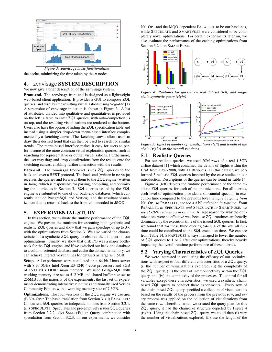 8 . N O -O PT and the MQO-dependent PARALLEL to be our baselines, while S PECULATE and S MART F USE were considered to be com- ZQL Query Specification pletely novel optimizations. For certain experiments later on, we also evaluate the performance of the caching optimizations from Attribute Section 3.2.4 on S MART F USE. Spec. 18 no-opt 16 parallel Result Visualizations 14 speculate smartfuse 12 f1 p1 f2 p2 10 time (s) Figure 3: zenvisage basic functionalities 8 6 the cache, minimizing the time taken by the p-nodes. 4 p4 f4 p3 f3 2 4. zenvisage SYSTEM DESCRIPTION 0 Q1 Q2 Q3 We now give a brief description of the zenvisage system. Queries Figure 4: Runtimes for queries on real dataset (left) and single Front-end. The zenvisage front-end is designed as a lightweight chain synthetic query (right) web-based client application. It provides a GUI to compose ZQL 102 16 queries, and displays the resulting visualizations using Vega-lite [17]. noopt, parallel no-opt, parallel 14 speculate A screenshot of zenvisage in action is shown in Figure 3. A list speculate smartfuse of attributes, divided into qualitative and quantitative, is provided smartfuse 12 10 time (s) time (s) on the left; a table to enter ZQL queries, with auto-completion, is 101 on top, and the resulting visualizations are rendered at the bottom. 8 Users also have the option of hiding the ZQL specification table and 6 instead using a simpler drop-down menu-based interface comple- 4 mented by a sketching canvas. The sketching canvas allows users to 100 1 10 102 103 104 21 2 3 4 5 6 7 8 9 10 draw their desired trend that can then be used to search for similar #visualizations #c-nodes and p-nodes in one chain trends. The menu-based interface makes it easy for users to per- Figure 5: Effect of number of visualizations (left) and length of the form some of the more common visual exploration queries, such as chain (right) on the overall runtimes. searching for representative or outlier visualizations. Furthermore, 5.1 Realistic Queries the user may drag-and-drop visualizations from the results onto the For our realistic queries, we used 20M rows of a real 1.5GB sketching canvas, enabling further interaction with the results. airline dataset [1] which contained the details of flights within the Back-end. The zenvisage front-end issues ZQL queries to the USA from 1987-2008, with 11 attributes. On this dataset, we per- back-end over a REST protocol. The back-end (written in node.js) formed 3 realistic ZQL queries inspired by the case studies in our receives the queries and forwards them to the ZQL engine (written introduction. Descriptions of the queries can be found in Table 14. in Java), which is responsible for parsing, compiling, and optimiz- Figure 4 (left) depicts the runtime performance of the three re- ing the queries as in Section 3. SQL queries issued by the ZQL alistic ZQL queries, for each of the optimizations. For all queries, engine are submitted to one of our back-end databases (which cur- each level of optimization provided a substantial speedup in exe- rently include PostgreSQL and Vertica), and the resultant visual- cution time compared to the previous level. Simply by going from ization data is returned back to the front-end encoded in JSON. N O -O PT to PARALLEL, we see a 45% reduction in runtime. From PARALLEL to S PECULATE and S PECULATE to S MART F USE, we 5. EXPERIMENTAL STUDY see 15-20% reductions in runtime. A large reason for why the opti- In this section, we evaluate the runtime performance of the ZQL mizations were so effective was because ZQL runtimes are heavily engine. We present the runtimes for executing both synthetic and dominated by the execution time of the issued SQL queries. In fact, realistic ZQL queries and show that we gain speedups of up to 3× we found that for these three queries, 94-98% of the overall run- with the optimizations from Section 3. We also varied the charac- time could be contributed to the SQL execution time. We can see teristics of a synthetic ZQL query to observe their impact on our from Table 14, S MART F USE always managed to lower the number optimizations. Finally, we show that disk I/O was a major bottle- of SQL queries to 1 or 2 after our optimizations, thereby heavily neck for the ZQL engine, and if we switched our back-end database impacting the overall runtime performance of these queries. to a column-oriented database and cache the dataset in memory, we 5.2 Varying Characteristics of ZQL Queries can achieve interactive run times for datasets as large as 1.5GB. We were interested in evaluating the efficacy of our optimiza- Setup. All experiments were conducted on a 64-bit Linux server tions with respect to four different characteristics of a ZQL query: with 8 3.40GHz Intel Xeon E3-1240 4-core processors and 8GB (i) the number of visualizations explored, (ii) the complexity of of 1600 MHz DDR3 main memory. We used PostgreSQL with the ZQL query, (iii) the level of interconnectivity within the ZQL working memory size set to 512 MB and shared buffer size set to query, and (iv) the complexity of the processes. To control for all 256MB for the majority of the experiments; the last set of experi- variables except these characteristics, we used a synthetic chain- ments demonstrating interactive run times additionally used Vertica based ZQL query to conduct these experiments. Every row of Community Edition with a working memory size of 7.5GB. the chain-based ZQL query specified a collection of visualizations Optimizations. The four versions of the ZQL engine we use are: based on the results of the process from the previous row, and ev- (i) N O -O PT: The basic translation from Section 3. (ii) PARALLEL: ery process was applied on the collection of visualizations from Concurrent SQL queries for independent nodes from Section 3.2.1. the same row. Therefore, when we created the query plan for this (iii) S PECULATE: Speculates and pre-emptively issues SQL queries ZQL query, it had the 