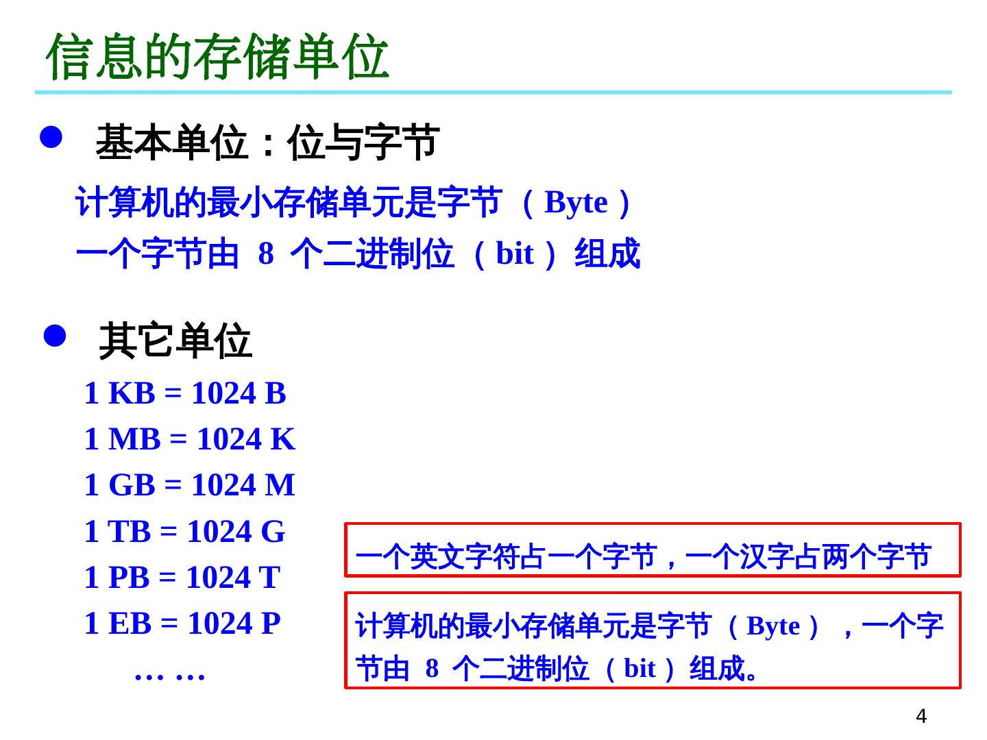 4 .4 信息的存储单位 基本单位:位与字节 计算机的最小存储单元是字节( Byte ) 一个字节由 8 个二进制位( bit )组成 其它单位 1 KB = 1024 B 1 MB = 1024 K 1 GB = 1024 M 1 TB = 1024 G 1 PB = 1024 T 1 EB = 1024 P … … 一个英文字符占一个字节,一个汉字占两个字节 计算机 的最小存储单元是字节( Byte ),一个字节由 8 个二进制位( bit )组成。