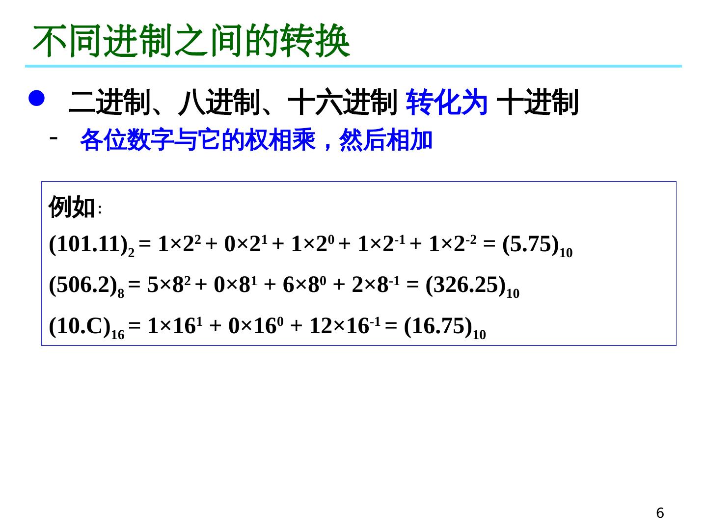 6 .6 不同进制之间的转换 二进制、八进制、十六进制 转化为 十进制 各位数字与它的权相乘,然后相加 例如 : (101.11) 2 = 1×2 2 + 0×2 1 + 1×2 0 + 1×2 -1 + 1×2 -2 = (5.75) 10 (506.2) 8 = 5×8 2 + 0×8 1 + 6×8 0 + 2×8 -1 = (326.25) 10 (10.C) 16 = 1 × 16 1 + 0× 16 0 + 12×16 -1 = (16.75) 10