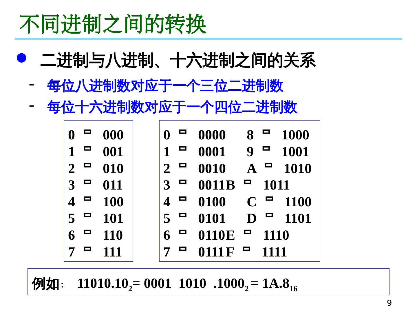 9 .9 不同进制之间的转换 二进制与八进制、十六进制之间的关系 每位八进制数对应于一个三位二进制数 每位十六进制数对应于一个四位二进制数 0 000 1 001 2 010 3 011 4 100 5 101 6 110 7 111 0 0000 8 1000 1 0001 9 1001 2 0010 A 1010 3 0011 B 1011 4 0100 C 1100 5 0101 D 1101 6 0110 E 1110 7 0111 F 1111 例如 : 11010.10 2 = 0001 1010 .1000 2 = 1A.8 16